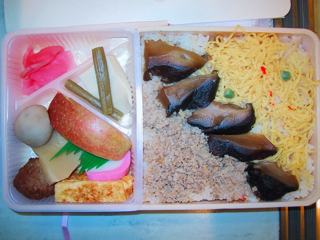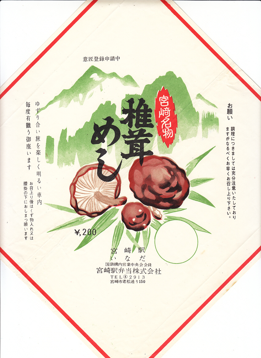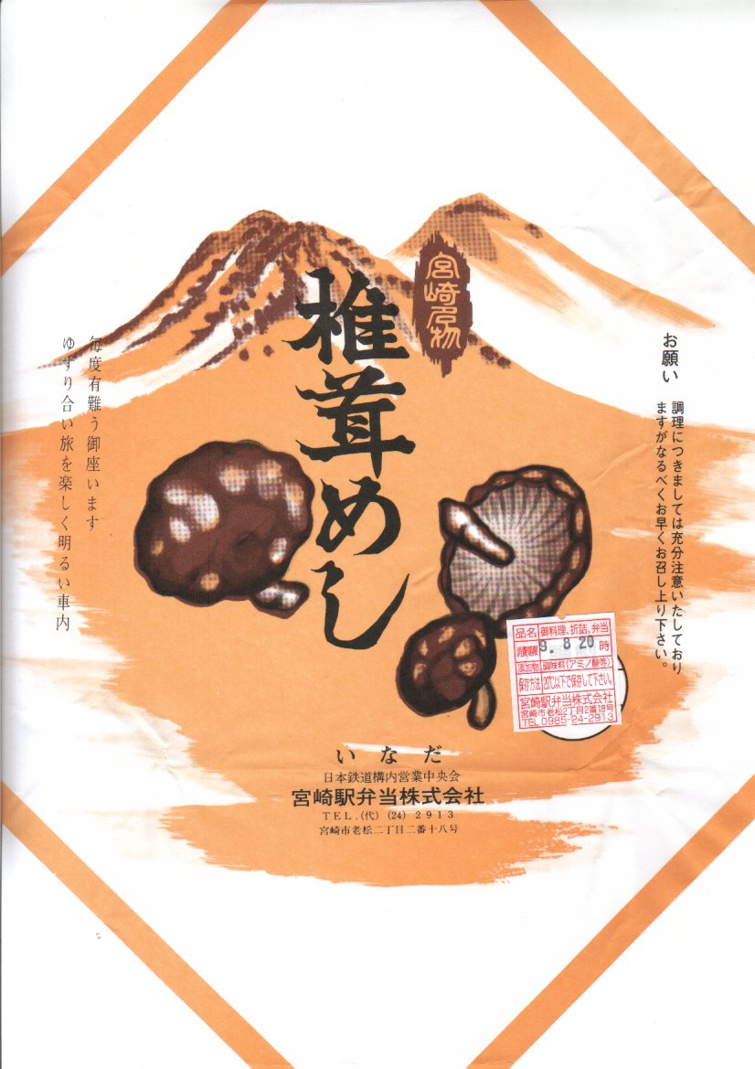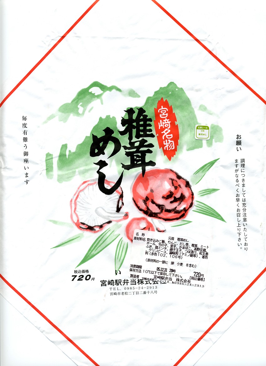 2003(平成15)年1月12日に購入した、宮崎駅弁の掛紙。京王百貨店の駅弁大会で購入。ここでの輸送販売では不思議なことに、掛紙が「上等椎茸めし」、中身と価格が「椎茸めし」で売られた。