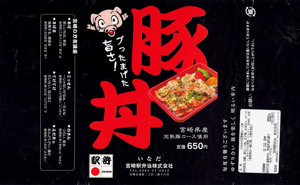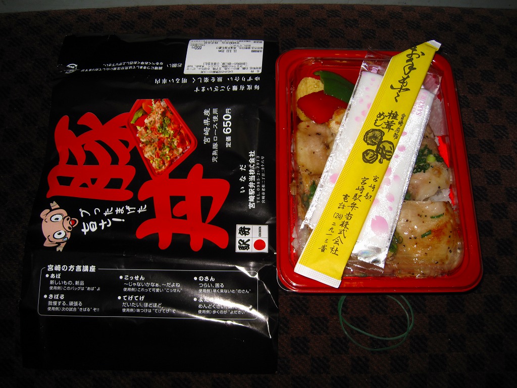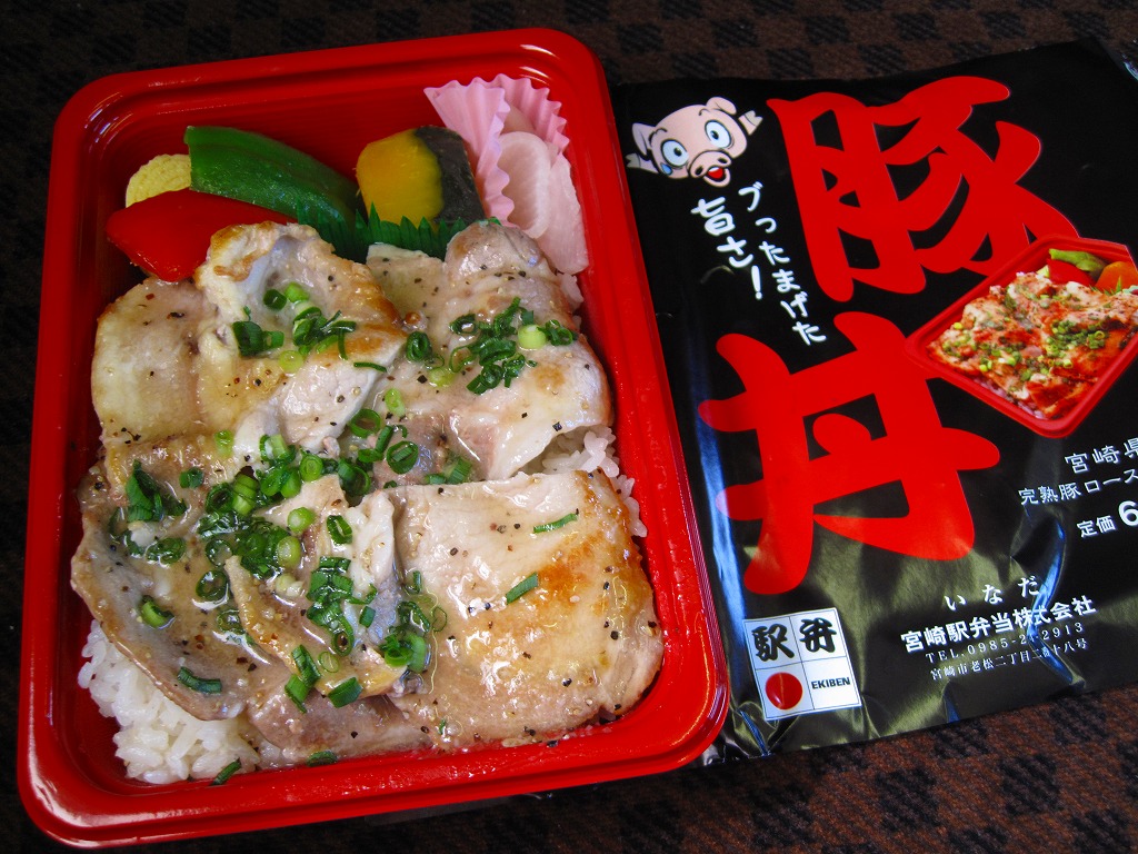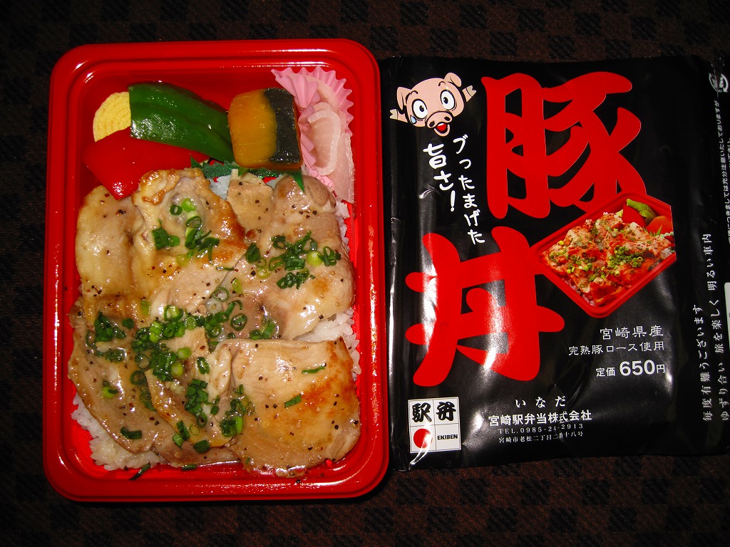 2009(平成21)年頃の登場か。食品表示ラベルでの名前は「ひむかの完熟豚ロース丼」。プラ製の赤い惣菜容器に透明なふたをして、駅弁の名前と中身の写真を赤く記した黒い掛紙を巻く。中身は白御飯の上に宮崎県産豚のロースを塩ダレで焼いて貼り、玉子焼、かぼちゃ、ピーマン、大根漬を添えるもの。