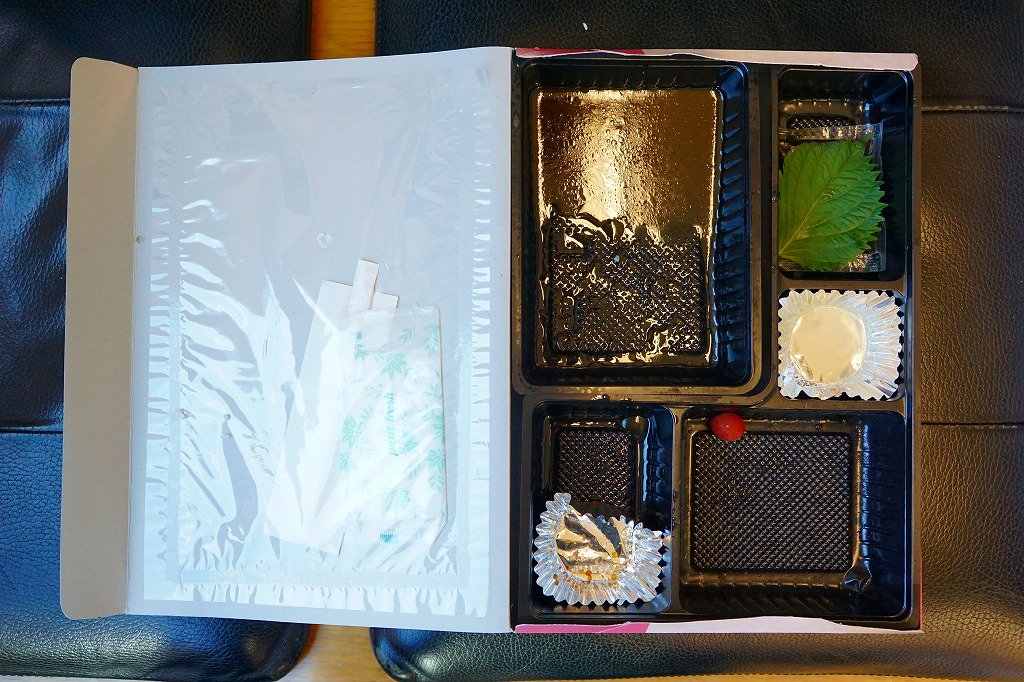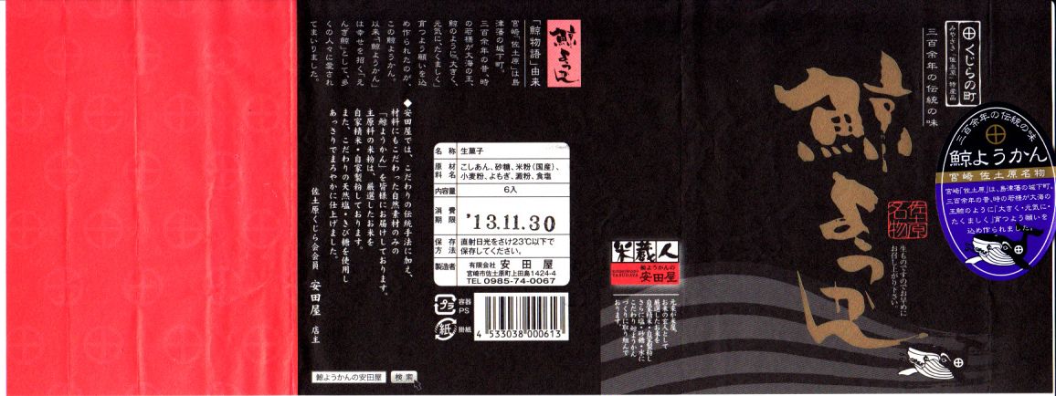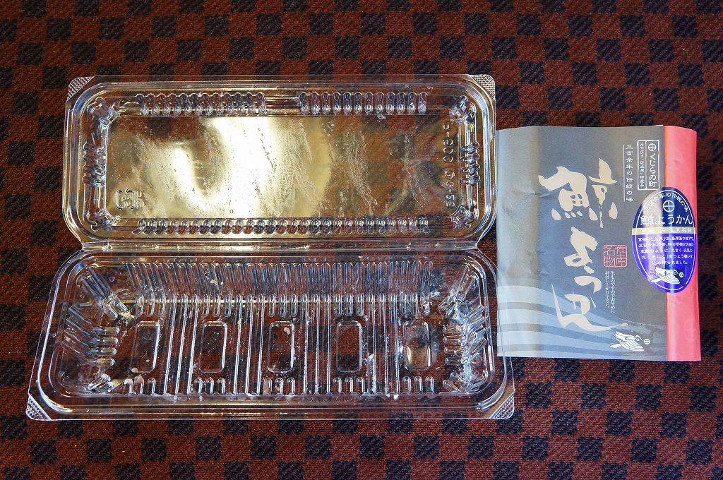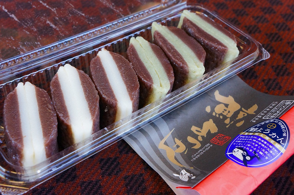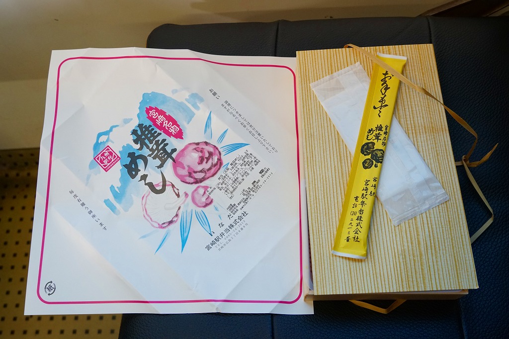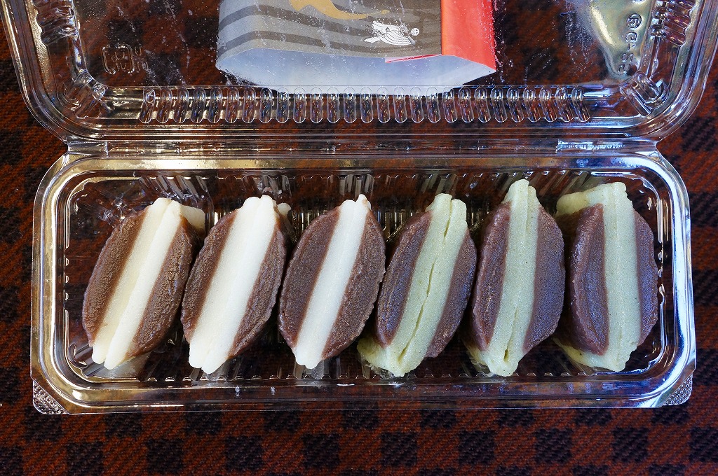 宮崎駅の駅弁売店で駅弁とともに売られていた、地元限定の銘菓。かつて薩摩藩の支藩とされる佐土原藩の城下町であった、宮崎県佐土原で元禄時代から300年以上の歴史を刻むという。米粉の練り物をあんこで挟む。買ったものは、白が3個とよもぎ入りの緑が3個。あんこの部分も型くずれしない弾力性があり、ういろうのような風味と食感で、それでいてそれほど甘くなく、鉄道旅行での軽食代わりにもなると思えた。今時のスイーツと違い、日持ちがまったくしないようで、ここに来なければ味わえない模様。