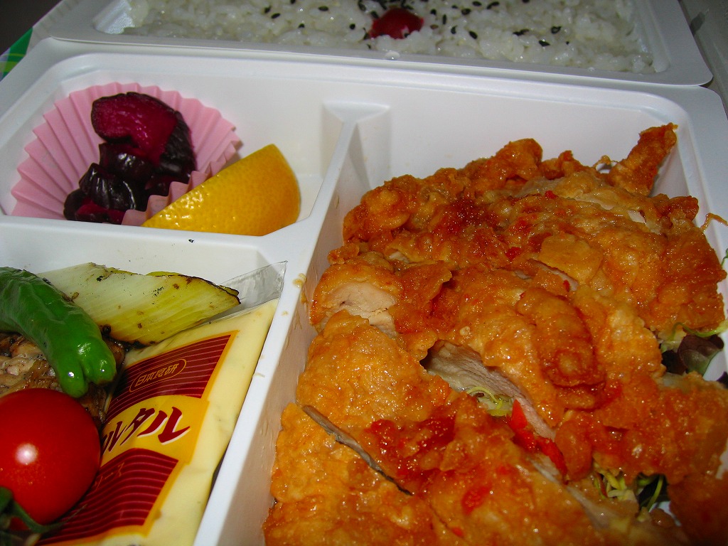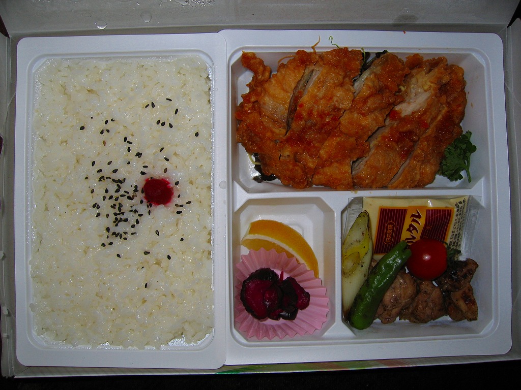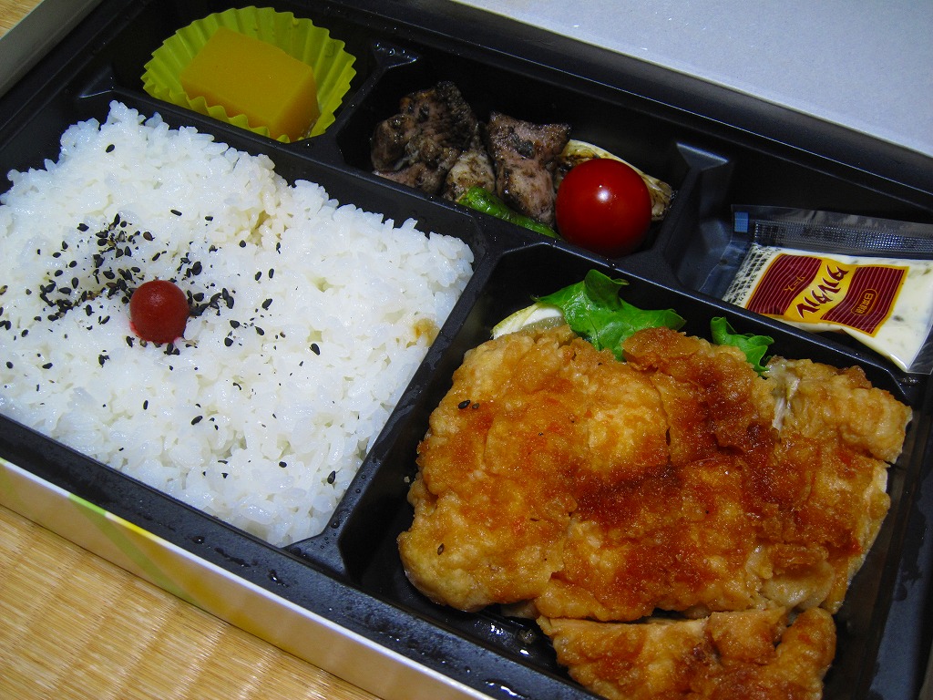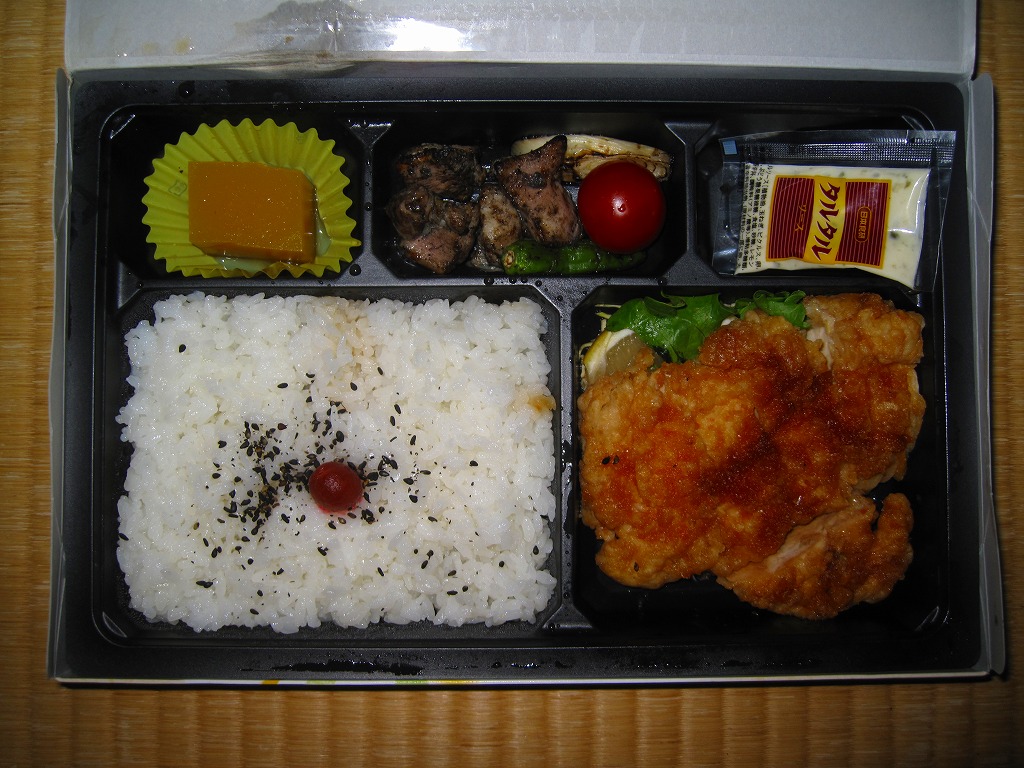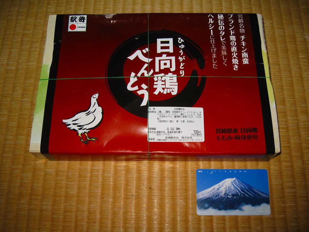 2002(平成14)年12月の発売か。市販の仕出し弁当向け容器のプラ製トレーに、日の丸御飯、チキン南蛮と千切りキャベツとレモン、鶏の直火焼とミニトマトとししとう、タルタルソース、日向夏ゼリーを詰める。つまり、チキン南蛮弁当そのもの。チキン南蛮は昭和30年代の宮崎県や延岡市といわれるそうなので、このような駅弁が宮崎駅で買えるのはよい姿。あまり長く持ち歩くと、べちゃべちゃになり良くないかも。価格は2011年の購入時で720円、2014年時点で760円、2020年時点で900円。2021年で終売か。