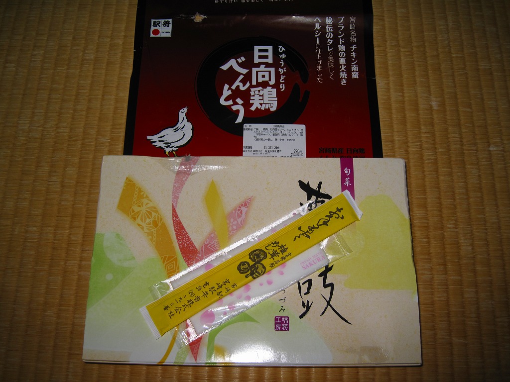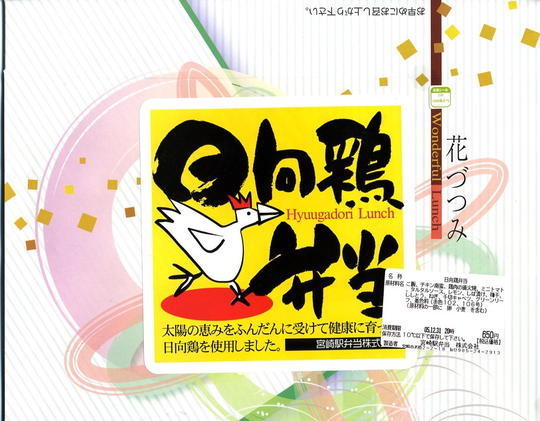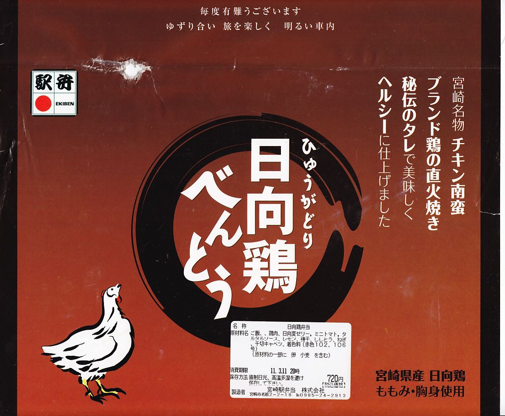 上記の駅弁「日向鶏べんとう」の、2002(平成14)年時点での姿。中身はおおむね同じだが、明るい色の市販容器に黄色い駅弁名シールを貼り、見た目が軽快だった。チキン南蛮のサクッとした柔らかさと、焼き鳥の身の締まりは、千円以上の駅弁に入れてもおかしくない。当時の宮崎駅弁で最も安い商品で、2005年「九州の駅弁ランキング第2弾」の対象駅弁50種の中でも熊本駅「あさりめし」に次ぐ安さだが、一番うまいという評価もある、爪を隠した能ある鷹。