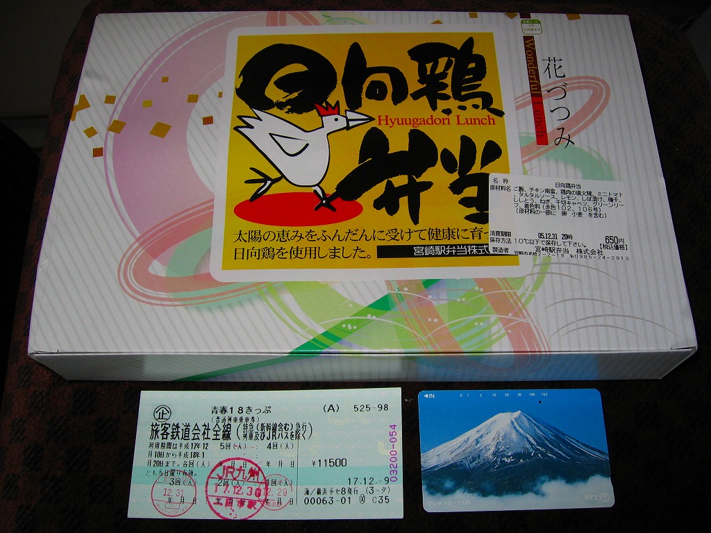 2005(平成17)年12月31日に購入した、宮崎駅弁の掛紙。掛紙の絵柄も中身も、上記の2022年のものと、おおむね変わらない。JR九州の駅弁キャンペーン「第2弾、「九州の駅弁」ランキング!」でのみ実施されたシールラリーの応募シールが貼られていた。