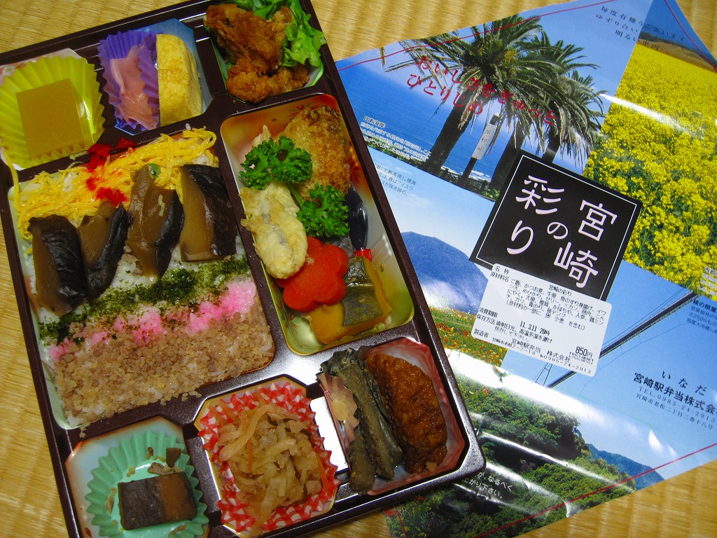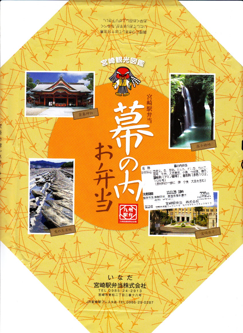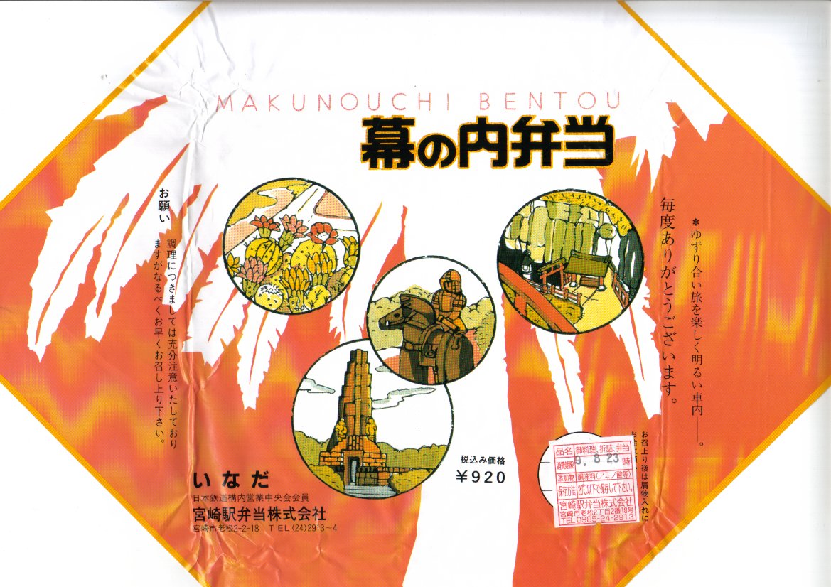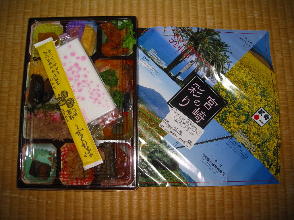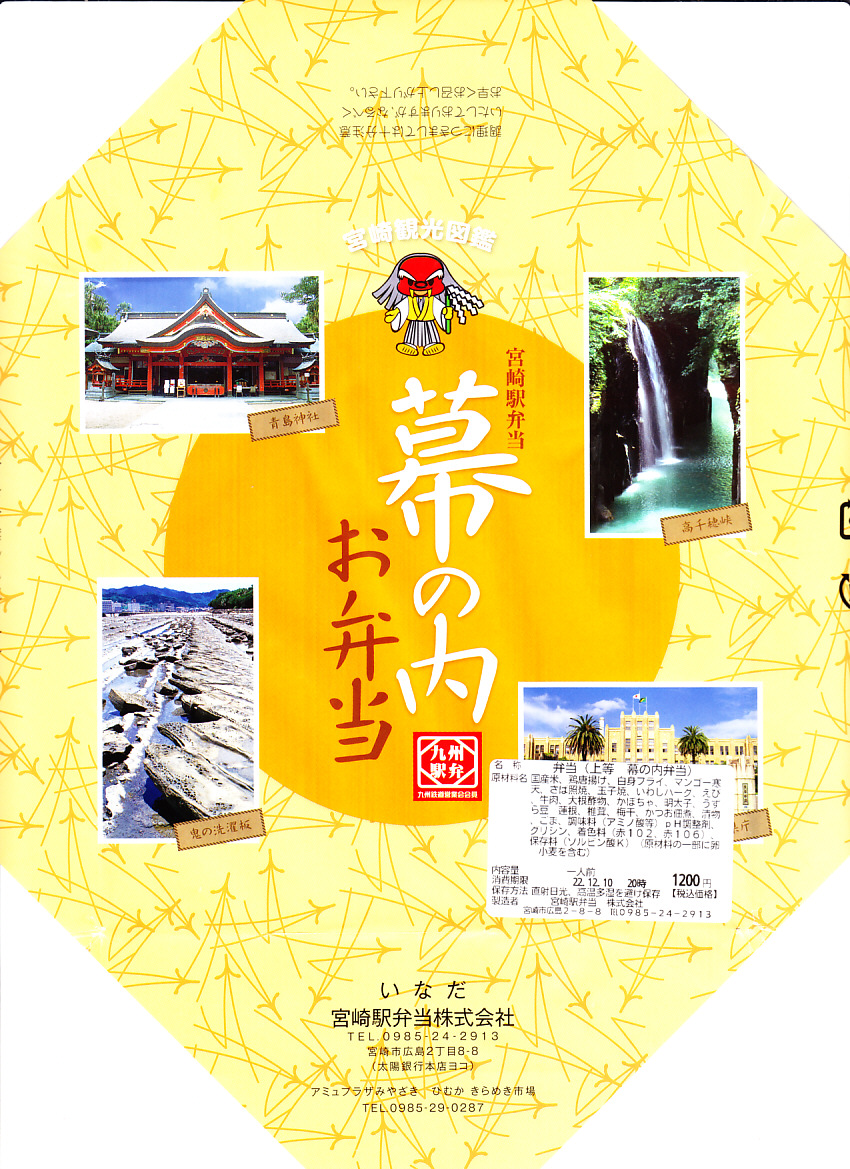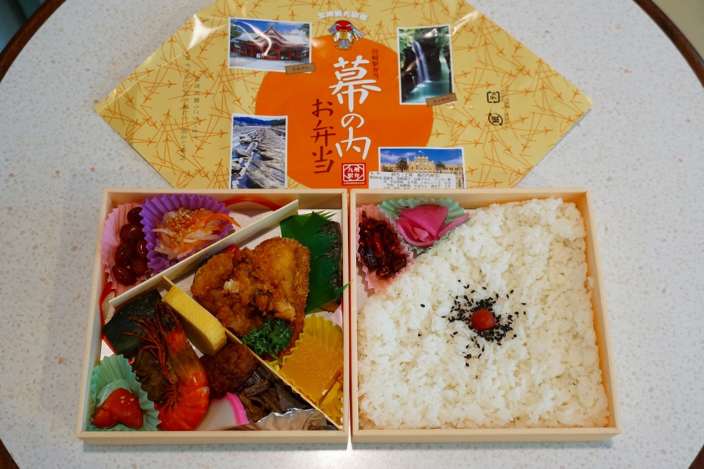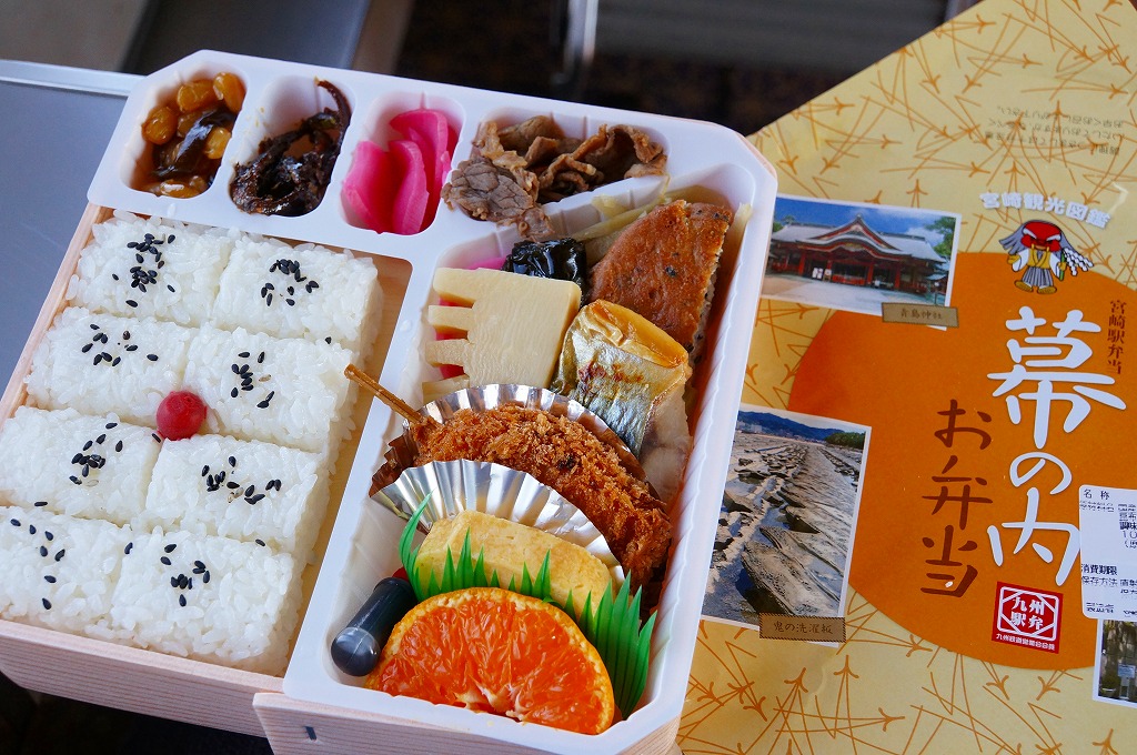 宮崎駅で並等の幕の内駅弁。同じ名前で並等と上等がある駅弁は、20世紀には当たり前であったが、21世紀にはほとんどみられなくなった。掛紙は「宮崎観光図鑑」と銘打ち、青島神社、鬼の洗濯岩、宮崎県庁、高千穂峡の写真を使う。正方形の容器に日の丸御飯を詰め、L字型をしたおかずのトレーをはめ、これに串カツ、タケノコ、焼さば、ささがきごぼう、がんも、牛肉煮、玉子焼、昆布巻、かまぼこ、マンゴー寒天、大根桜漬、小女子(コウナゴ)、煮豆を詰める。新しくもなく古くもなく、実用的なお弁当。価格は2013年時点で720円、2015年時点で760円、2023年時点で850円、2025年11月から950円。