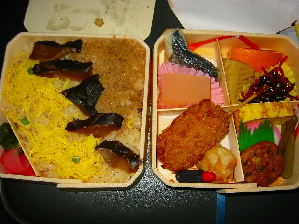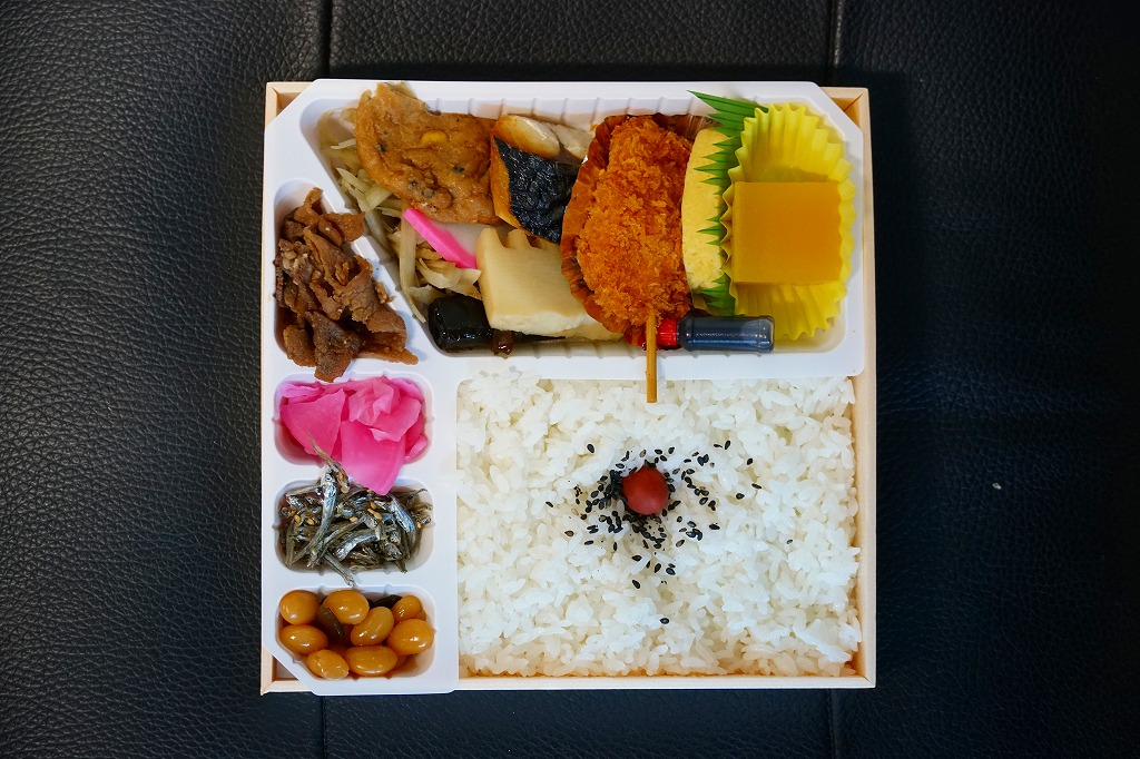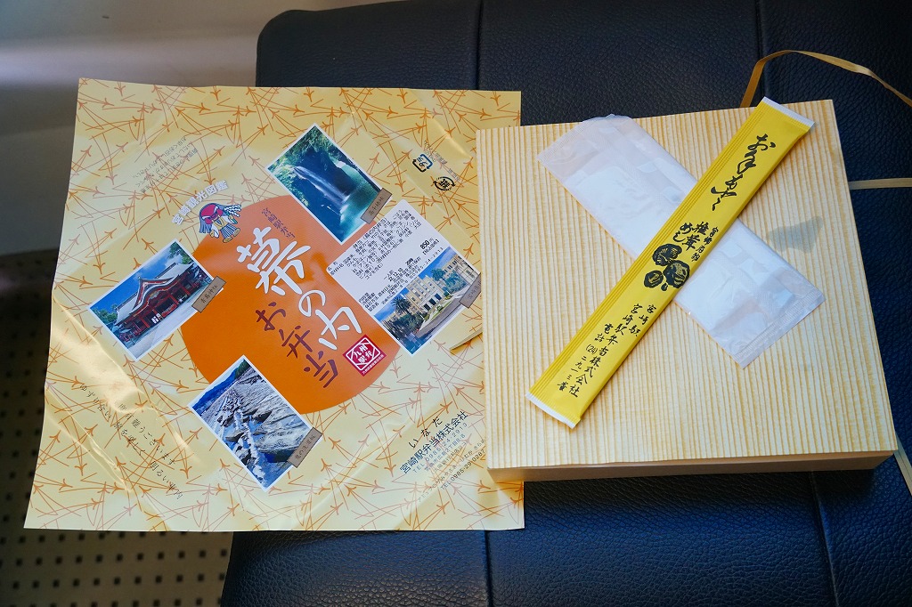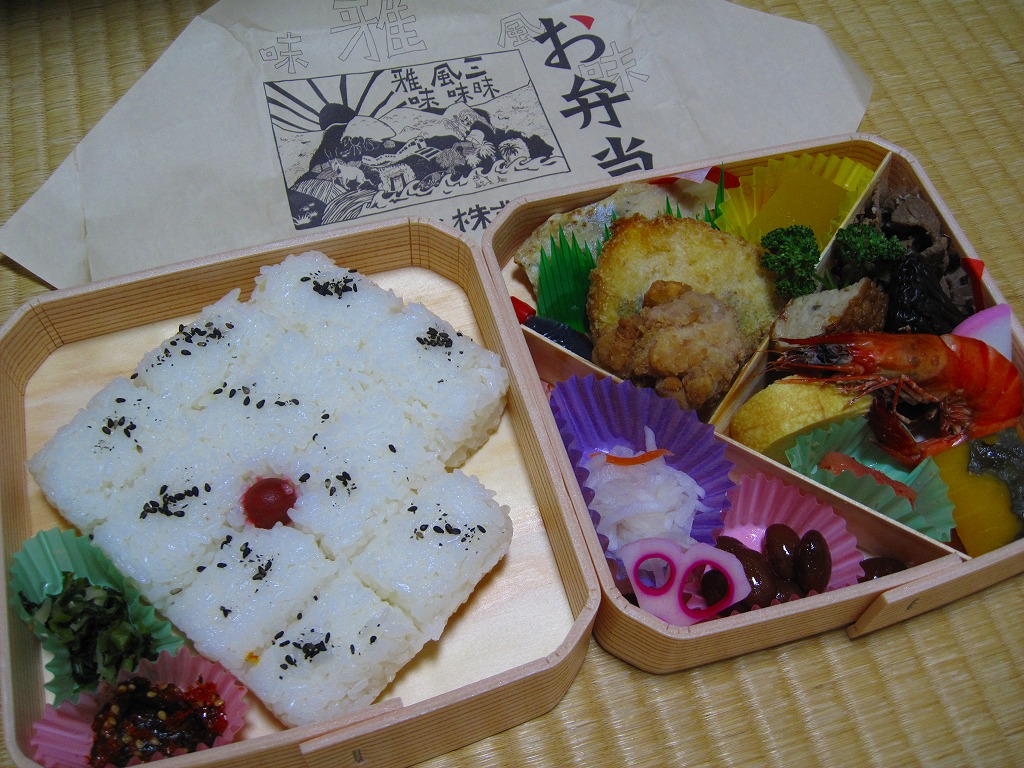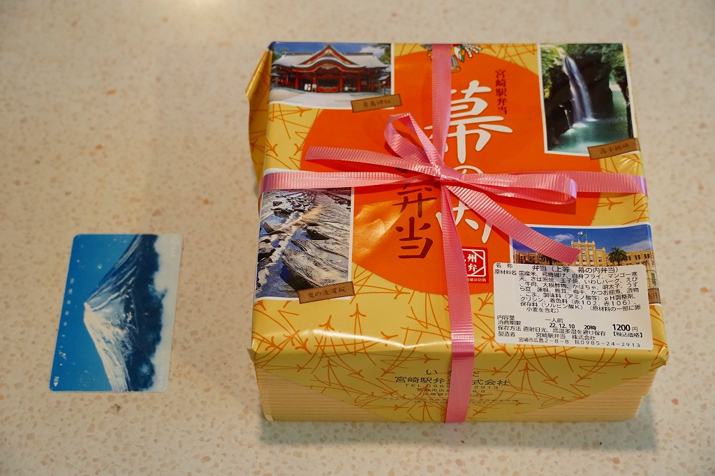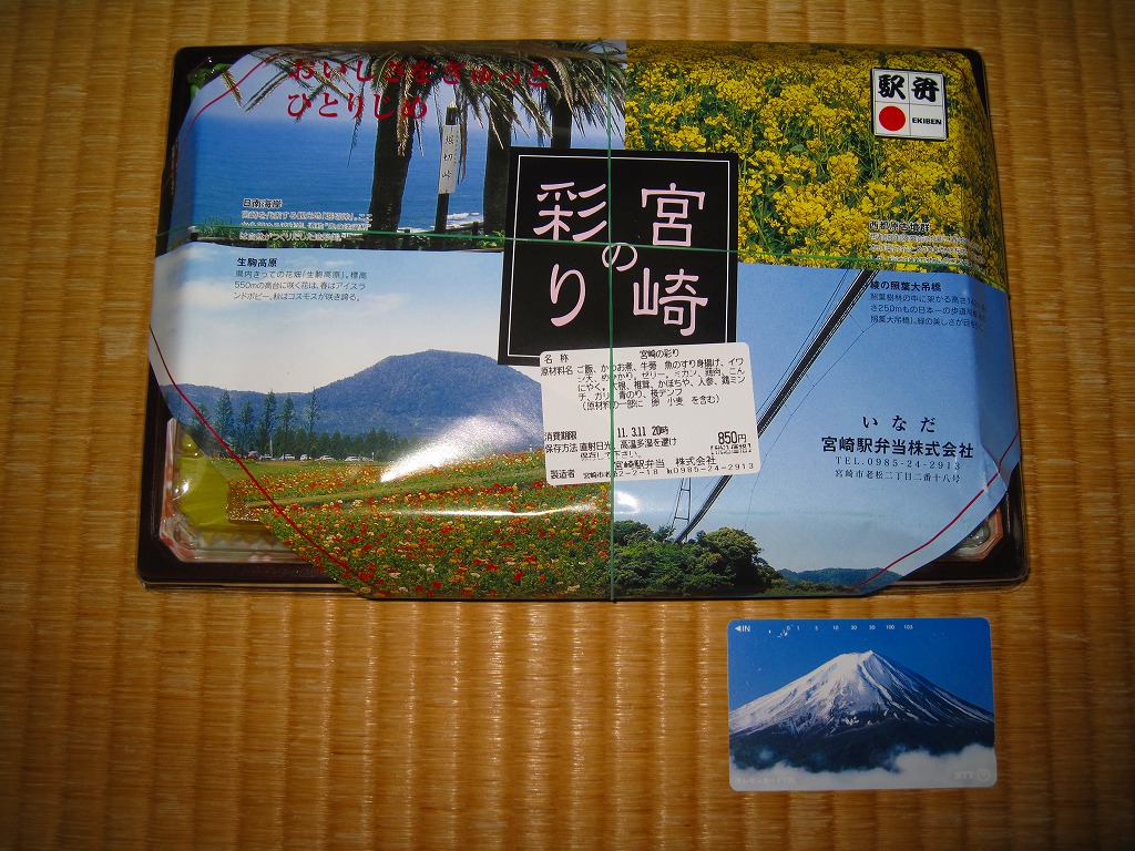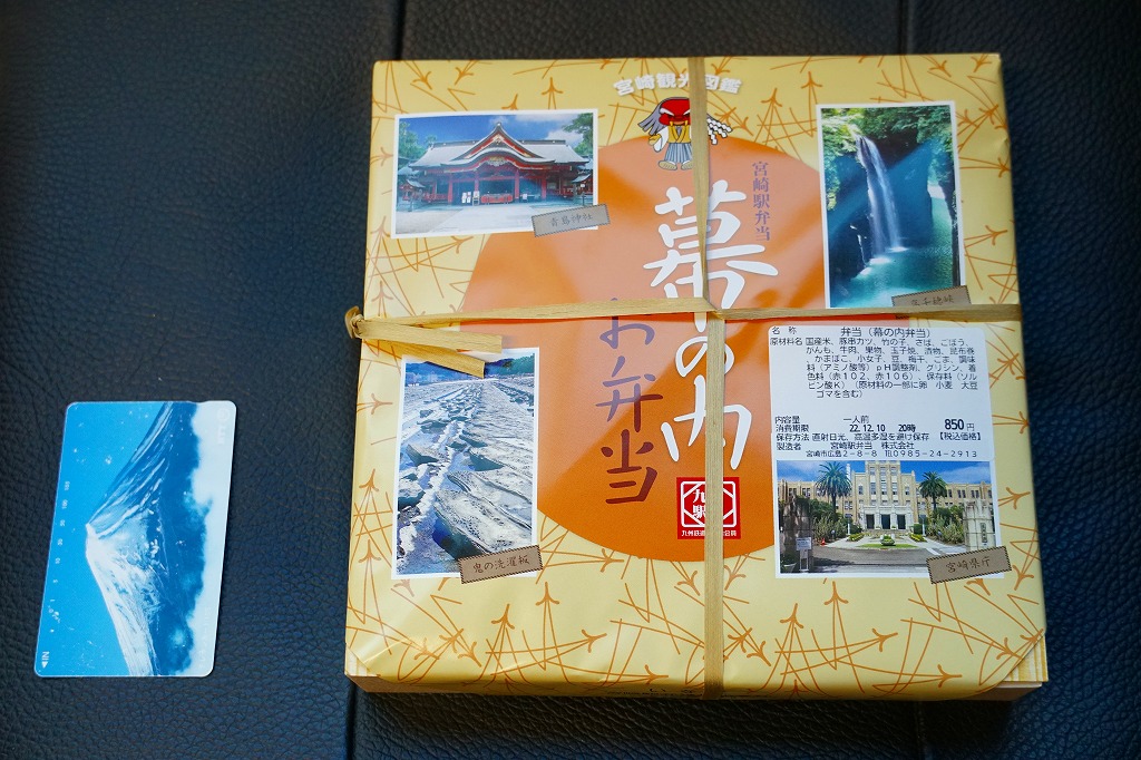 宮崎駅で並等の幕の内駅弁。同じ名前で並等と上等がある駅弁は、20世紀には当たり前であったが、21世紀にはほとんどみられなくなった。掛紙は「宮崎観光図鑑」と銘打ち、青島神社、鬼の洗濯岩、宮崎県庁、高千穂峡の写真を使う。正方形の容器に日の丸御飯を詰め、L字型をしたおかずのトレーをはめ、これに串カツ、タケノコ、焼さば、ささがきごぼう、がんも、牛肉煮、玉子焼、昆布巻、かまぼこ、マンゴー寒天、大根桜漬、小女子(コウナゴ)、煮豆を詰める。新しくもなく古くもなく、実用的なお弁当。価格は2013年時点で720円、2015年時点で760円、2023年時点で850円、2025年11月から950円。
