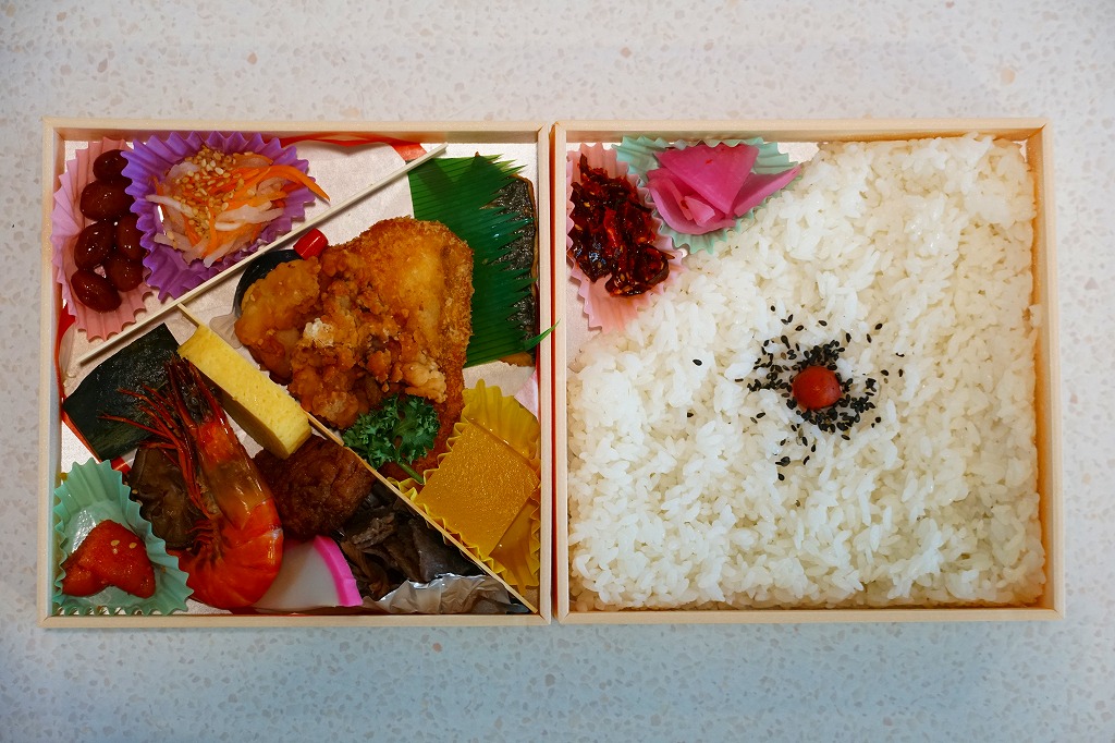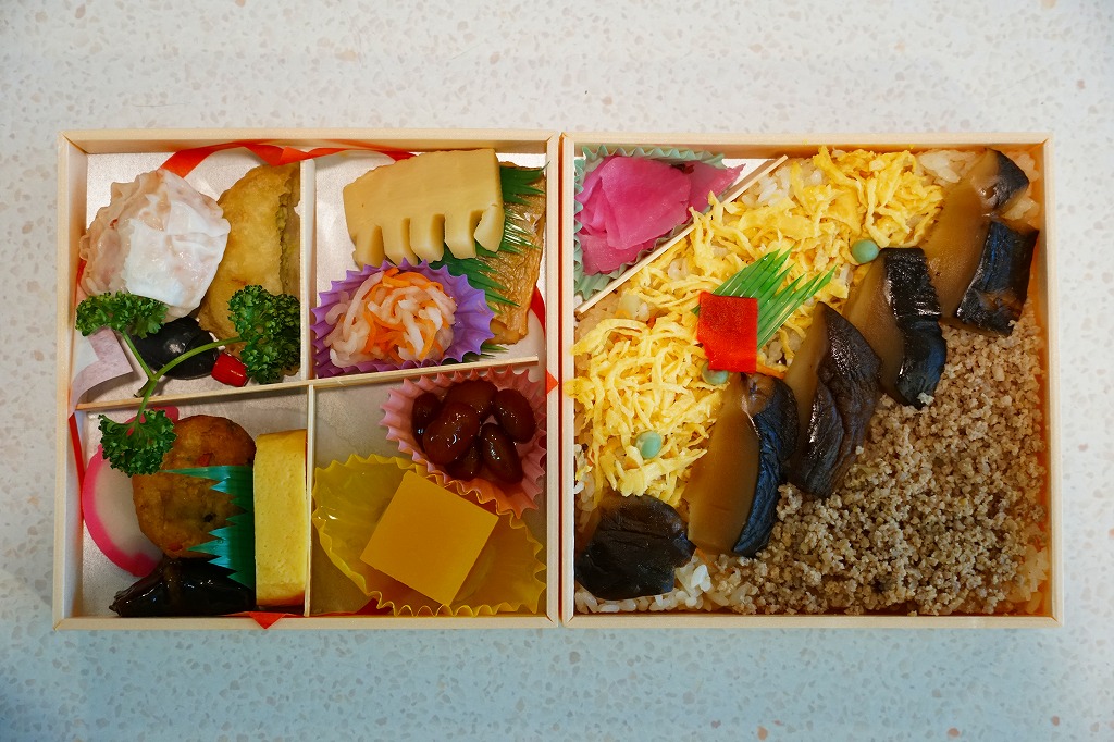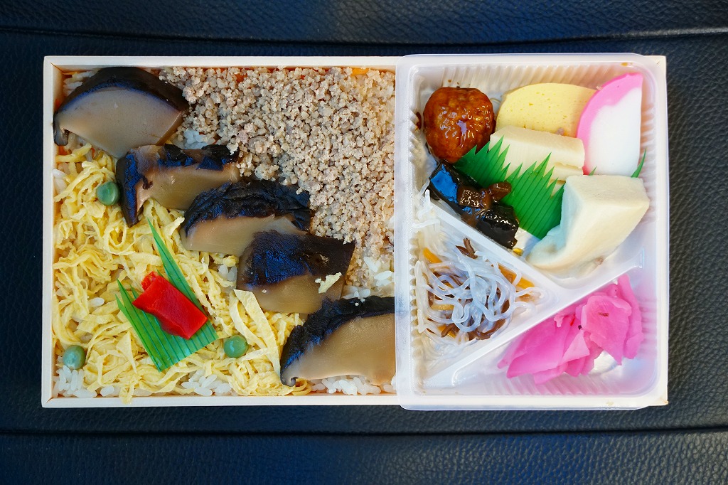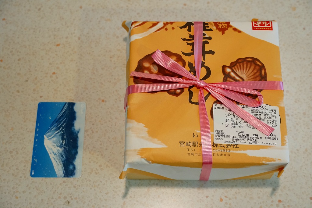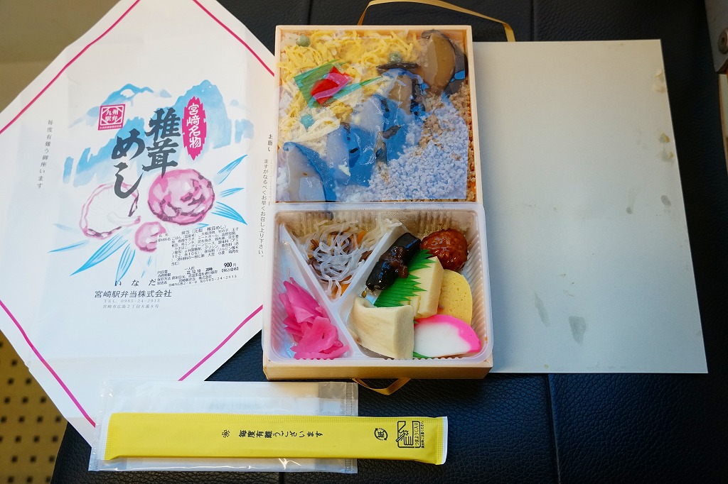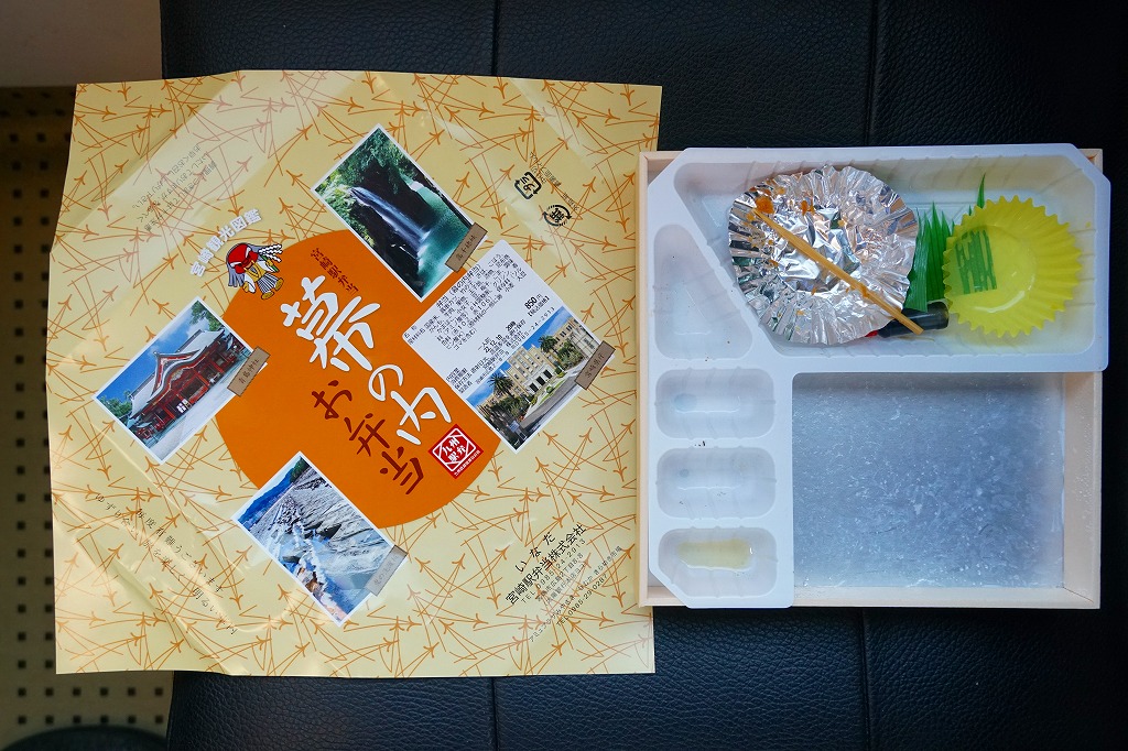 長方形の惣菜向けプラ製容器に透明なふたをして、宮崎県内各地の風景写真を印刷した大きな掛紙で包む。中身は酢飯の上にシイタケ煮や錦糸卵やとりそぼろなどを貼り付けた御飯の周りを、カツオの角煮、切り干し大根、イワシ天、ごぼう、こんにゃくやカボチャなどの煮物、鶏唐揚、玉子焼、日向夏ゼリーなどで囲むもの。