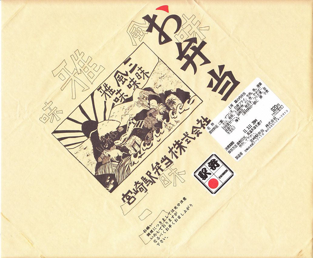 1970年代に使われたのではないかと思われる、昔の宮崎駅弁の掛紙。21世紀のものと同じ絵柄が使われる。
