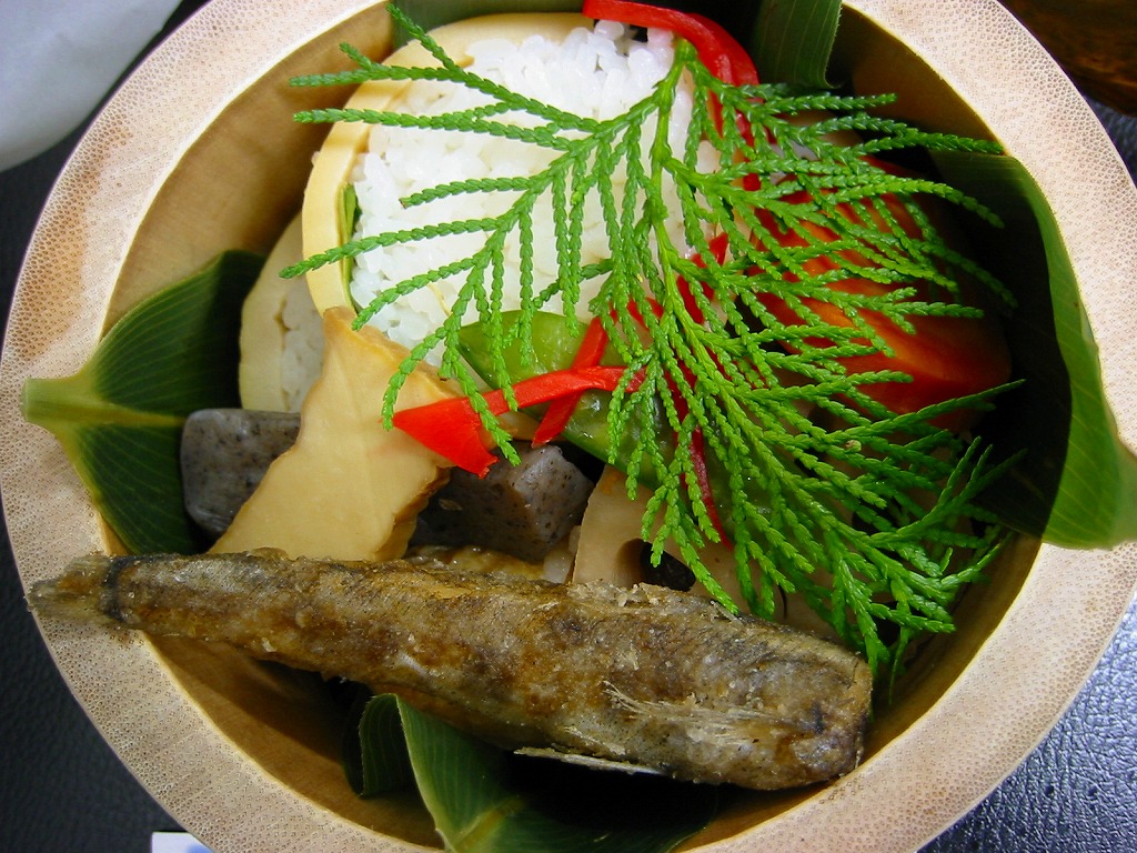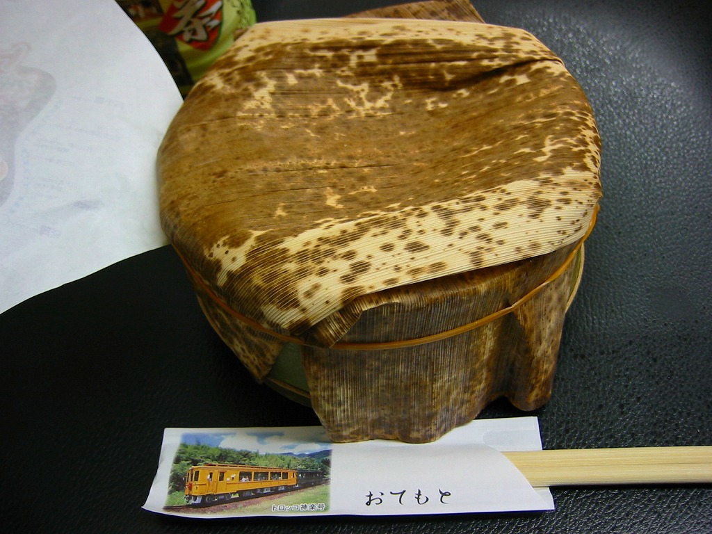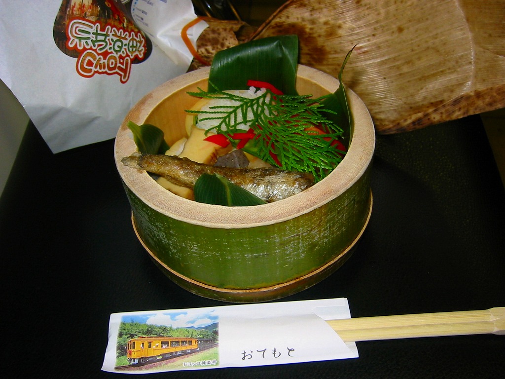 竹の輪切りをそのまま駅弁容器にして、竹皮をかけて輪ゴムでしばり掛紙をかける姿は見ただけで雰囲気を盛り上げる。中身は竹の子を巻いた寿司が二個に延岡特産めひかりの唐揚げ、椎茸や人参等の大粒な煮物などで、容器と敷かれた笹の葉の香りに包まれて味覚嗅覚触覚に訴える。名駅弁となり得る実力を感じた。掛紙によるとホテルが製造し鉄道会社が販売する。
