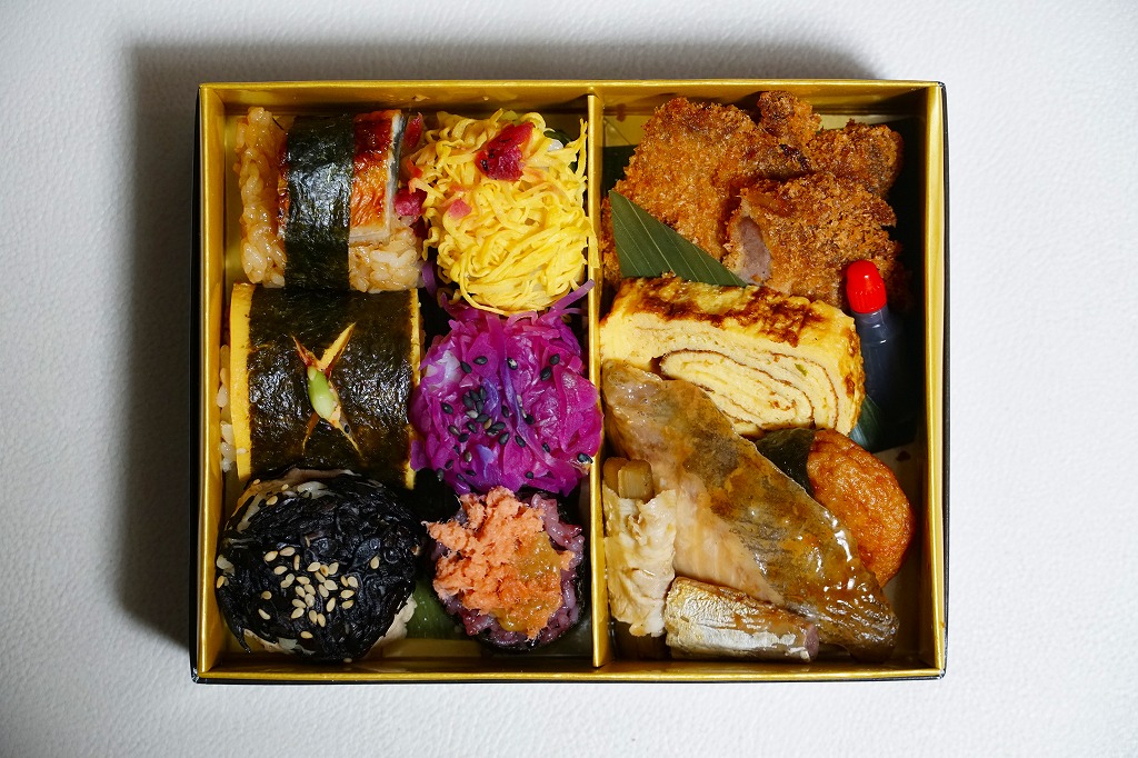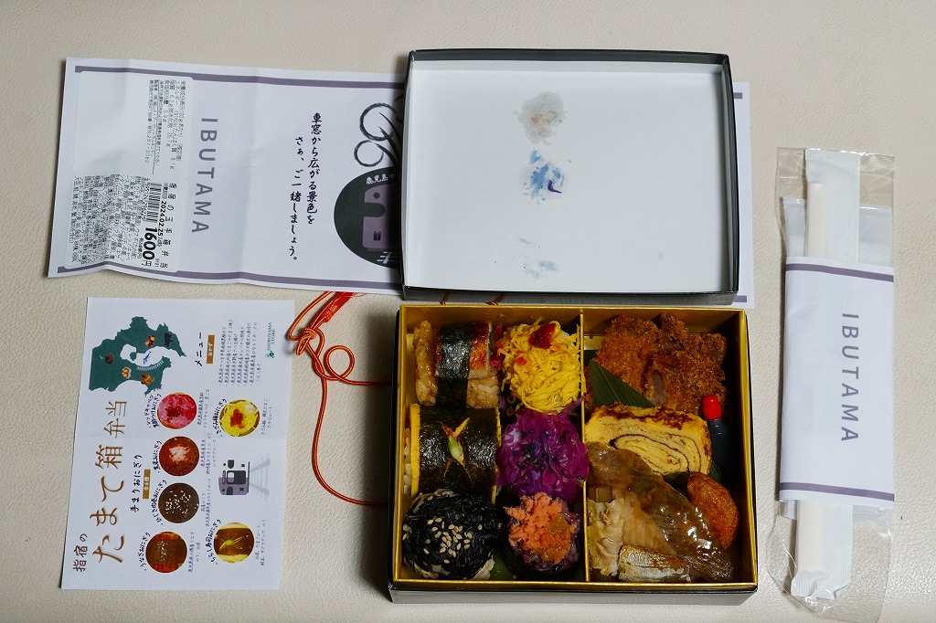 ということで、体裁は上記の車内弁当「指宿のたまて箱弁当」に似て、紙箱に白黒の掛紙を巻いてゴムでしばるもの。霧島熟成豚ひなもりポークを使用したひじき肉巻おにぎり、鹿児島大学農学部監修とした鹿児島県産の黒米と枕崎産のカツオミソを使用した黒米おにぎり、霧島産黒酢によるレッドキャベツ黒酢おにぎり、大隅産うなぎの手まり、鹿児島の味という甘いちらしずしとうす焼玉子の手まり、指宿の菜の花をイメージした高菜の手まりで6種のてまりおにぎりと、さつま半島南端黒豚カツ、南九州産のタマゴを使った玉子焼き、串木野産のさつま揚げ、垂水産カンパチの照焼き、枕崎産カツオ腹皮の塩焼き、霧島連山ひなもりポークのごぼう焼きを、おおむねタイル状に並べたり折り重ねた姿は車内弁当にそっくり。具材もだいたい同じ。