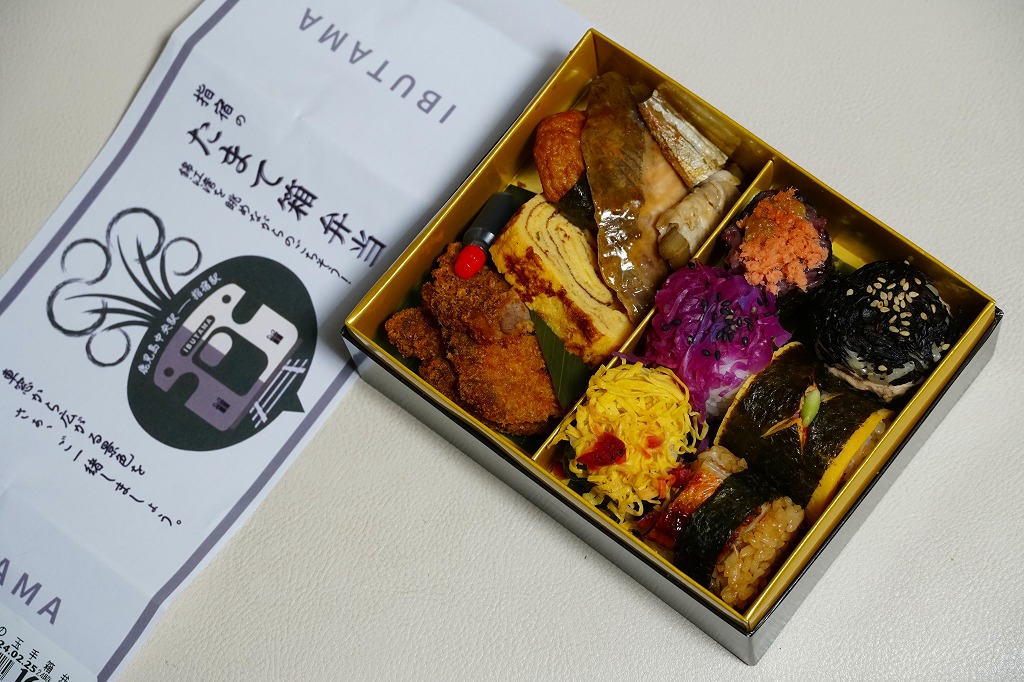 2025(令和7)年1月の京王百貨店の駅弁大会で、鹿児島県の指宿枕崎線の指宿駅の駅弁「りゅうぐうの舞」として実演販売。京王百貨店のプレスリリースを読み込めば、同線の観光特急列車「指宿のたまて箱」の車内受取限定弁当「指宿のたまて箱弁当」をモチーフにした弁当と判明するが、催事では指宿駅の駅弁として、指宿のたまて箱の車内弁当として、宣伝し販売し紹介された。