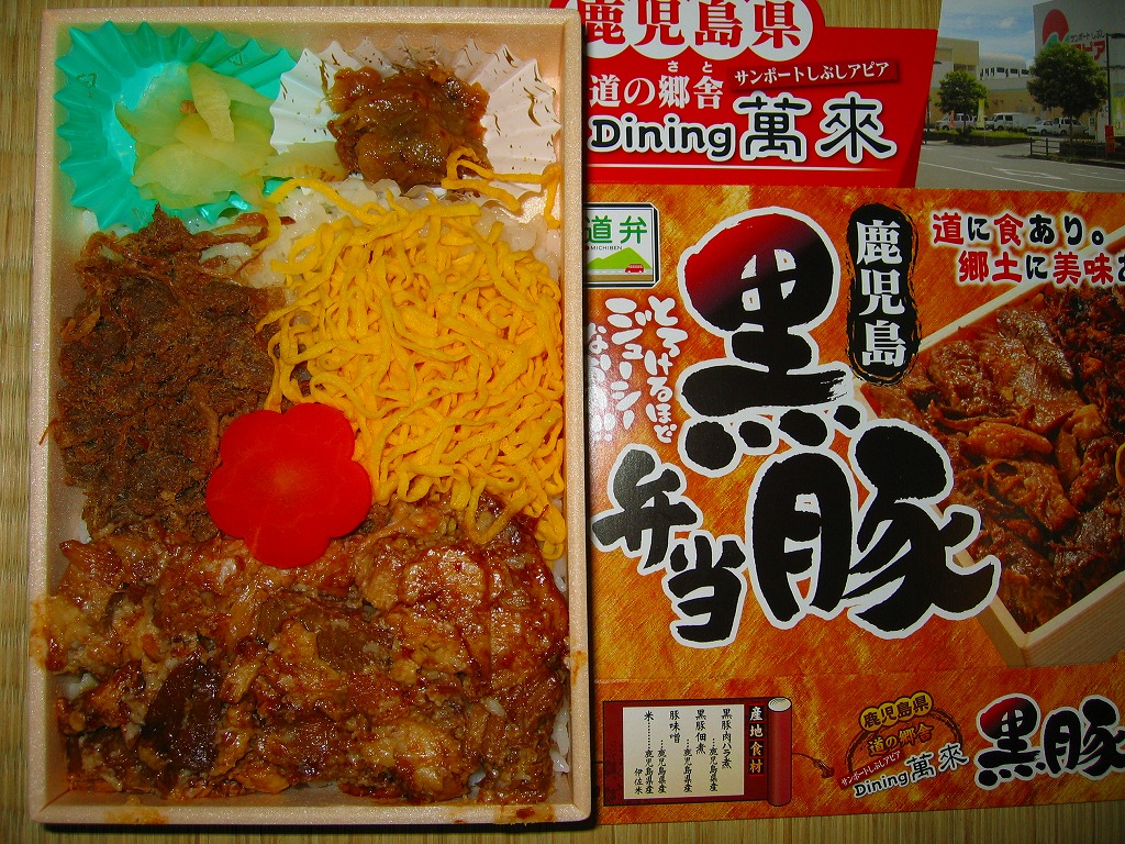 観光特急「はやとの風」で訪れた大隅横川駅で、様々な物品とともに販売されていたお弁当。浅い竹籠にアルミホイルを敷き、きび入りおにぎり、黒米入りおにぎり、玉子焼、スパゲティ、鶏唐揚2個、ガネ1個、ナスなどの煮物、ウインナーなどを置き、ラップで包んでいた。たった500円で、これは賑やかな1人用オードブル。駅弁の視点では、京都駅の竹籠弁当を薩摩風にアレンジしたような感じ。大隅横川駅待合室での物産販売「ぽっぽ市」は、2010年代に定期的または不定期に開催されたようだが、大隅横川駅で弁当を買えたという話は、この先にも後にもまったく聞かれない。