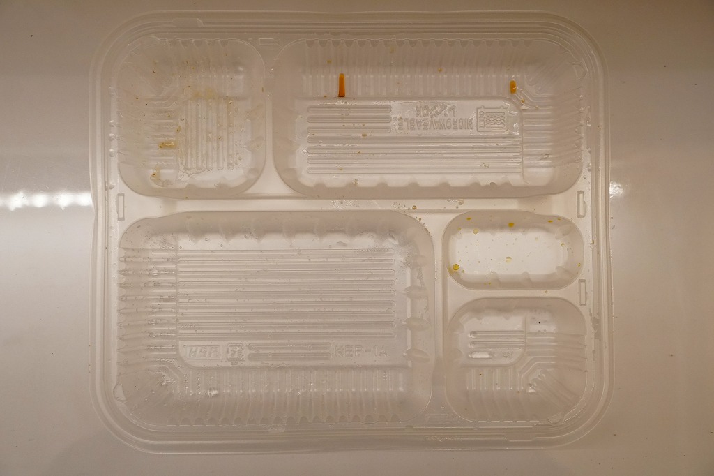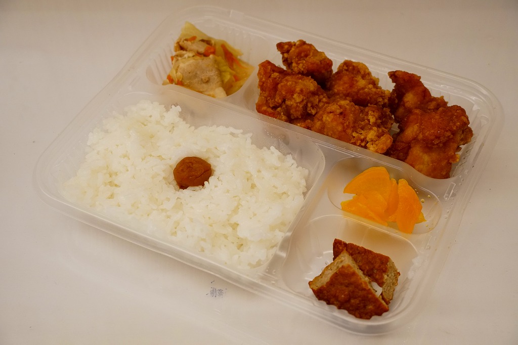 これは駅弁でなく、2025年1月に鹿児島港から三島村の各島へ行くフェリー「フェリーみしま」の乗船時に、乗り場に来た弁当販売車で買えた弁当。その販売は船内で放送され、買い物客の行列ができ、船が出港する前にいなくなった。これは日の丸御飯に鶏唐揚、豚肉と野菜炒め、ハンバーグ、たくあんを添えた、とりから弁当。鹿児島や三島その他の郷土や地域性を持たない惣菜弁当だと思うが、おいしかった。味噌汁付きで600円均一。