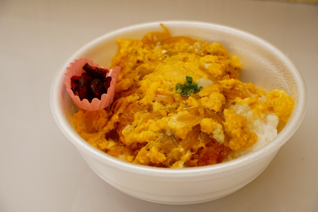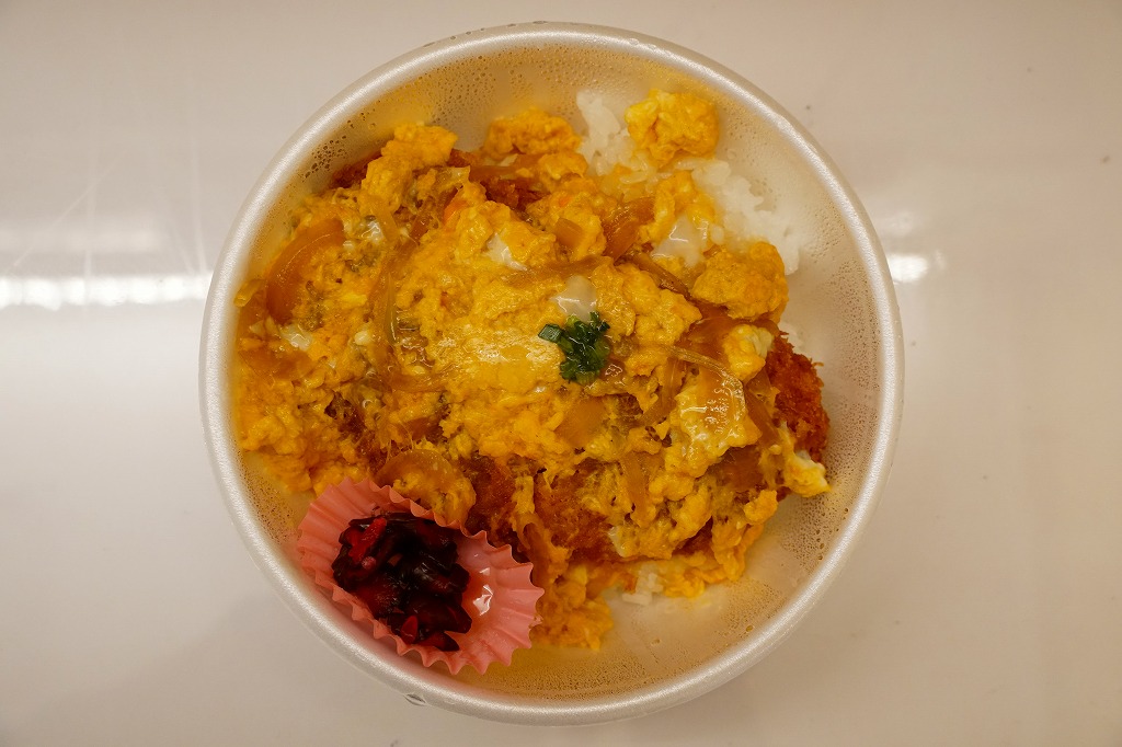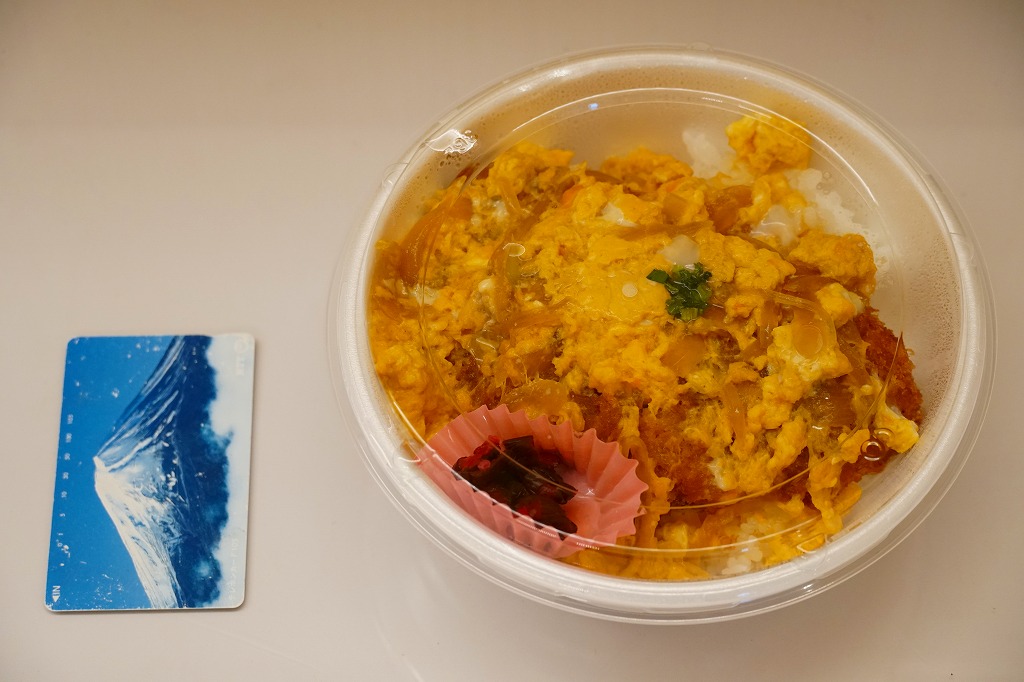 これは駅弁でなく、2025年1月に鹿児島港から三島村の各島へ行くフェリー「フェリーみしま」の乗船時に、乗り場に来た弁当販売車で買えた弁当。その販売は船内で放送され、買い物客の行列ができ、船が出港する前にいなくなった。これは卵とじのカツ丼で、鹿児島や三島その他の郷土や地域性を持たない惣菜弁当だと思うが、おいしかった。味噌汁付きで600円均一。