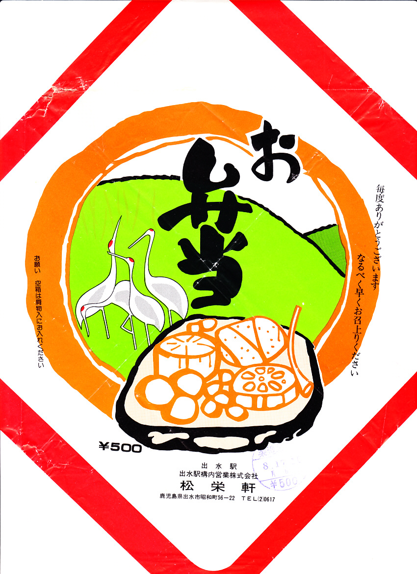 1976(昭和51)年8月17日の調製と思われる、昔の出水駅弁の掛紙。出水なのでツルを描き、手前のおでんかお供え物のような品物は何だろうか。