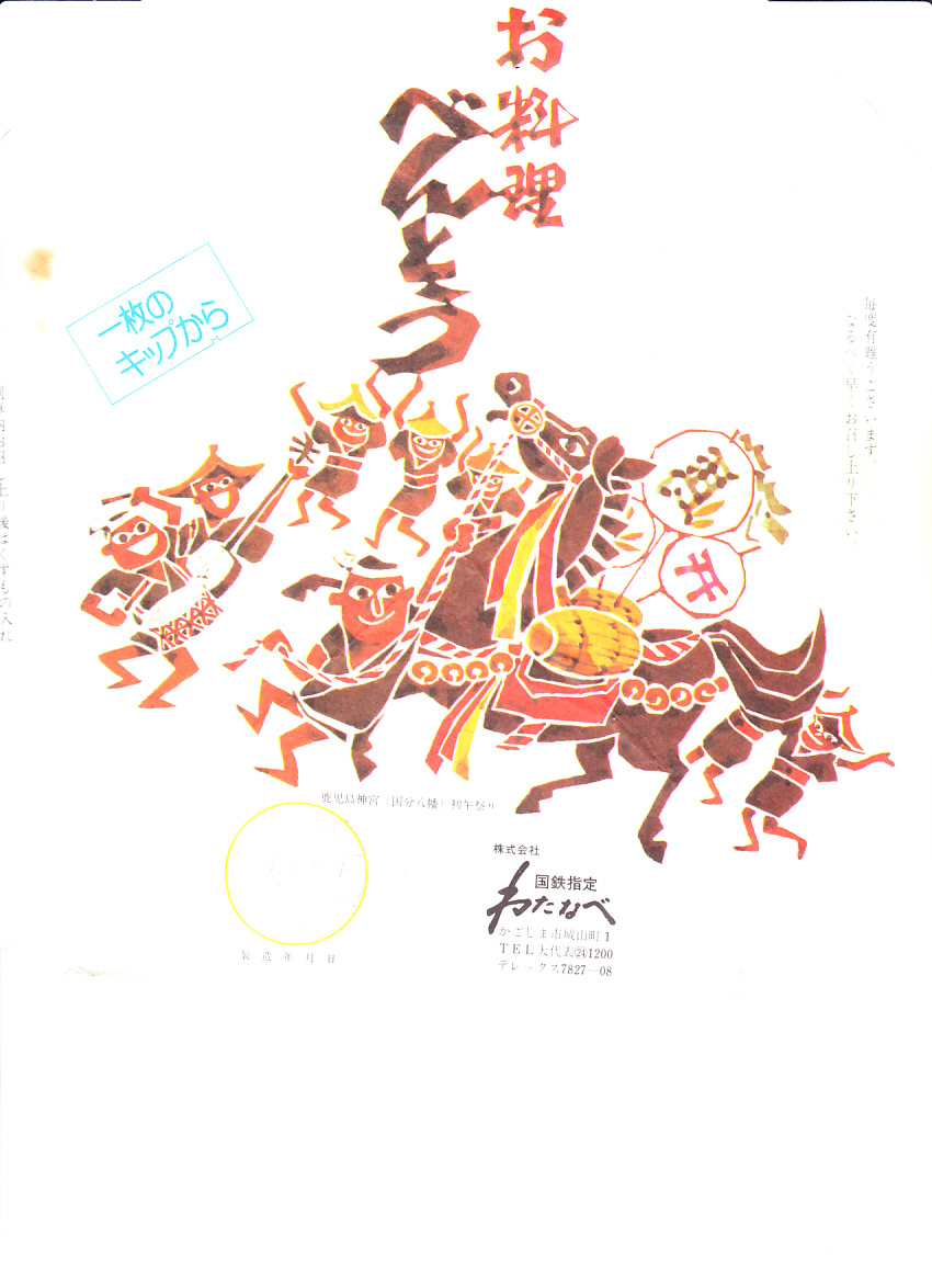1978(昭和53)年7月27日の調製と思われる、昔の西鹿児島駅、現在の鹿児島中央駅の、駅弁の掛紙。賑やかそうな祭の絵柄は、鹿児島神宮の初午祭(はつうまさい)鈴懸馬踊り(すずかけうまおどり)を描いたものか。
