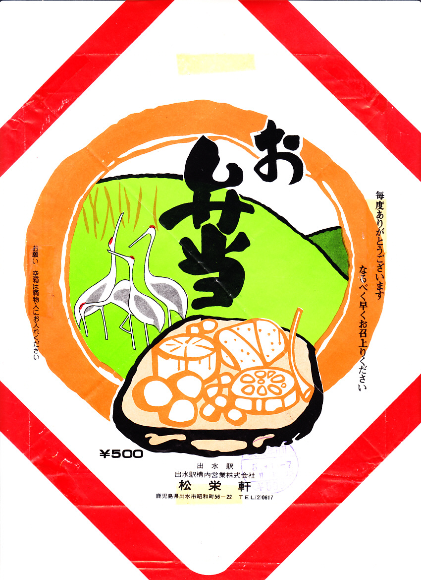 1980年代の調製と思われる、昔の出水駅弁の掛紙。絵柄は下記のものと同じ。