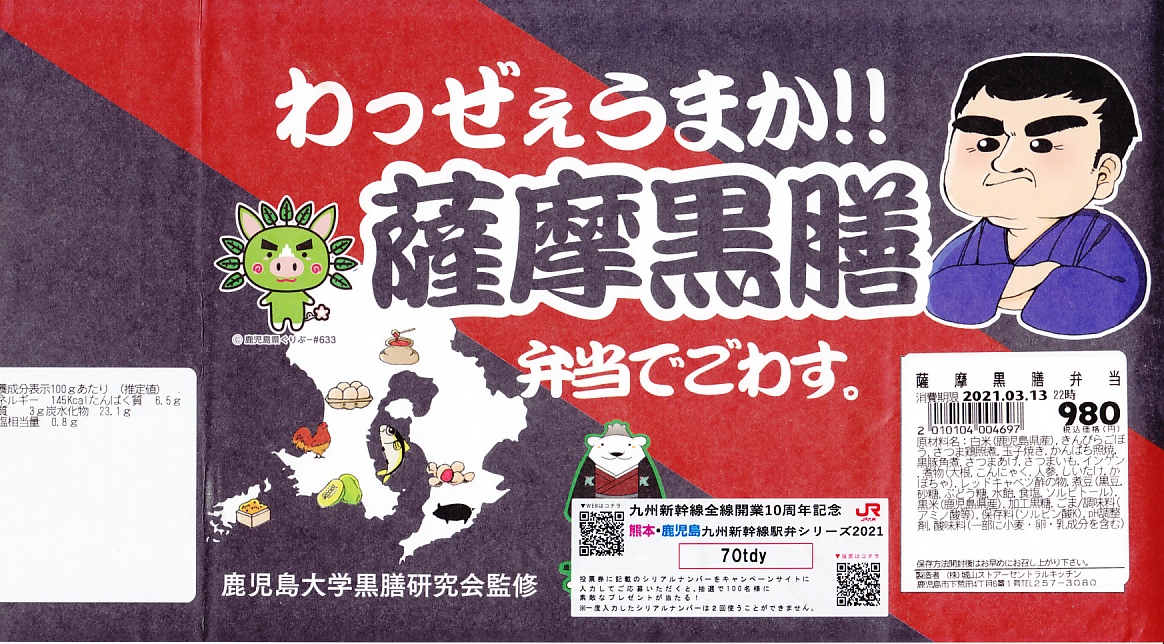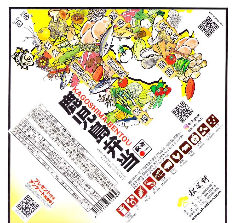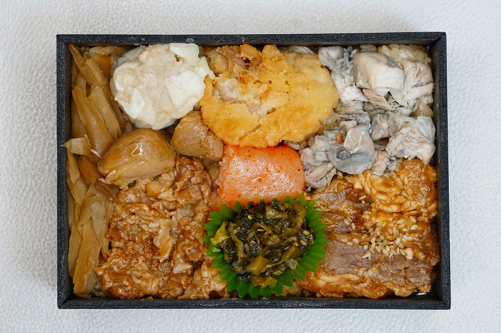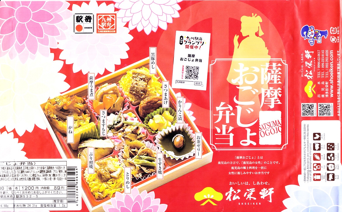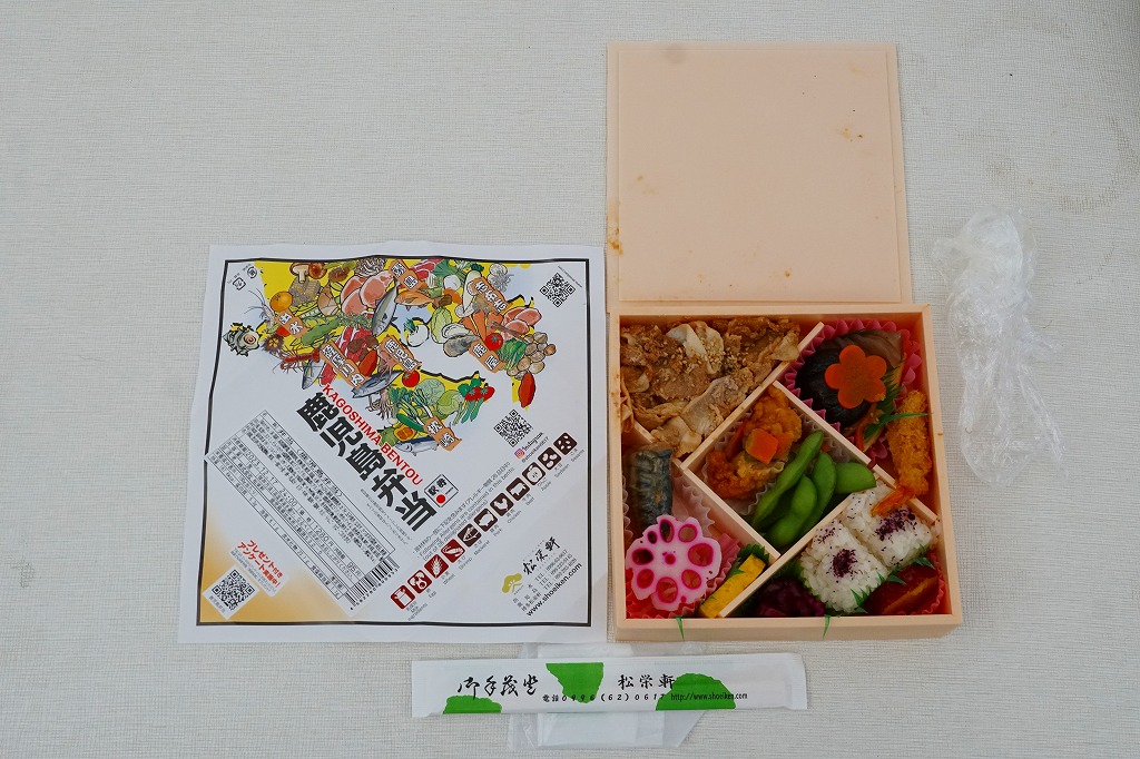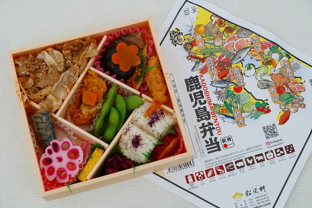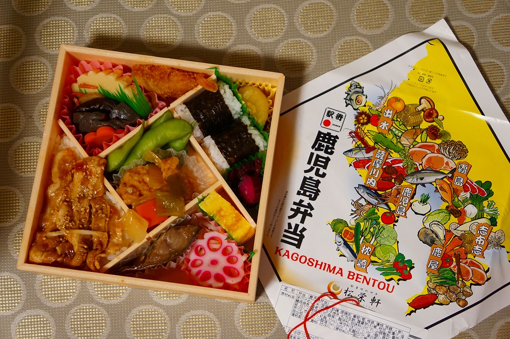 2015(平成27)年までに発売か。掛紙には鹿児島県の地図と食材のイラストが、おそらく産地と関連付けられて描かれる。中身は俵飯に漬物やサツマイモ、茶飯を覆う豚焼肉、鶏酢あんかけと枝豆、エビフライと煮物、サバ照焼とダイコンなどの酢の物と玉子焼。鹿児島でいろどりたくさん、もりだくさん。値段は2016年時点で1,080円、2019年10月から1,100円、2023年時点で1,280円。