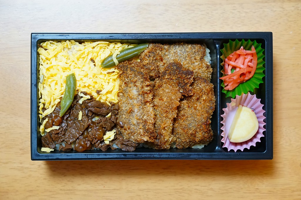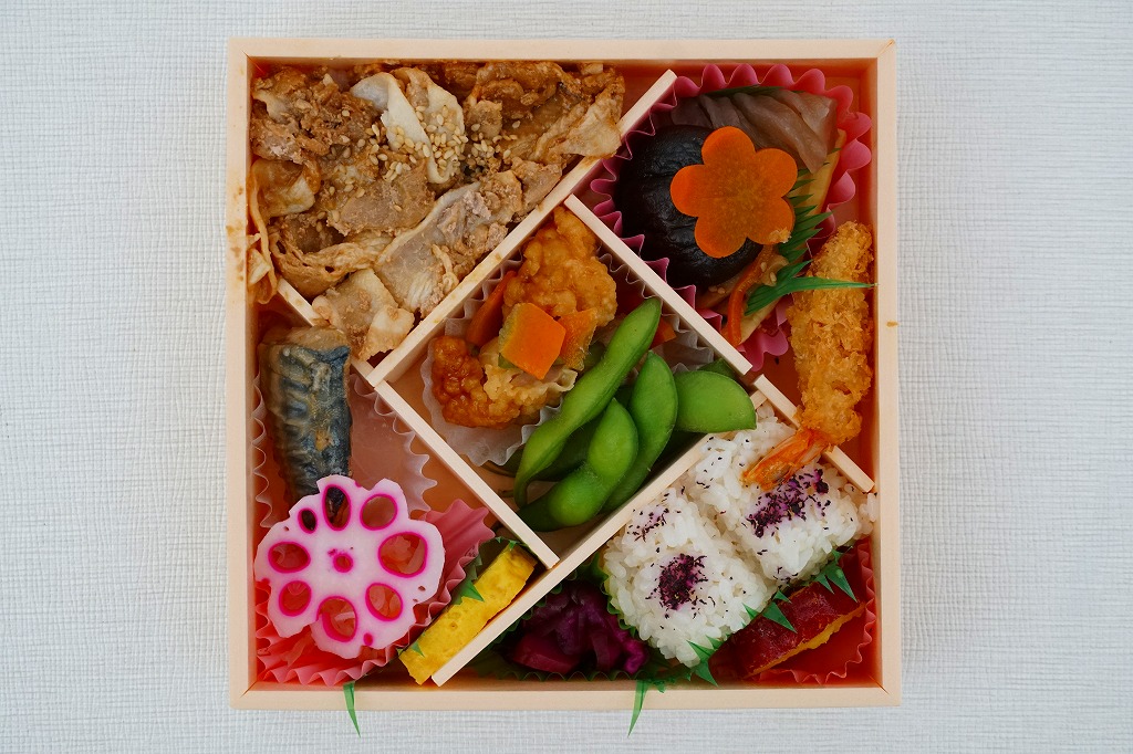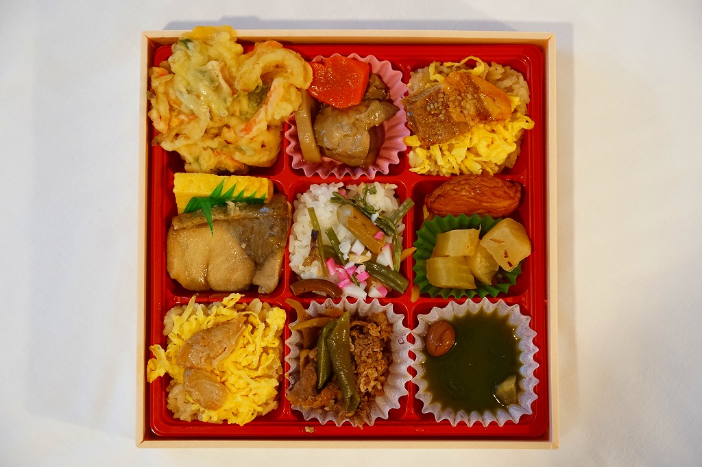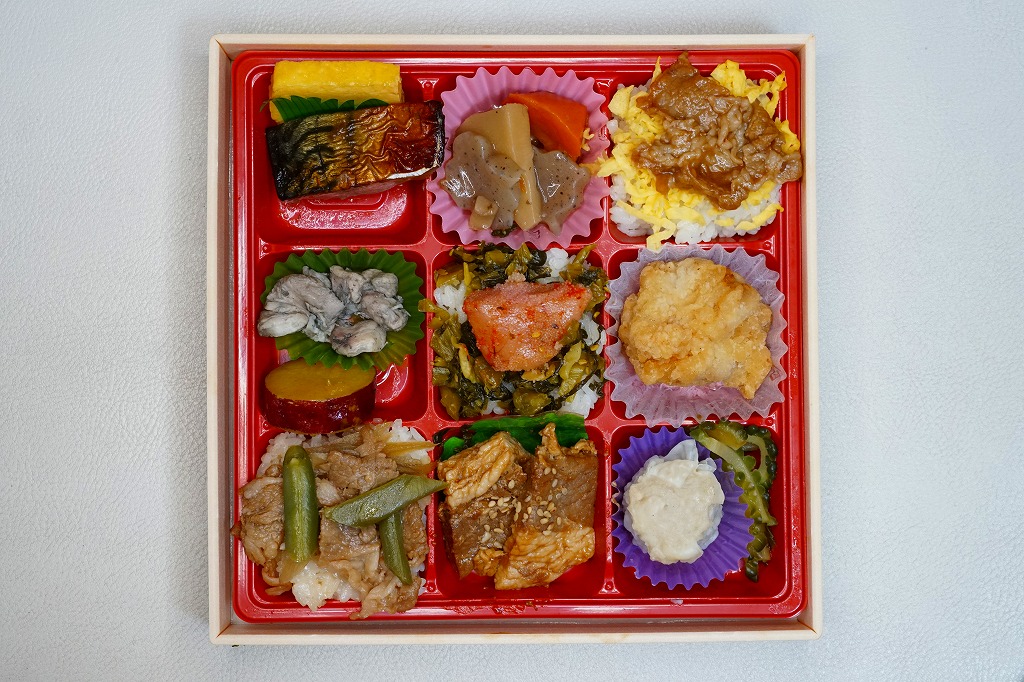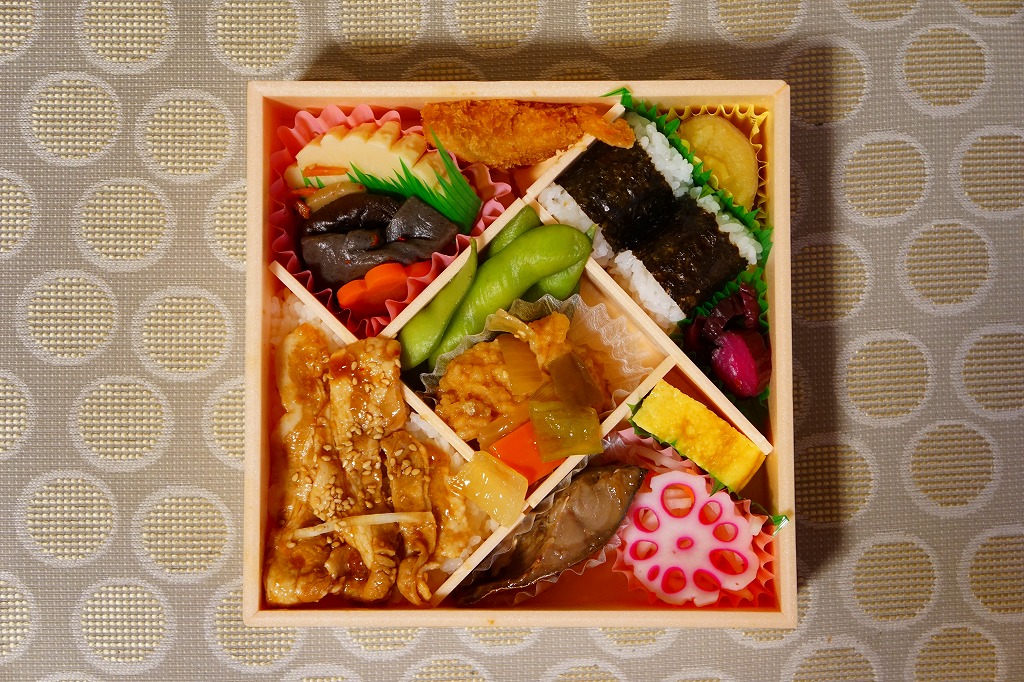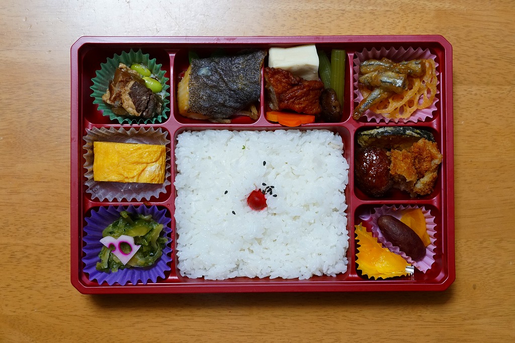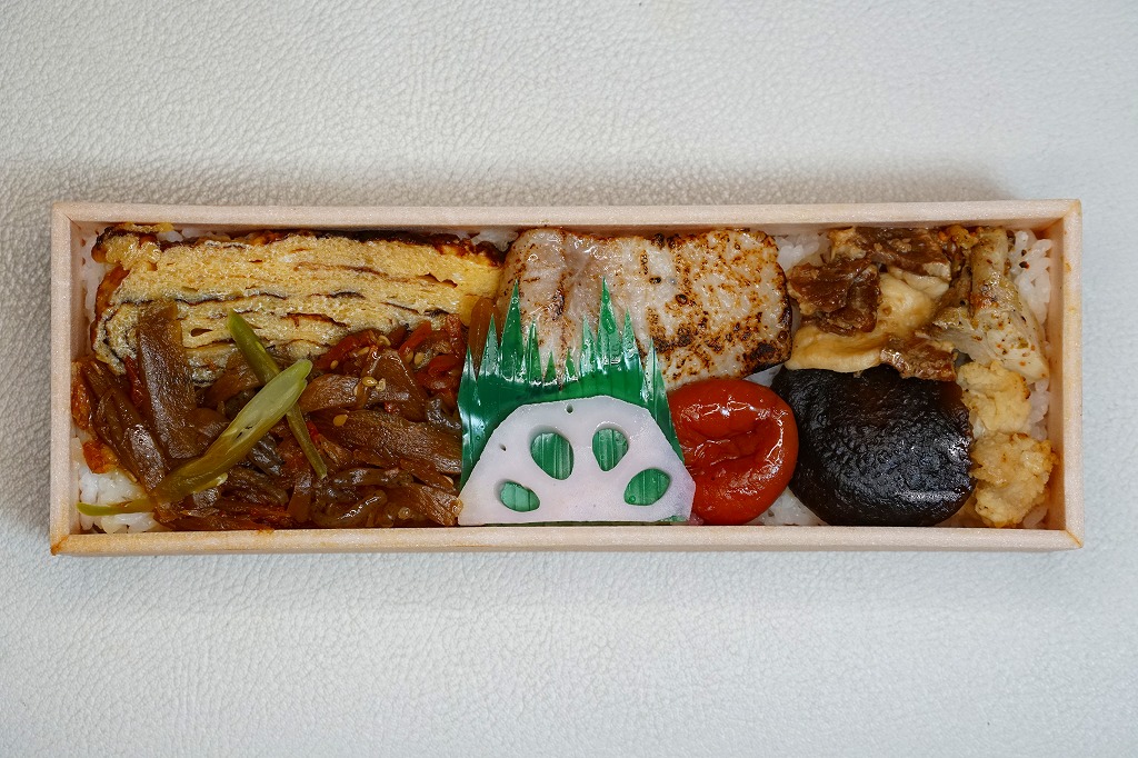 2015(平成27)年までに発売か。掛紙には鹿児島県の地図と食材のイラストが、おそらく産地と関連付けられて描かれる。中身は俵飯に漬物やサツマイモ、茶飯を覆う豚焼肉、鶏酢あんかけと枝豆、エビフライと煮物、サバ照焼とダイコンなどの酢の物と玉子焼。鹿児島でいろどりたくさん、もりだくさん。値段は2016年時点で1,080円、2019年10月から1,100円、2023年時点で1,280円。