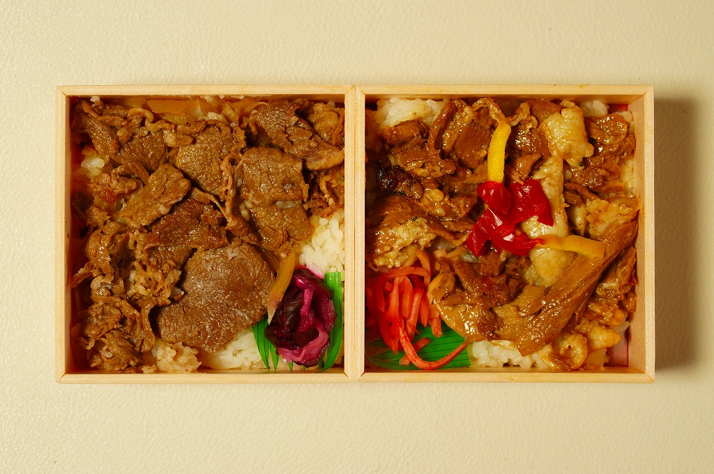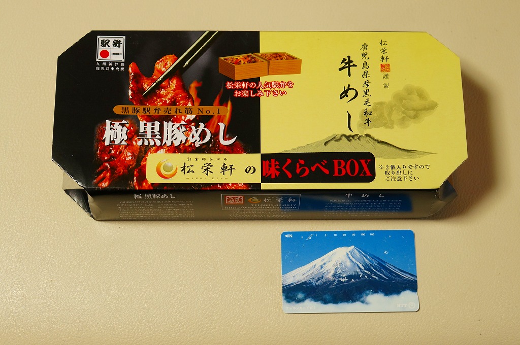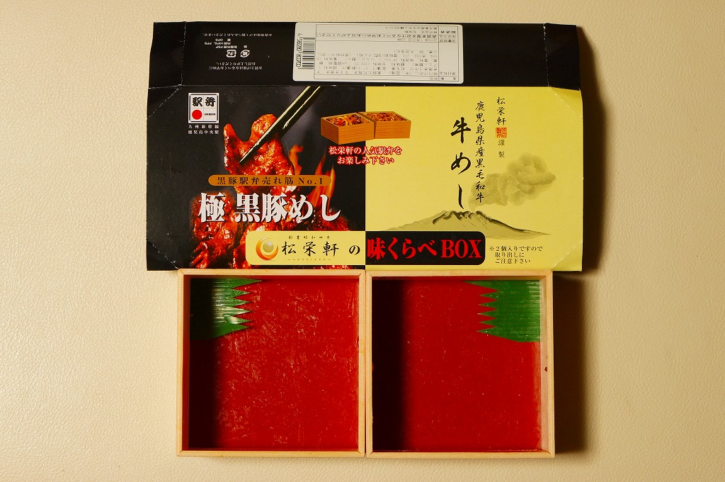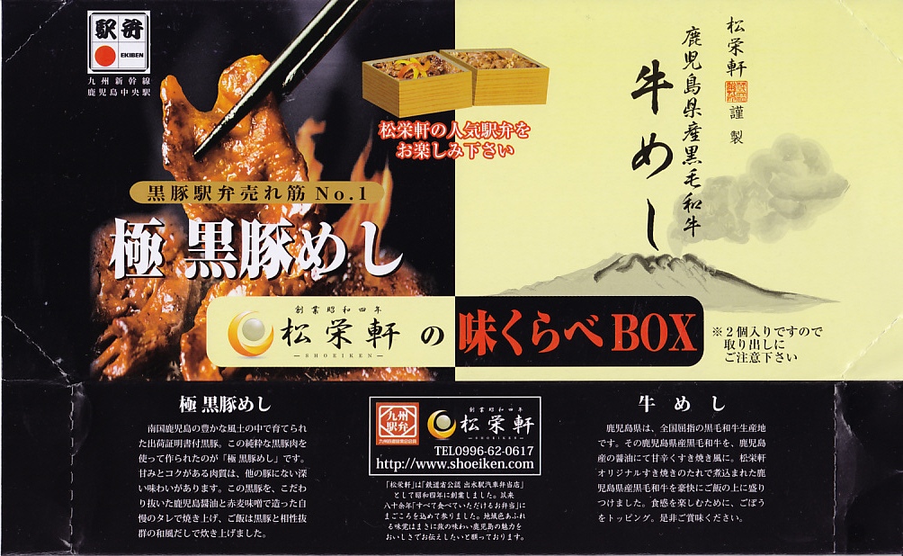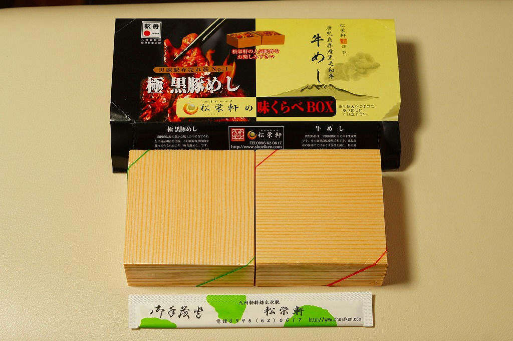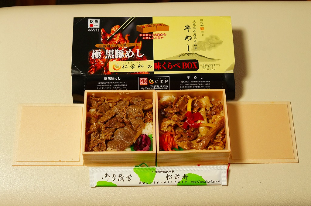 2012(平成24)年10月の発売で、同年のJR九州の駅弁キャンペーン「九州駅弁グランプリ(第9回)」にエントリー。商品名のとおり、見た目のとおり、松栄軒の出水駅の駅弁「極黒豚めし」と「牛めし」がひとつずつ。箸は一膳なので、ひとりで食べ比べる。2017年までの販売か。
