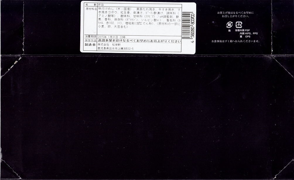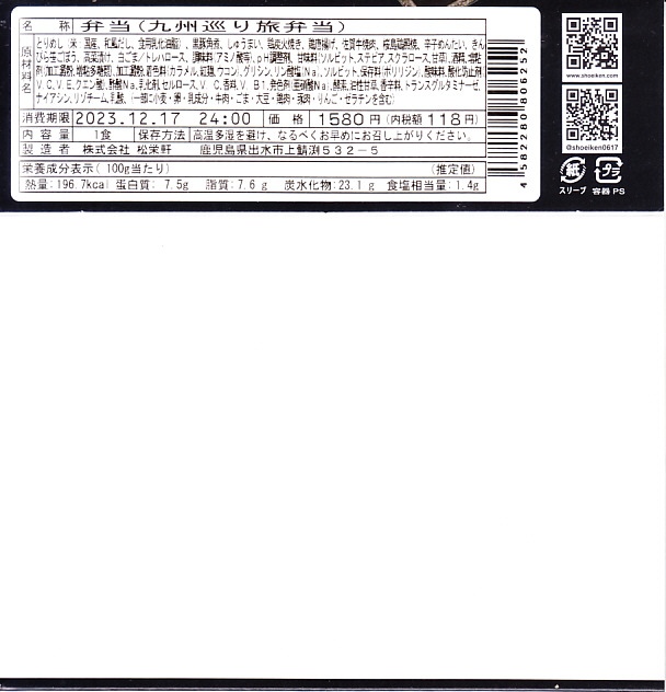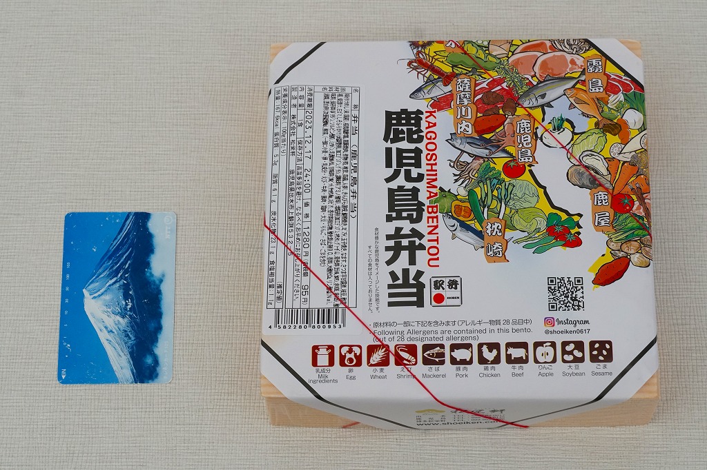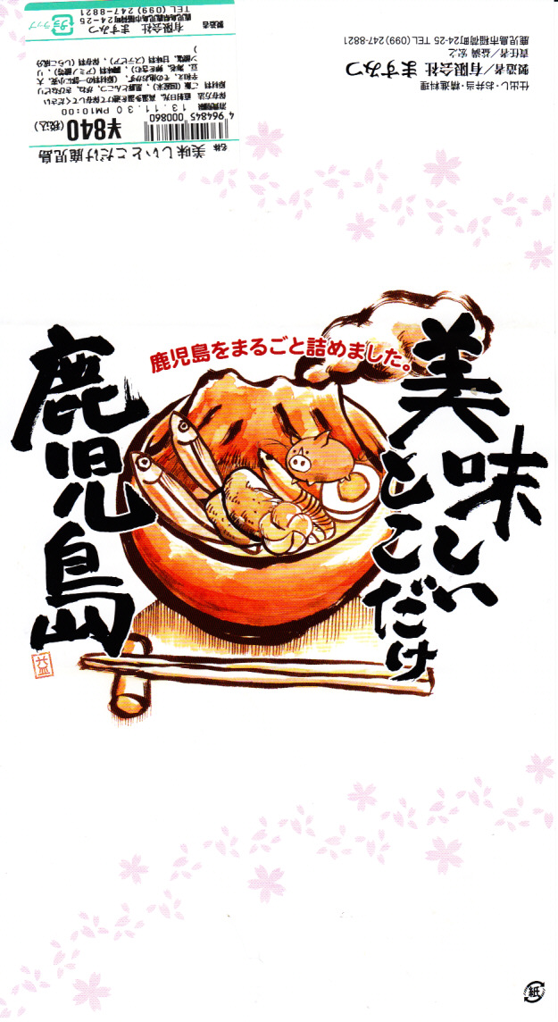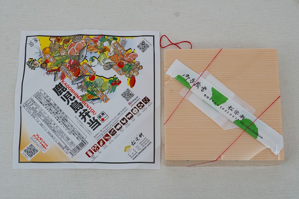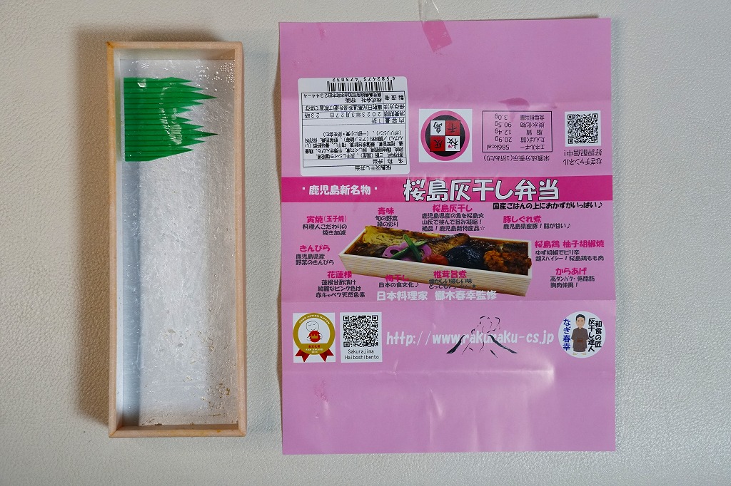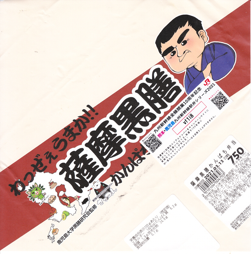 2016(平成28)年10月22日に購入した、鹿児島中央駅弁の掛紙。上記の2023年のものと比べて、法改正で記載事項が増えてレイアウトが変わったが、絵柄は同じ。容器も同じ。中身もだいたい同じ。