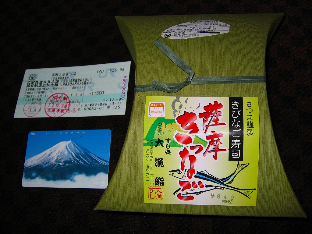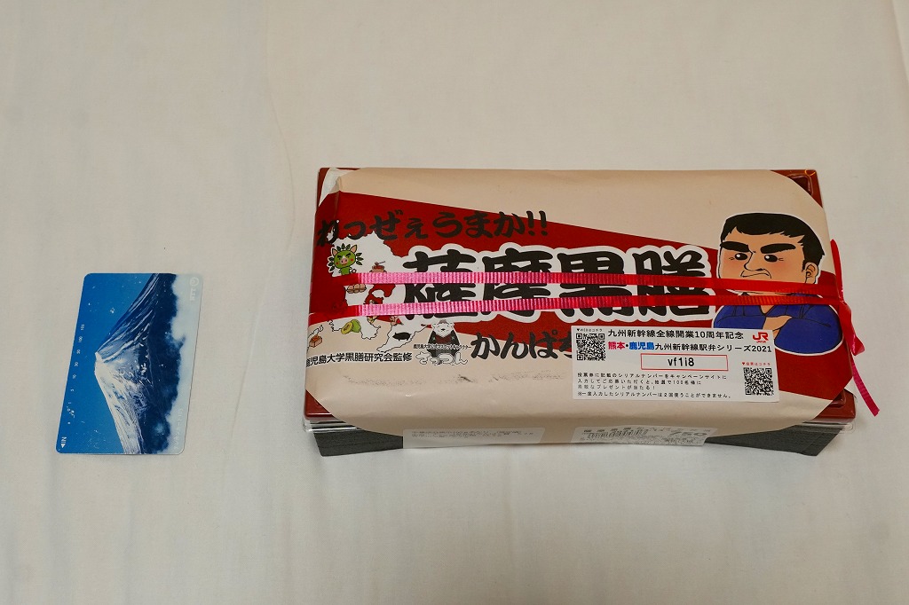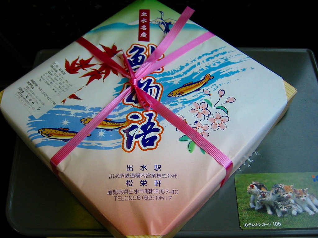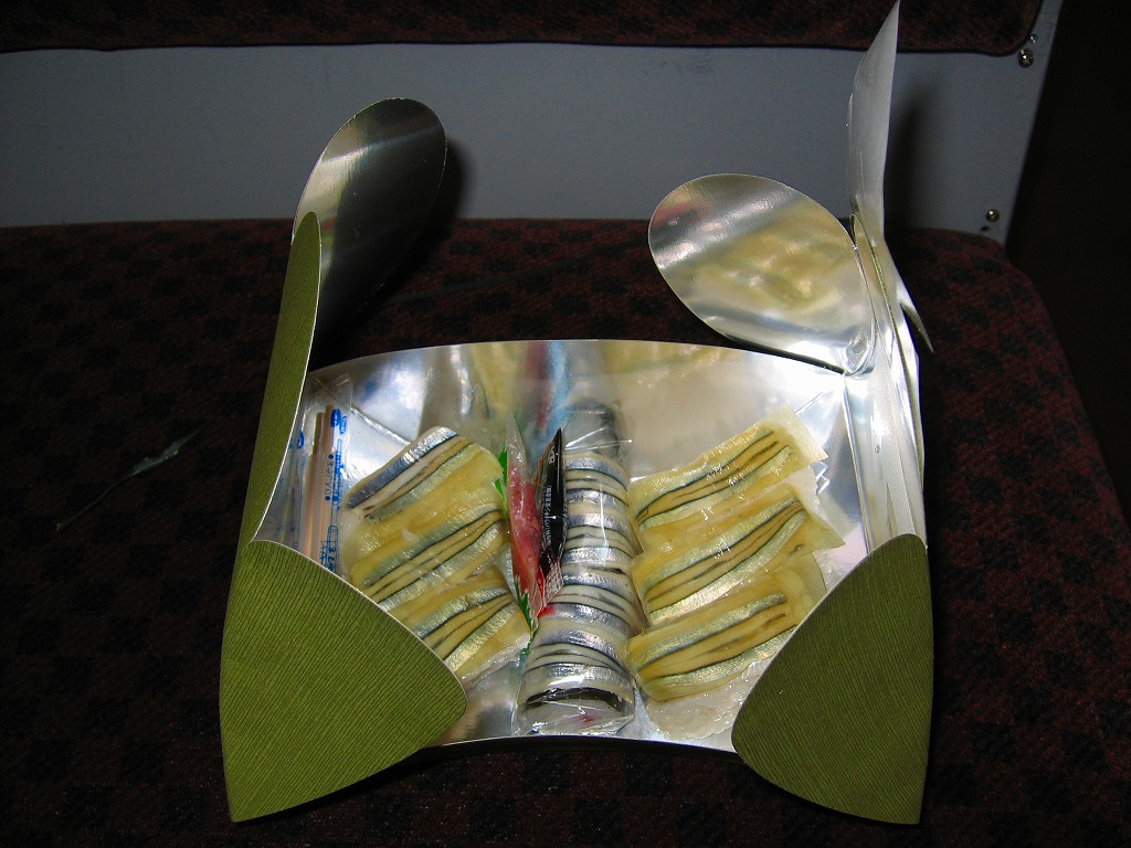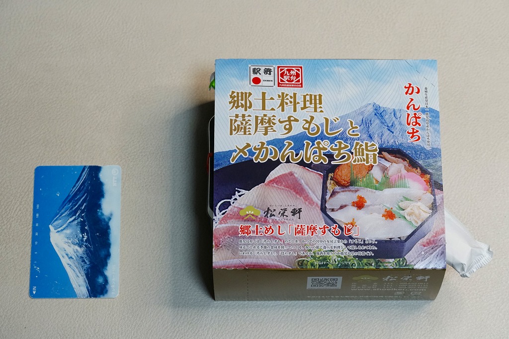 2004年3月の九州新幹線部分開業に合わせて発売。内部が銀色のボール紙を立体的に組み立てた中に、胡麻混じり酢飯の上や周囲にキビナゴの酢塩締めと昆布を貼る、鹿児島名物きびなご寿司を詰めて、商品名シールと針金入り紙帯で封をする。よそ者からすれば珍味に該当するだろう。普段見慣れない食材を見るだけで、旅の気分が盛り上がるし、品質も良いと思う。