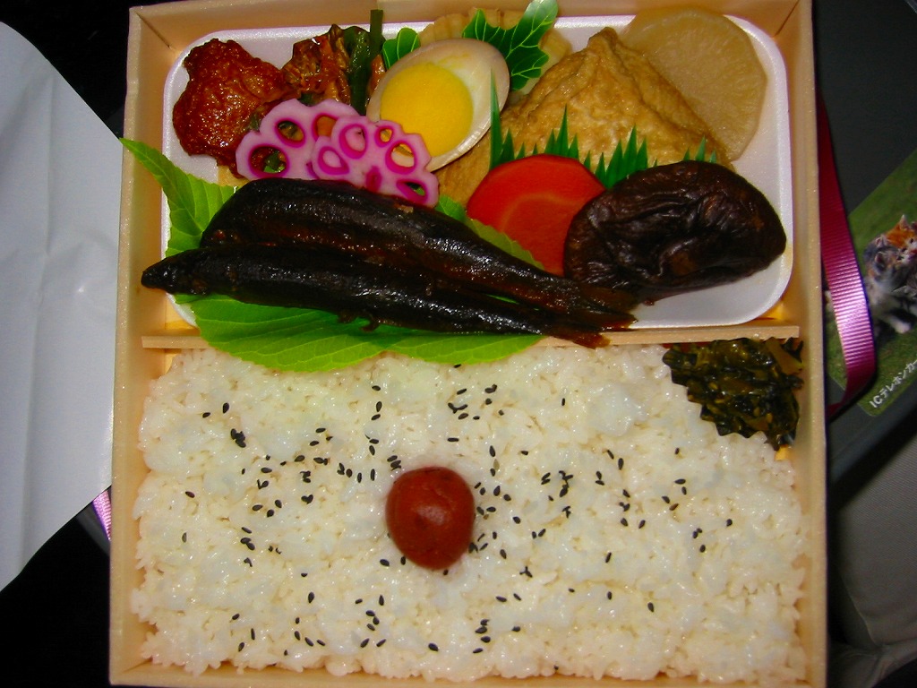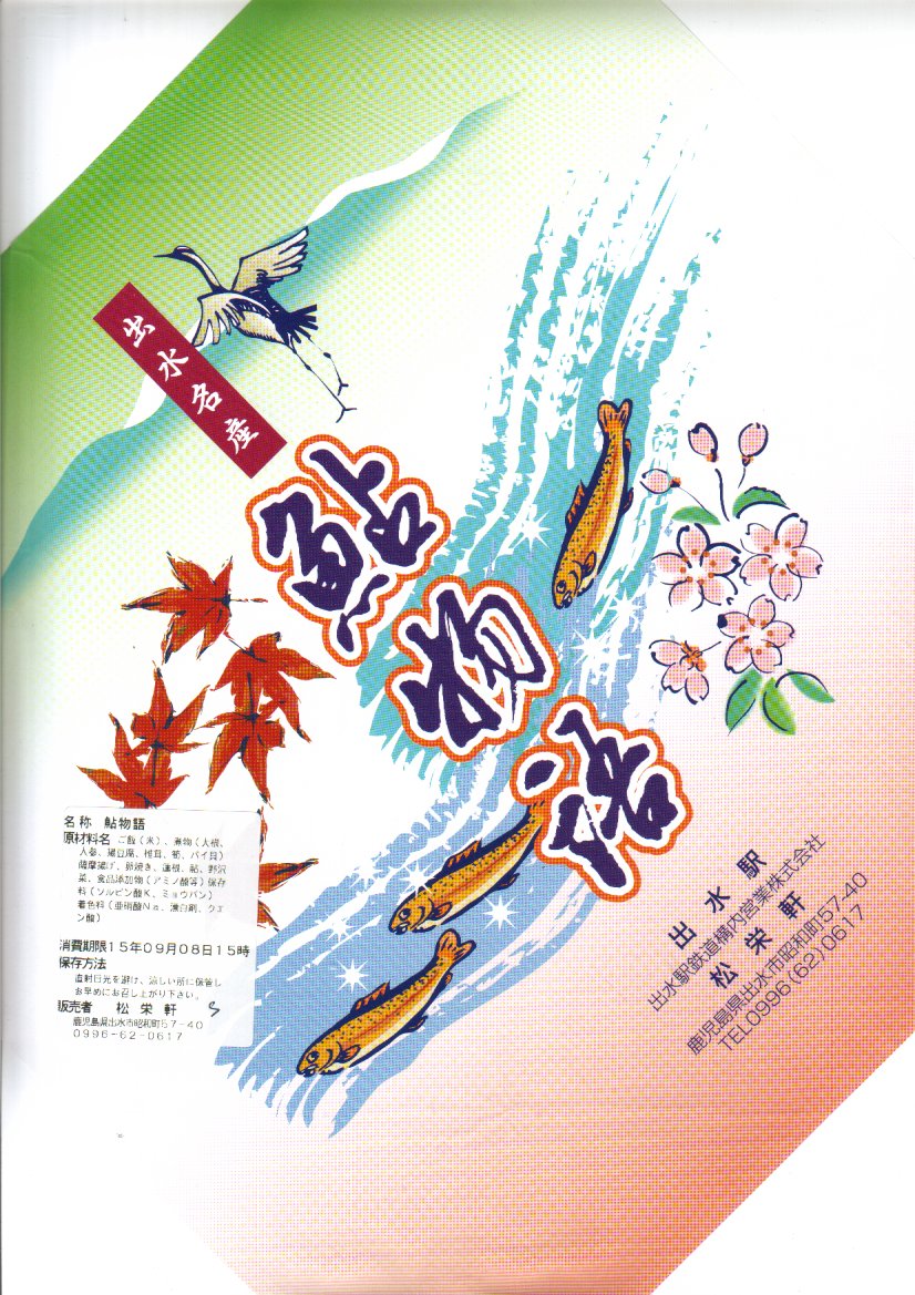 大きめの正方形な容器を、鮎と鶴を描いた大きめの正方形な掛紙で包みビニールひもでしばる。中身は日の丸御飯に煮物や薩摩上げや玉子焼とともに、鮎甘露煮が二匹入るもの。鮎がなければこんなに味気ない駅弁は他にないだろうと感じたのは、おかずを乗せる白い食品トレーのせいか。出水駅にえびめしを買いに行って、しかし売り切れていたのでこちらを買ったという報告がいくつもある。