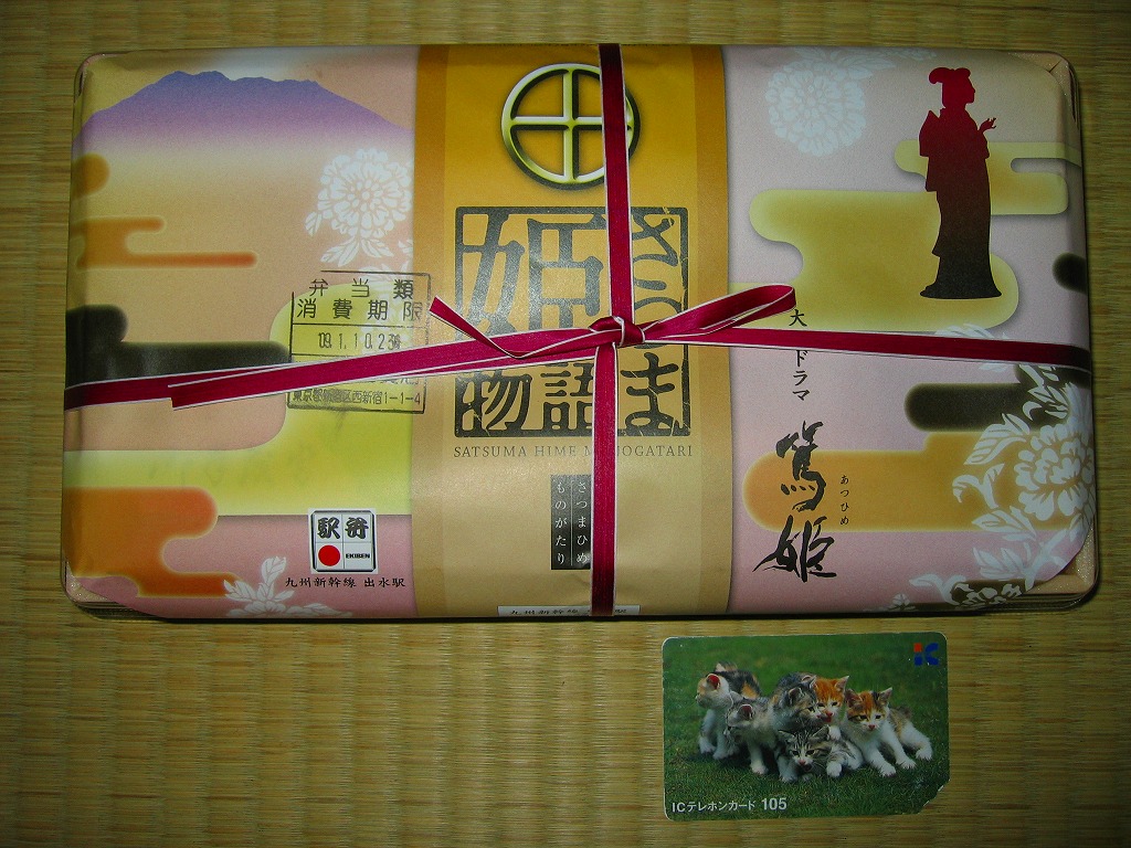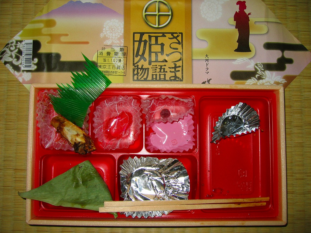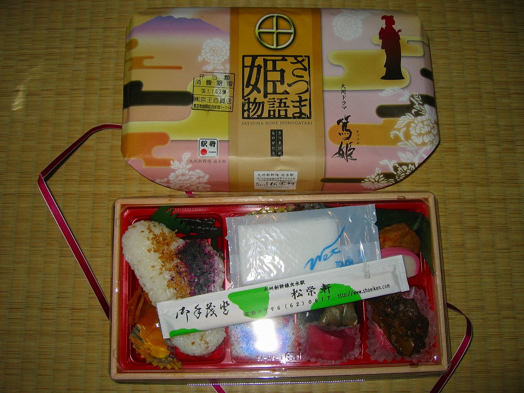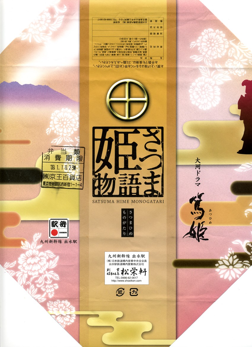 2008(平成20)年のNHK大河ドラマ「篤姫」の放送にちなみ、同年3月頃に発売か。長方形の容器に透明なふたをかけ、島津家の家紋やNHKの公式ロゴマークも付いた掛紙ですっぽり包み、ひもで十字にしばる。中身は松型に固めた白御飯にとんこつ、薩摩揚、いこもち、アユ甘露煮、タケノコやニンジンなどの煮物、鮭昆布巻、キンカンなどを詰めるもの。いろんな食材と個性を詰め込んでいる、催事場内では理解を得られないだろうが九州の駅弁らしい特殊幕の内。2014年時点で売られていない模様。