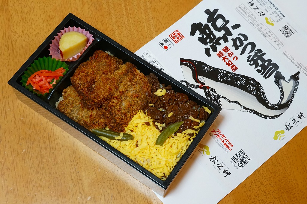 2020(令和2)年の2月までに発売か。現地でなく駅弁催事向けに出荷される商品かもしれない。茶飯をくじらカツとくじら大和煮と錦糸卵で覆い、インゲンで彩り、サツマイモと紅生姜を添える。長崎駅で「ながさき鯨カツ弁当」が生まれて定評を得てから約15年、この業界では珍しいことに、どんな駅弁屋も追わなかった、追えなかった、クジラの駅弁がついに出現した。しかし常温のくじらに臭みがひどく、他社が追わない理由を垣間見た気がした。それでも1年間は作られた模様。