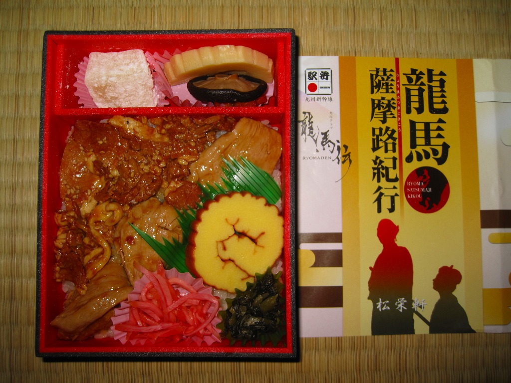 中身は味付飯の上に伊達巻、桜島とりの照焼き、黒豚の照焼き、高菜漬け、紅生姜を載せて、煮物といこもちを添えるもの。龍馬とお龍が鹿児島へ新婚旅行で訪れた時のイメージを駅弁にしたというが、何がそれに該当するのか分からない。伊達巻といこもちが印象的な、食べて良い味のする駅弁であった。出水駅の駅弁とされるが、実際は鹿児島中央駅で売られる模様。価格は2011年の購入時で1,050円、2014年4月の消費税率改定で1,080円。2014年までの販売か。