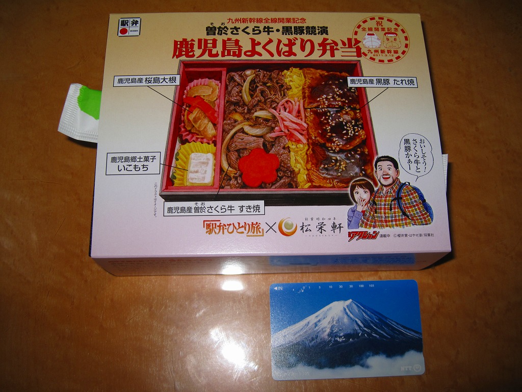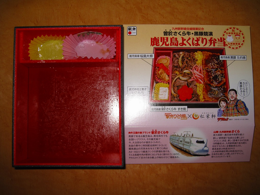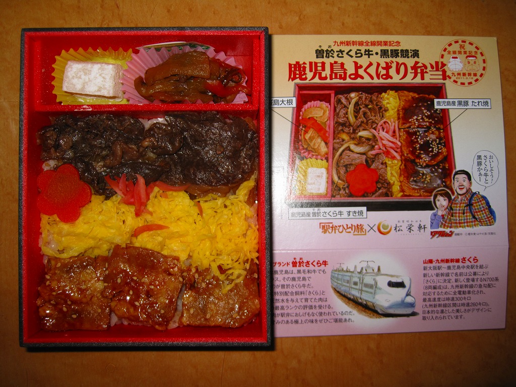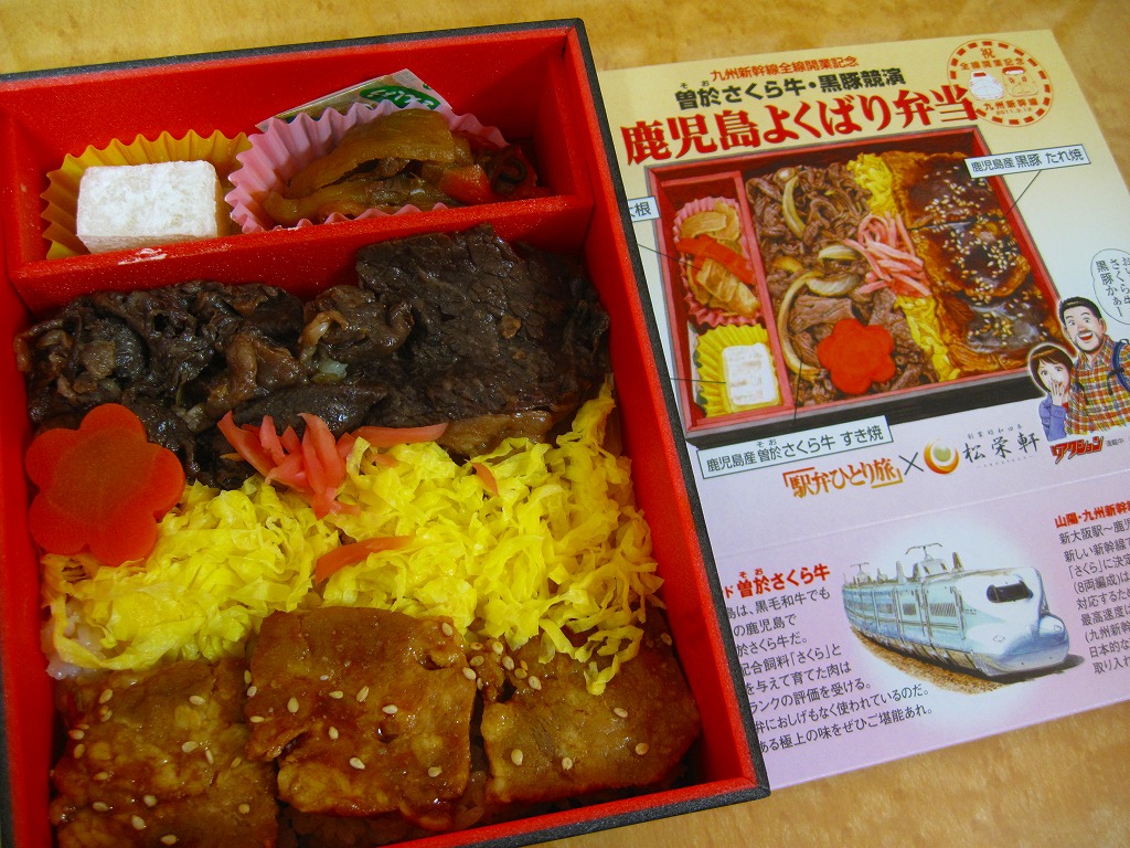 内側が赤く外側が黒い長方形の発泡材製容器を、中身のイラストに牛肉や新幹線の宣伝文を書いたボール紙の枠にはめる。中身はイラストのとおり、御飯の上を鹿児島産曽於(そお)さくら牛のすき焼、錦糸卵と紅生姜と花形ニンジン、鹿児島産黒豚たれ焼で3分の1ずつ覆い、桜島大根といこもちを添えるもの。甘い甘い牛肉と、スッキリした豚肉と、少量も肉の味を生かす御飯と、桜島大根といこもちの組合せが興味深い。価格以外には不満なし。価格は2011年の購入時で1,100円、2014年4月の消費税率改定で1,130円。2014年頃までの販売か。