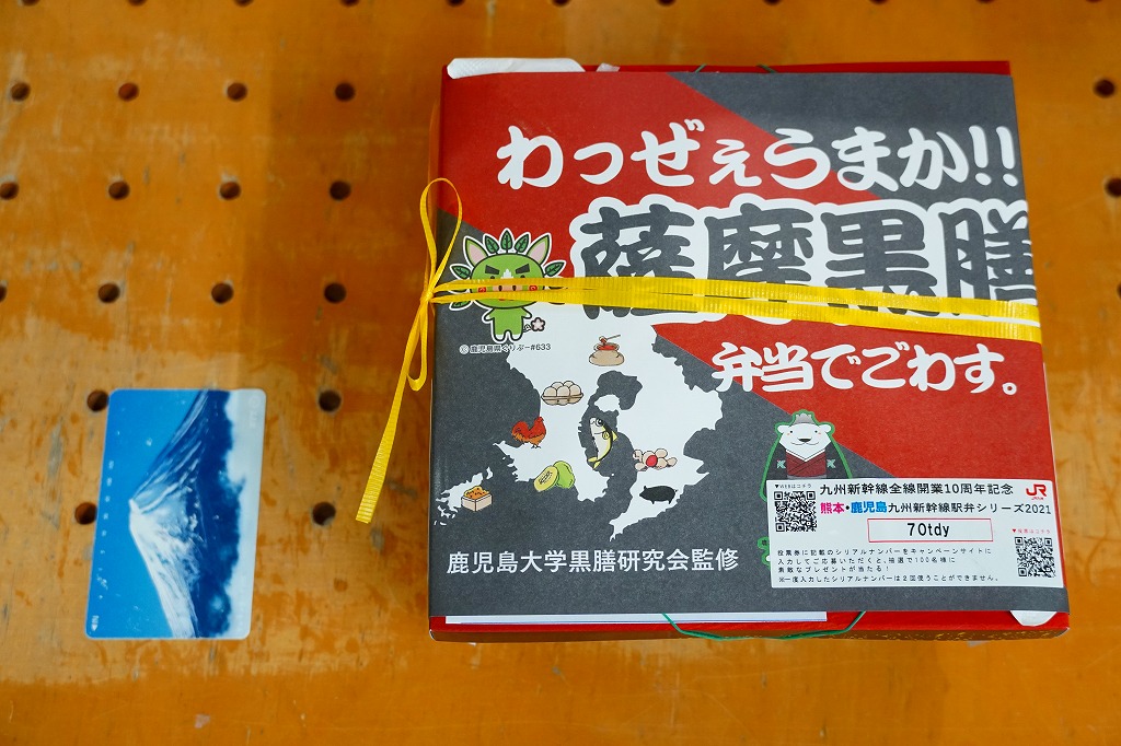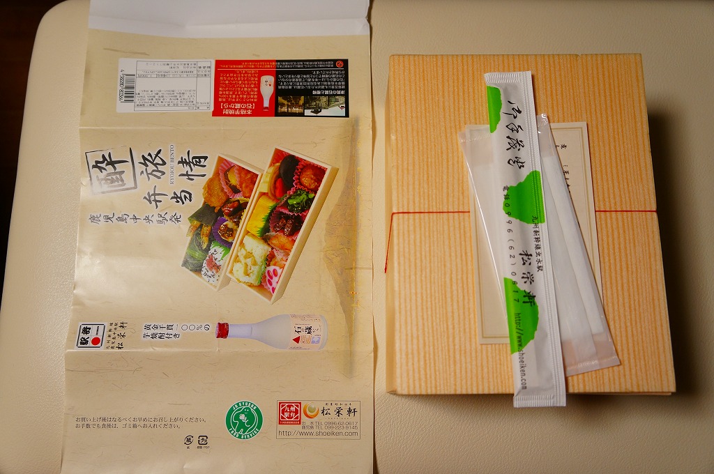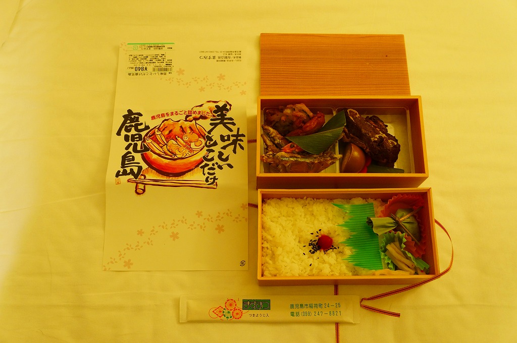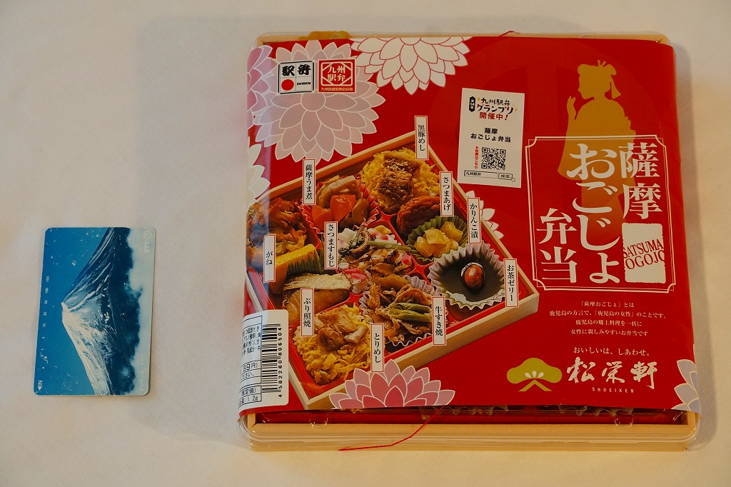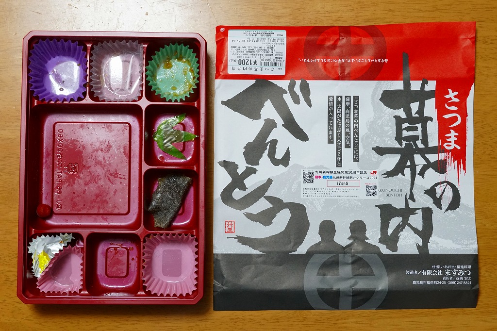 内側が赤く外側が黒い長方形の発泡材製容器を、中身のイラストに牛肉や新幹線の宣伝文を書いたボール紙の枠にはめる。中身はイラストのとおり、御飯の上を鹿児島産曽於(そお)さくら牛のすき焼、錦糸卵と紅生姜と花形ニンジン、鹿児島産黒豚たれ焼で3分の1ずつ覆い、桜島大根といこもちを添えるもの。甘い甘い牛肉と、スッキリした豚肉と、少量も肉の味を生かす御飯と、桜島大根といこもちの組合せが興味深い。価格以外には不満なし。価格は2011年の購入時で1,100円、2014年4月の消費税率改定で1,130円。2014年頃までの販売か。