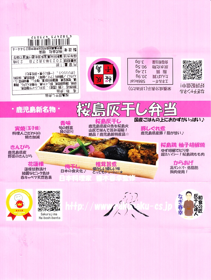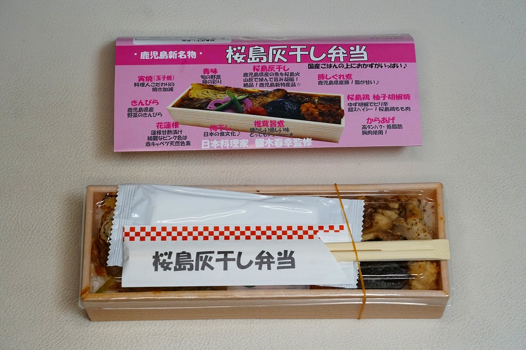 2012(平成24)年9月に鹿児島中央駅で発売。同駅の駅弁売店で、8か月連続で売上ナンバーワンになったそうで、2013年度のJR九州の駅弁キャンペーン「第10回九州駅弁グランプリ」で同着3位を獲得した。小柄でえらく細長い容器に御飯を詰め、桜島の火山灰に食材を挟む「灰干し」加工をしたシイラの塩こうじ焼、「寅焼」なる玉子焼、「ぼっけチビ」なる鶏ゆずこしょう焼、黒豚の塩こうじ焼、きんぴらごぼう、鶏唐揚、シイタケ旨煮、赤キャベツの甘酢漬で覆う。そんな内容は掛紙にて、写真付きでしっかり説明される。このようにいろんなものが載る、他にはないタイプの駅弁である。
