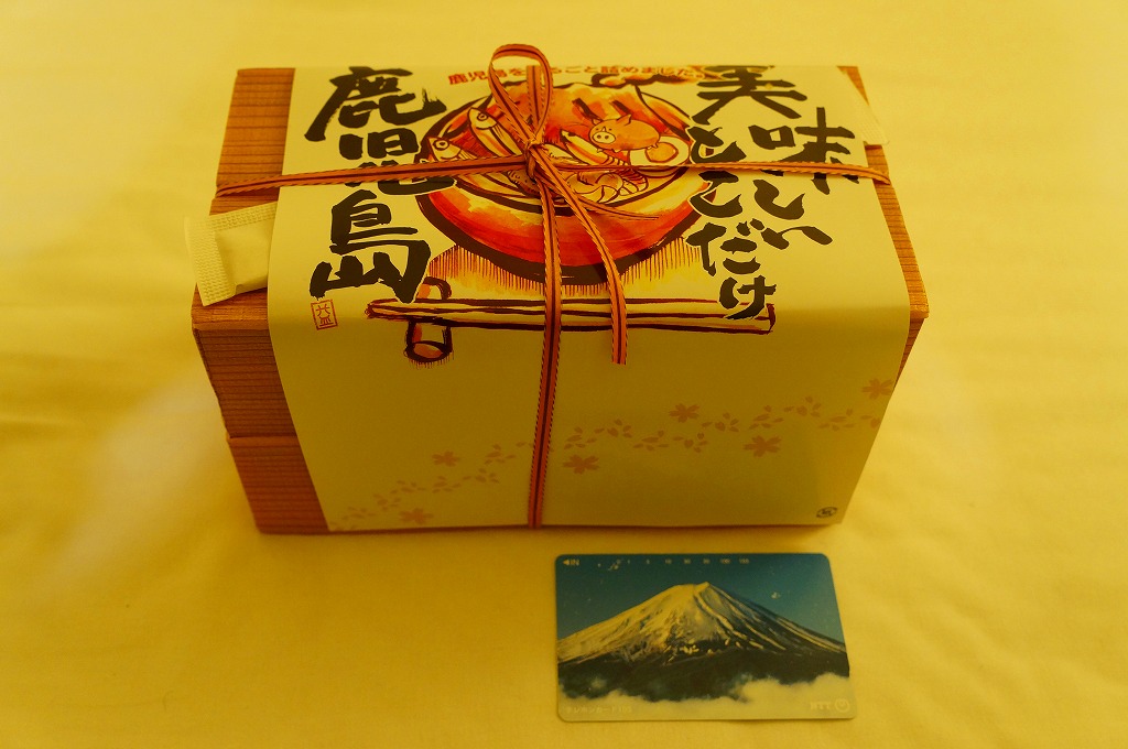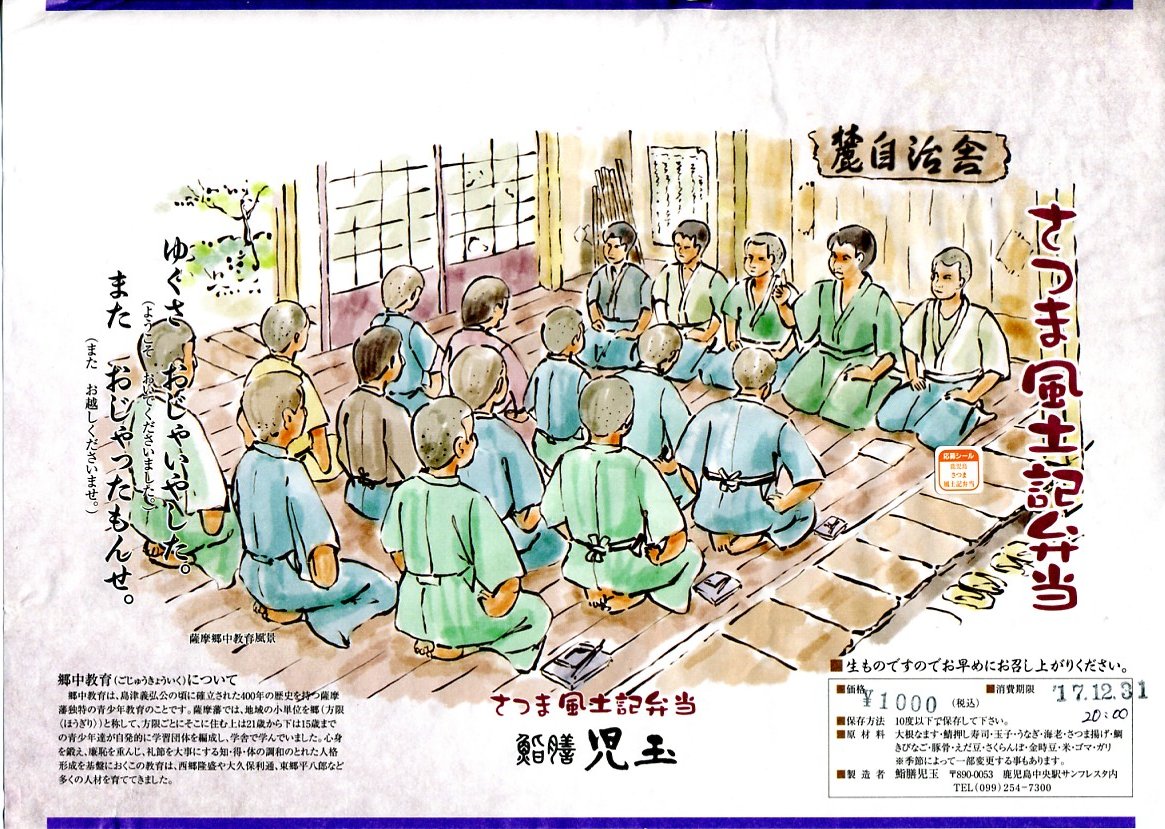 2005(平成17)年の春頃に発売か。フタも本体も黒く細長い容器に、割りばしとおしぼりを乗せて、郷中教育を描いた掛紙で巻いて、ビニールひもでしばる。中身は手前の5区画が御飯物で、左から栗めし・えび押寿司・うなぎ寿司・玉子の握り・サバ押寿司、奥の5区画にはとんこつ・きびなご・薩摩揚などという、多種中量の詰め合わせ。中身の解説は語られないが、自然に鹿児島にこだわった感じをちゃんと受け、鹿児島発着の列車で食べて風味が生きるもの。
