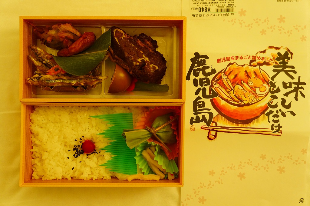 これはもともと、博多駅と西鹿児島駅を結んだ在来線特急「つばめ号」の車内販売用弁当。同じ価格と容器と掛紙で、博多の駅弁屋と鹿児島の業者が競作していたし、当時からそれぞれ博多駅と西鹿児島駅での販売もあったらしい。2004年の九州新幹線部分開業後も同様だが、新幹線つばめ号に車内販売はなく、在来線つばめ号改め「リレーつばめ号」は新八代駅より南に来ないので、鹿児島版は事実上、西鹿児島改め鹿児島中央駅の駅弁となった。