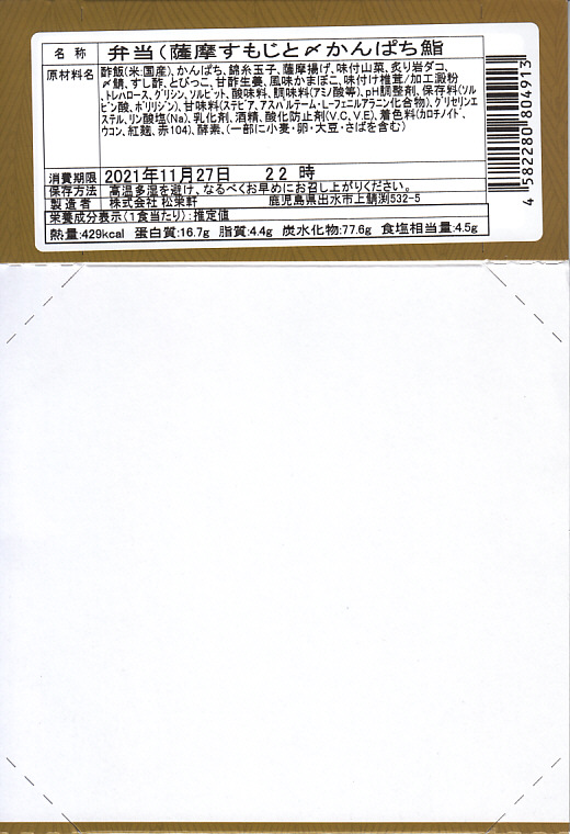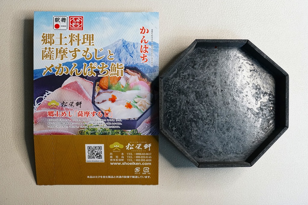 秋冬の駅弁大会シーズンに向けた、2021(令和3)年秋の新商品か。中身と桜島の写真を使うスリーブに収めた正八角形の容器に、酢飯を詰め、とびっこを載せたかんぱちの酢締めと錦糸卵で覆い、薩摩揚げ、かまぼこ、しめさば、タコ、刻みしいたけ煮、ガリを添える。酸味でいただく魚の弁当。催事にしか出てこない、ごくまれにしか出てこない、幻の弁当かもしれない。このシーズンの半年間のみの出荷か。