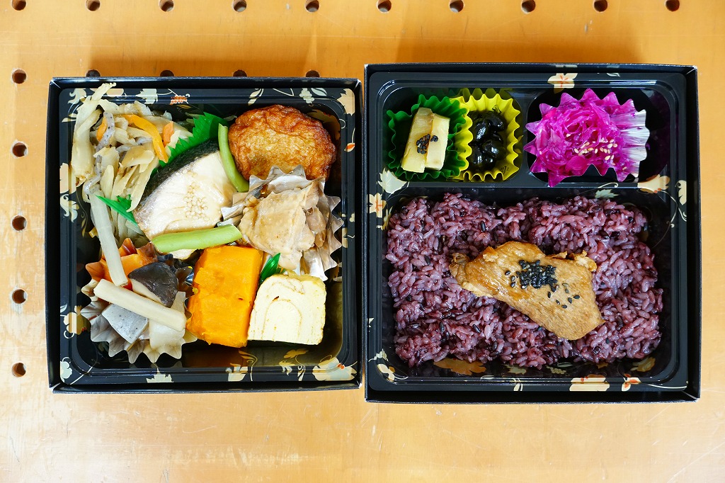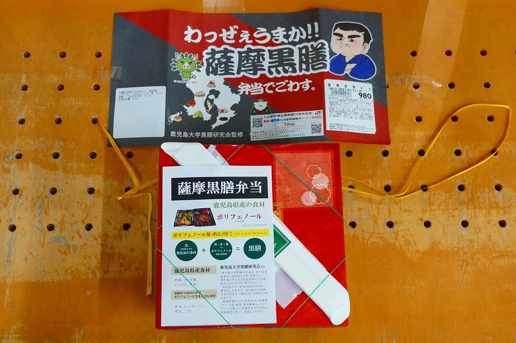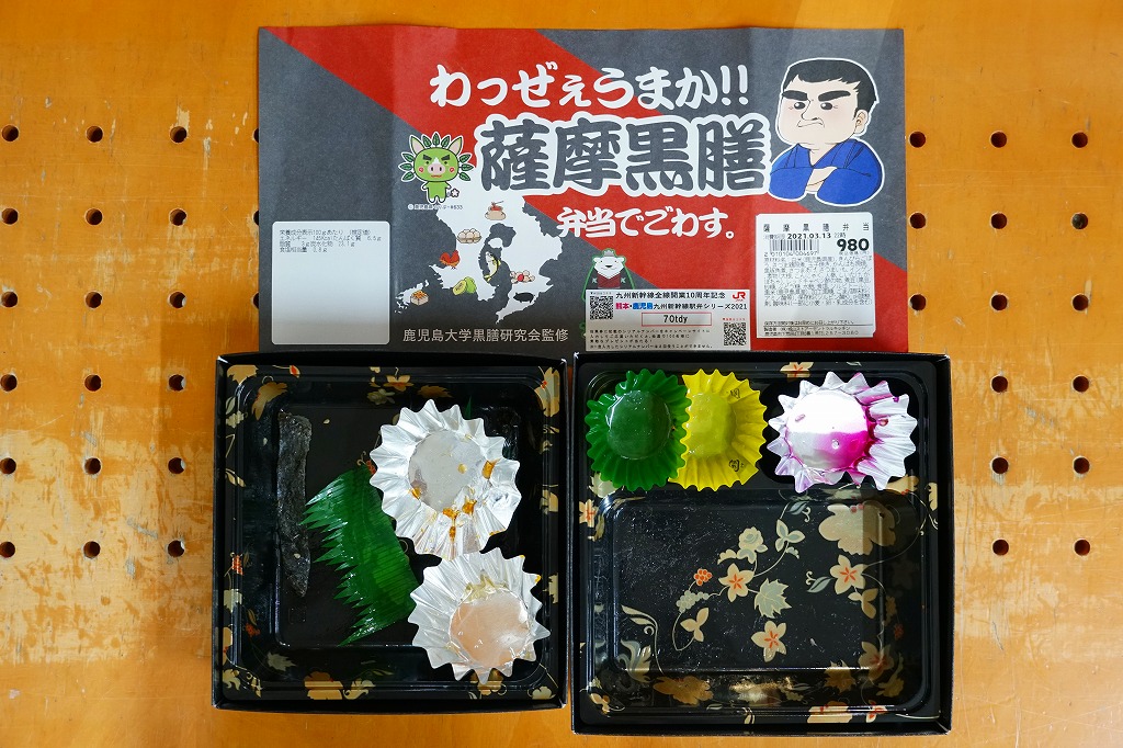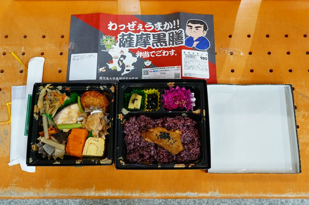 正方形の容器は二段重ね。上段が御飯で、黒米混じりの御飯に黒豚角煮の小片を載せて、黒豆やレッドキャベツ酢の物やサツマイモを添える。下段がおかずで、さつま鶏照煮、かんぱち照焼、さつまあげ、きんぴらごぼう、こんにゃくやしいたけなどの煮物、かぼちゃ、玉子焼など。会が定める黒膳条件に則って、黒を特徴とする鹿児島の食材と、ポリフェノール豊富な黒野菜を組み合わせた。分量の多い惣菜弁当。調製元は鹿児島市内のスーパーマーケットチェーン。価格は2021年の購入時で980円、2023年10月のJR九州の駅弁キャンペーン「第14回九州駅弁グランプリ」エントリー時で、鹿児島中央駅では1,100円、博多駅では1,300円。