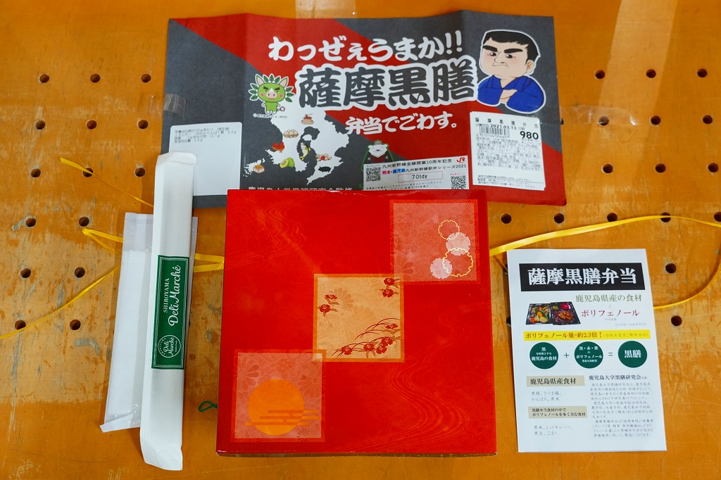 長方形の容器に、黒米混じりの御飯と白飯とひとかたまりずつ詰め、カンパチの照焼、黒豚角煮、さつま鶏照煮、さつまあげ、きんぴらごぼう、こんにゃくやしいたけなどの煮物、玉子焼、レッドキャベツ酢の物などを散らしたり詰める。力強いような、雑然としたようなお弁当。調製元は鹿児島市内のスーパーマーケットチェーン。価格は2021年の購入時で750円、2023年10月のJR九州の駅弁キャンペーン「第14回九州駅弁グランプリ」エントリー時で、鹿児島中央駅では880円、博多駅では1,080円。