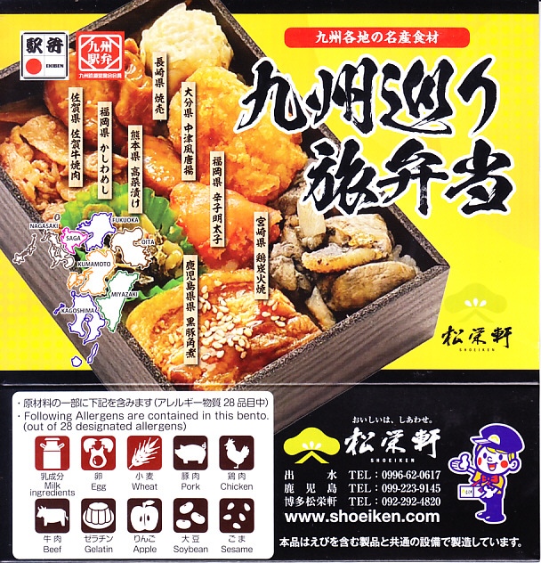 下記の記念駅弁「鉄道開業150年記念九州巡り旅弁当」と同じもの。実際には少なくとも2023年9月までは売られたその記念駅弁と入れ替えて、12月までには鹿児島中央駅で発売か。長方形の容器は黒くなり、掛紙は中身の写真を使うスリーブに変わった。中身は福岡県かしわめしの上を、福岡県辛子明太子、大分県中津風唐揚、長崎県焼売、佐賀県佐賀牛焼肉、熊本県高菜漬け、宮崎県鶏炭火焼、鹿児島県黒豚角煮で覆うもので、表記は変わっても内容は宮崎県以外は変わらない。引き続き雑多な、あるいは賑やかな肉丼。