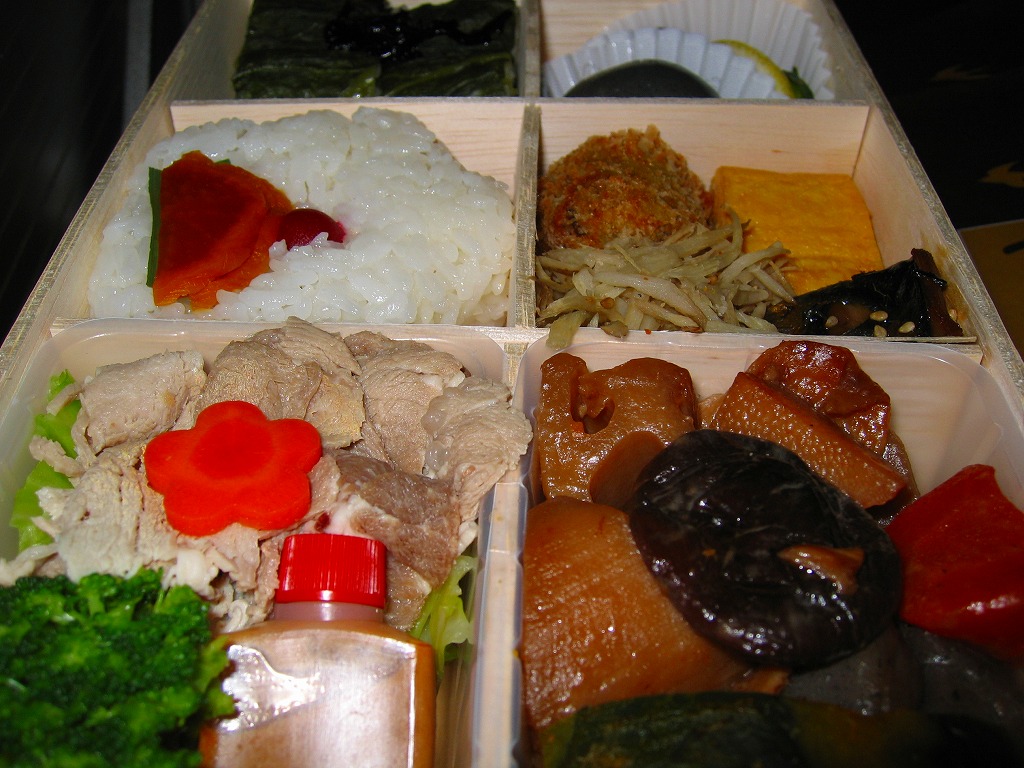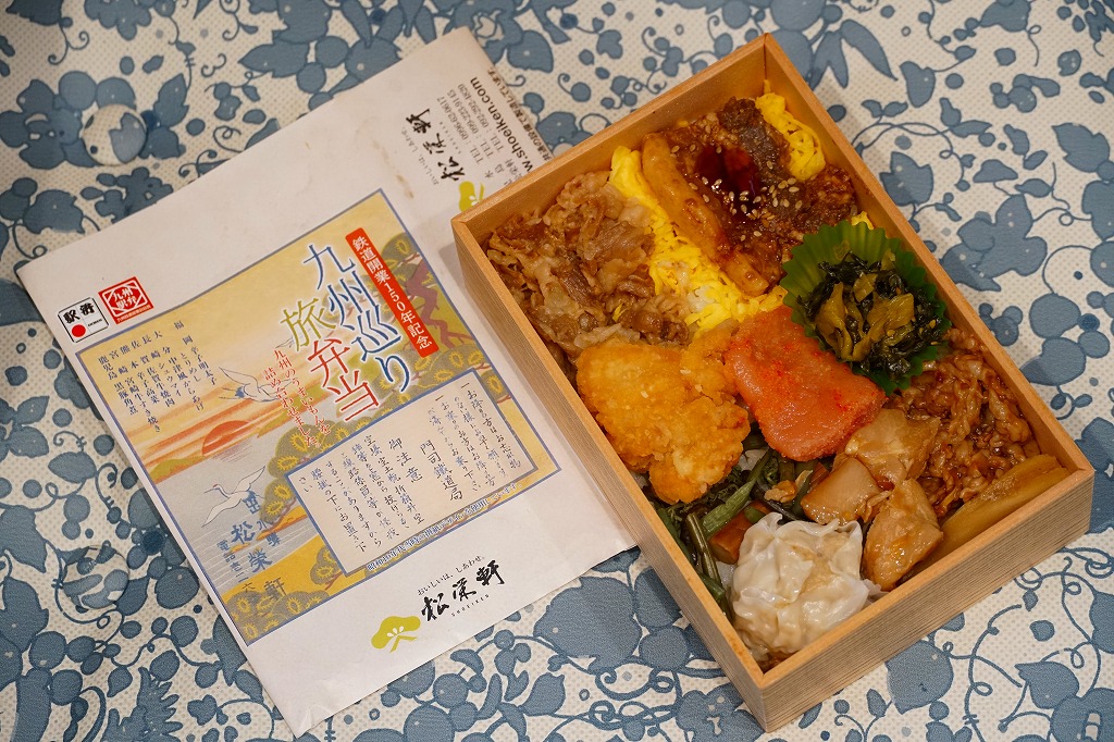 平たく浅い正方形のプラ容器に、九州各地のアイコンとおしながきを印刷した掛紙をかける。中身は博多辛子めんたい、熊本高菜漬け、博多がめ煮、佐賀牛焼肉、大分中津風唐揚、沖縄ゴーヤ、長崎焼売、鹿児島黒豚角煮、熊本あか牛すき焼、宮崎鶏炭火焼と記される。玉子焼、焼サバ、焼売、サツマイモも入る。お肉が強くて優勢な、忙しいお弁当。容器がコンビニ弁当並みに薄いので、分量は見た目ほどでない。味もそんなに効いてない。