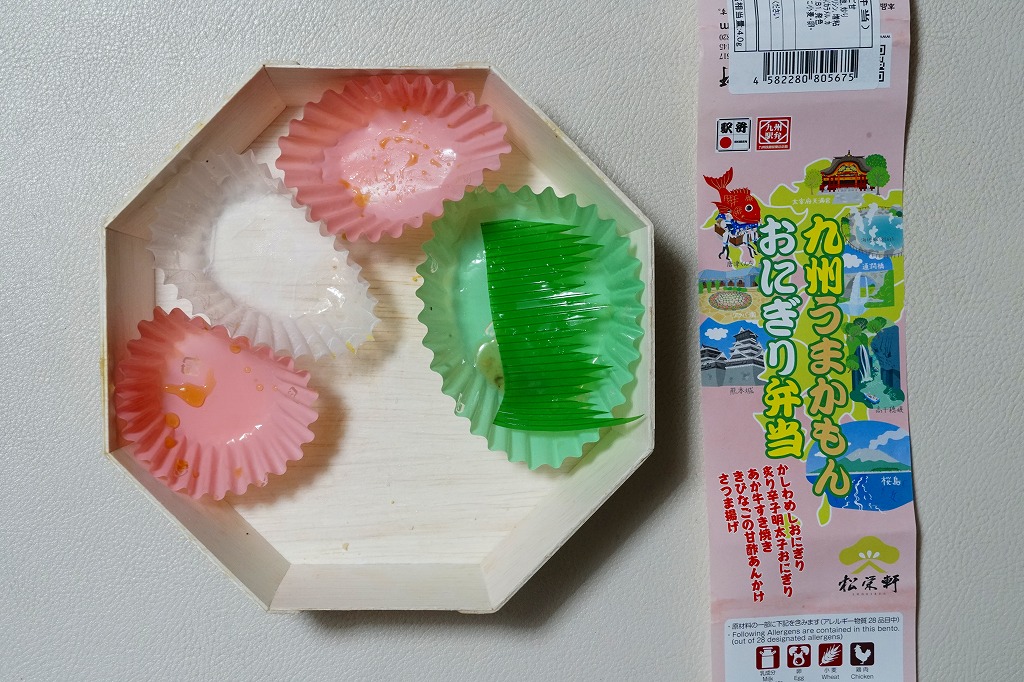 ふたが透明で中身が見える正八角形の容器を留める紙帯には、九州各地の名所のイラストが8点描かれる。中身はかしわめしおにぎり、炙り辛子明太子おにぎり、「あか牛すき焼き」でなく熊本あか牛しぐれ煮、中津唐揚げ、きびなごの甘酢あんかけ、さつま揚げで、九州各県の名産を味わえるものとしたという。調製元にとっての九州、自社の駅弁の出荷先が、雑然と詰められたような印象。