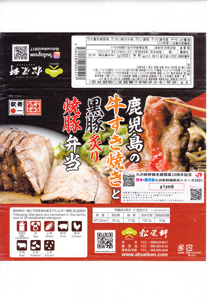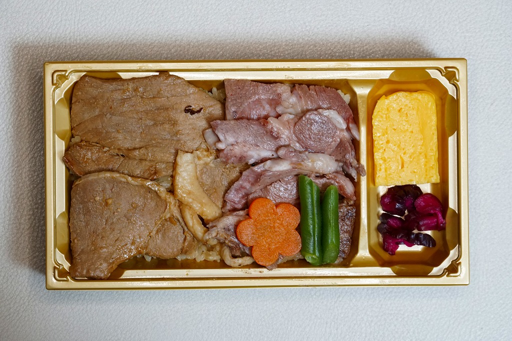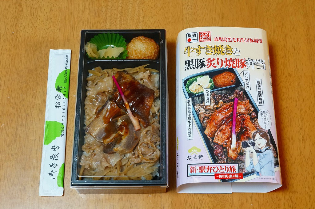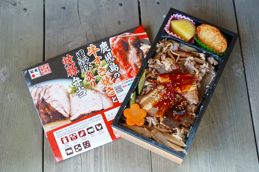2021(令和3)年2月の発売か。3月のJR九州の駅弁キャンペーン「熊本・鹿児島 九州新幹線駅弁シリーズ2021」にエントリー。おそらく前月に京王と阪神の駅弁大会で実演販売された、下記の駅弁「鹿児島黒毛和牛黒豚競演牛すき焼きと黒豚炙り焼豚弁当」の、漫画作品「新・駅弁ひとり旅」タイアップを外し、掛紙を替えて名前を変えて、値段を300円も下げたものだろう。白飯を焼豚と牛肉煮とごぼうで覆い、花人参といんげんで彩り、さつま揚げとサツマイモを添える内容と、肉の固さはほとんど同じ。約1年で終売か。