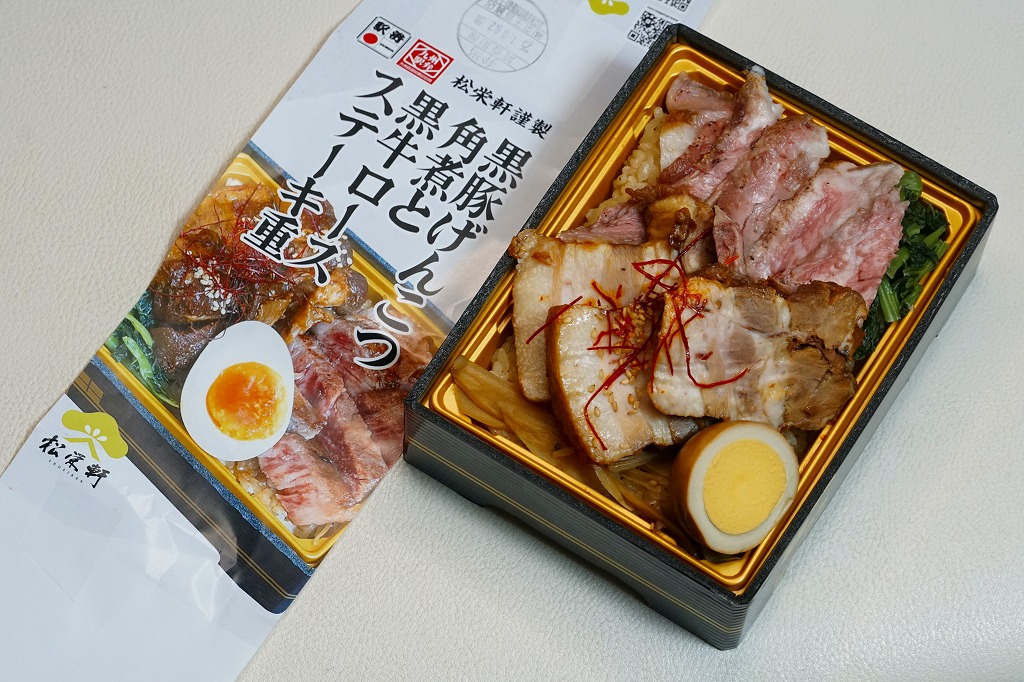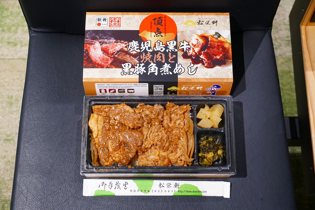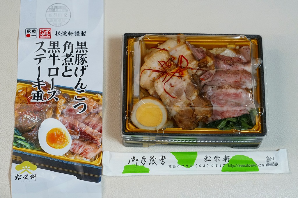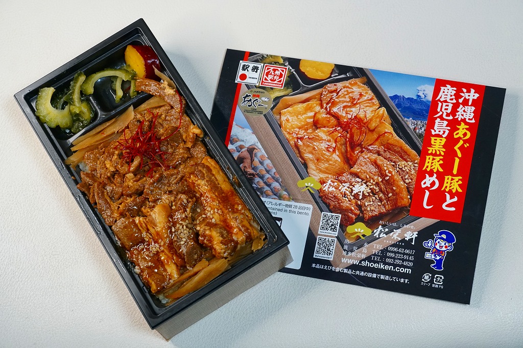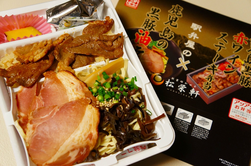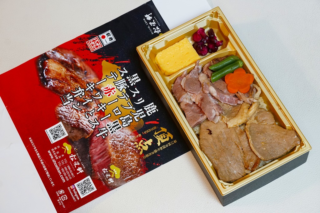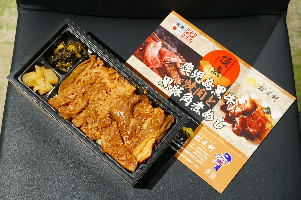 2025(令和7)年1月の京王百貨店の駅弁大会で実演販売。透明なふたを上げて盛る催事向けのプラ容器に茶飯を敷き、黒豚げんこつ角煮と黒牛ロースステーキを盛り、煮玉子とささがきごぼうと高菜炒めを添えた。掛紙の写真でも現物でも、牛や豚の脂身がおいしそうに浮き出て、食べても柔らかく、値段に追い着く肉の味。今後に催事場での実演販売でない場所へ出てくるかどうか。そういえば駅弁の名前に「鹿児島」が付いていない。