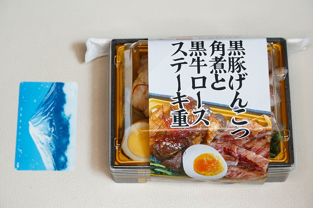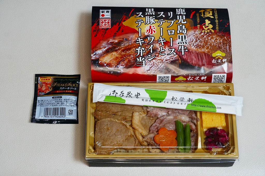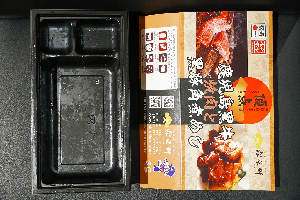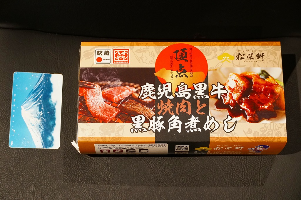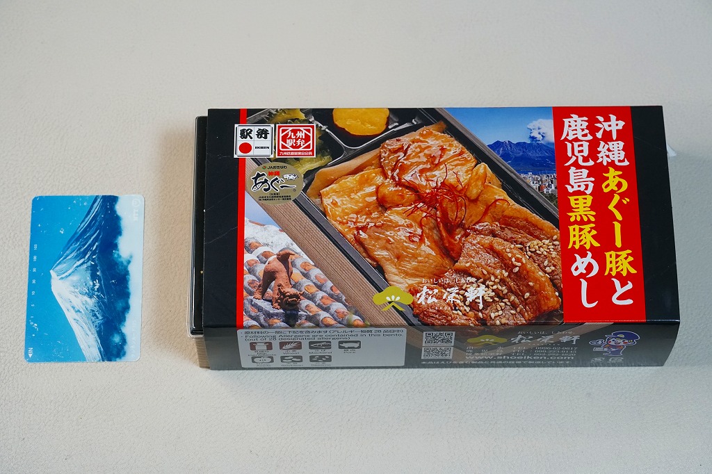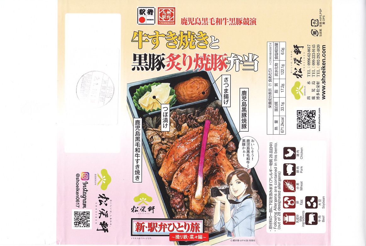 2025(令和7)年1月の京王百貨店の駅弁大会で実演販売。透明なふたを上げて盛る催事向けのプラ容器に茶飯を敷き、黒豚げんこつ角煮と黒牛ロースステーキを盛り、煮玉子とささがきごぼうと高菜炒めを添えた。掛紙の写真でも現物でも、牛や豚の脂身がおいしそうに浮き出て、食べても柔らかく、値段に追い着く肉の味。今後に催事場での実演販売でない場所へ出てくるかどうか。そういえば駅弁の名前に「鹿児島」が付いていない。
