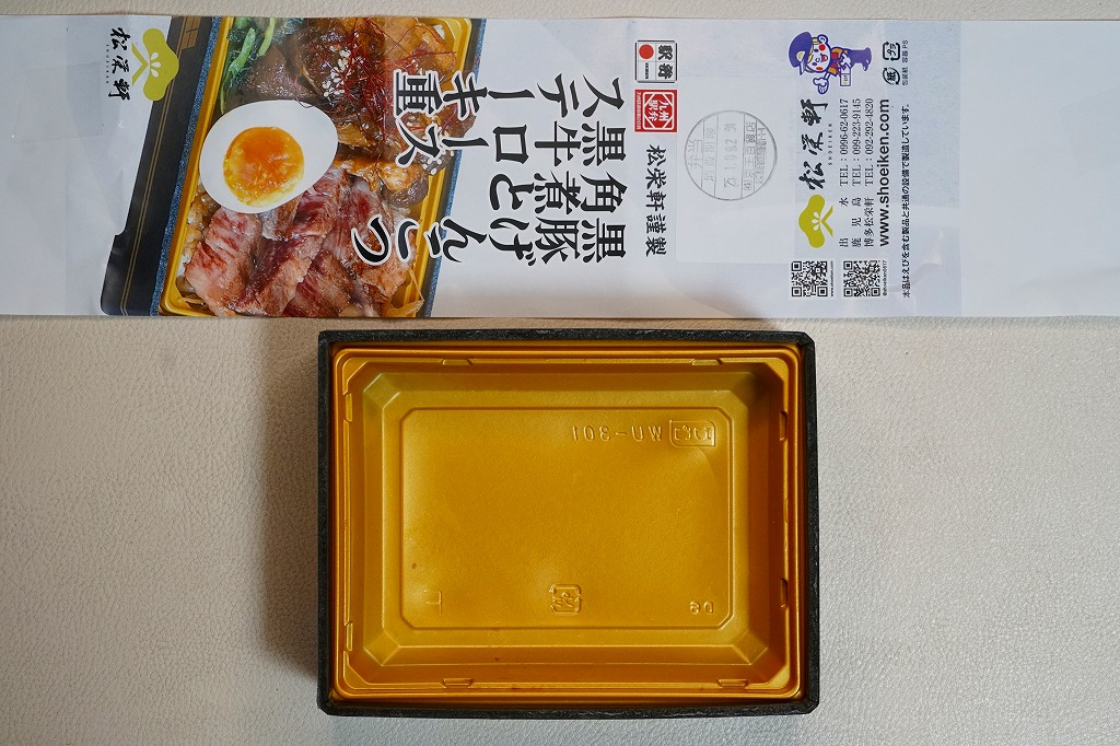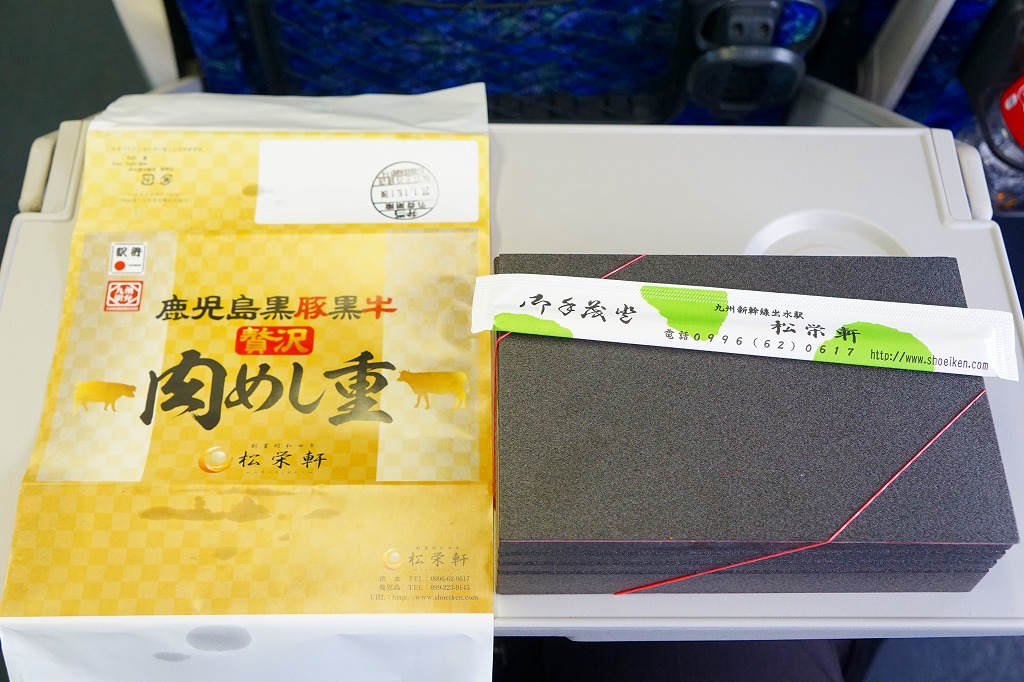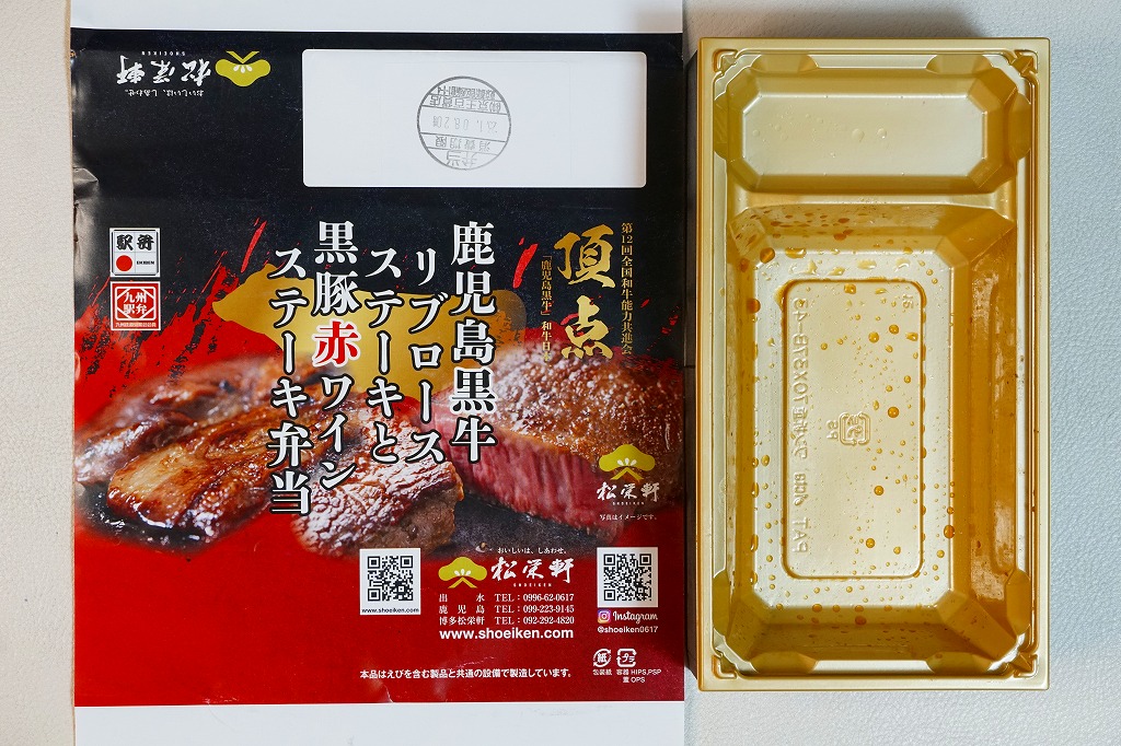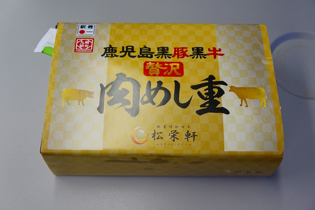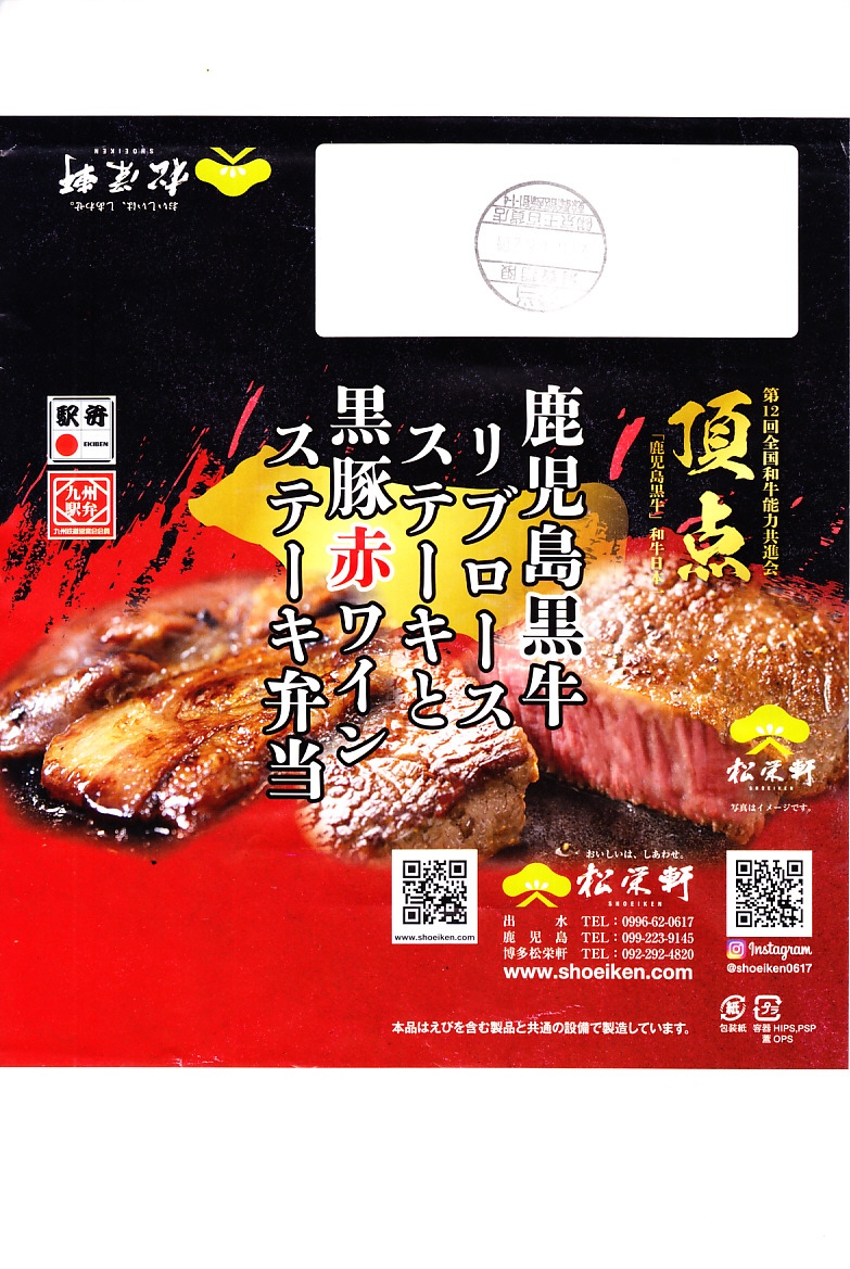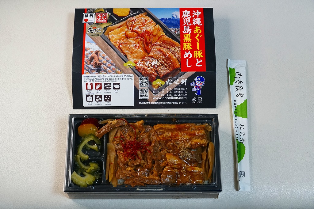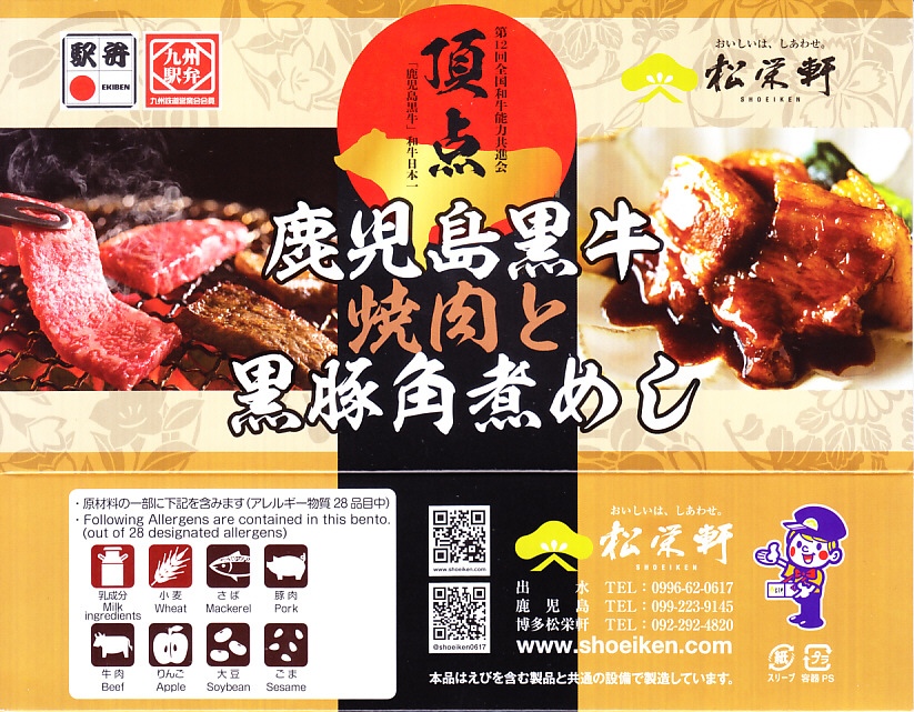 2025(令和7)年1月の京王百貨店の駅弁大会で実演販売。透明なふたを上げて盛る催事向けのプラ容器に茶飯を敷き、黒豚げんこつ角煮と黒牛ロースステーキを盛り、煮玉子とささがきごぼうと高菜炒めを添えた。掛紙の写真でも現物でも、牛や豚の脂身がおいしそうに浮き出て、食べても柔らかく、値段に追い着く肉の味。今後に催事場での実演販売でない場所へ出てくるかどうか。そういえば駅弁の名前に「鹿児島」が付いていない。