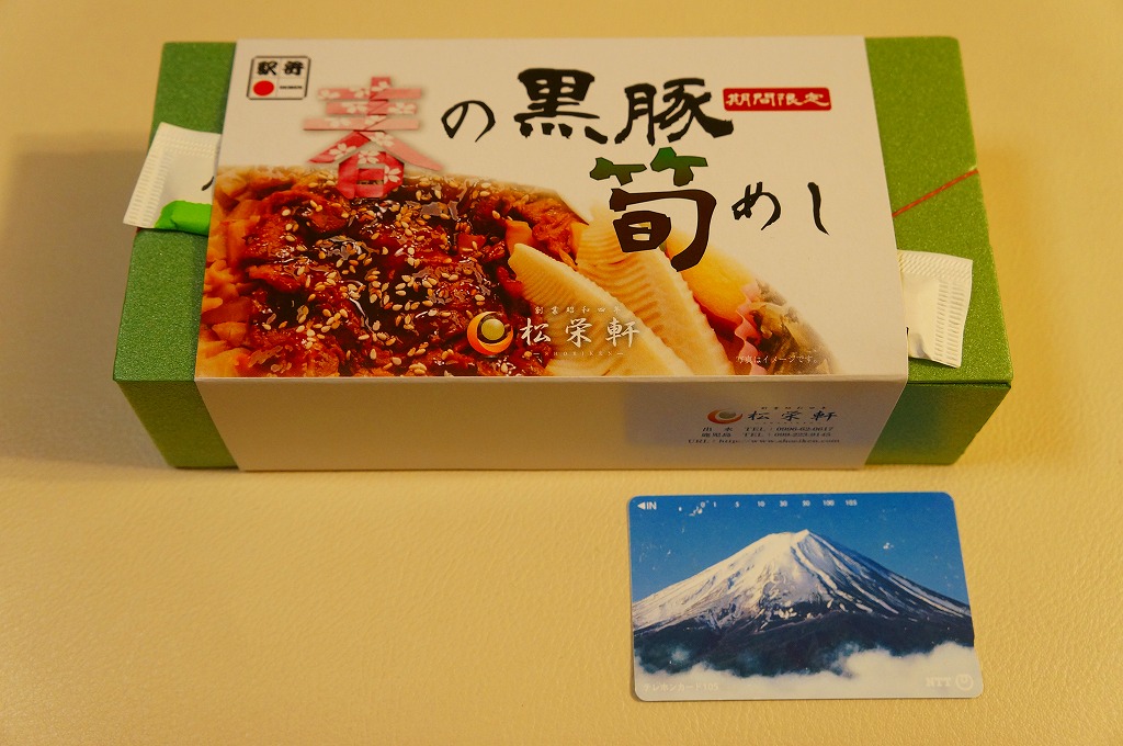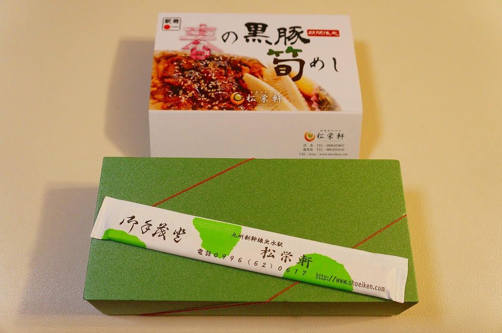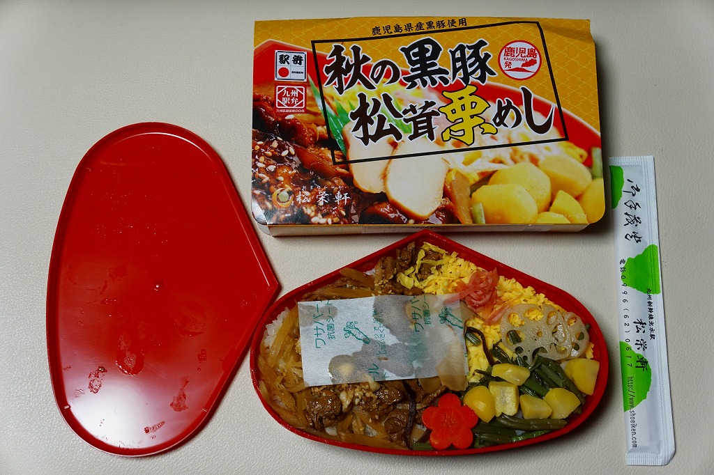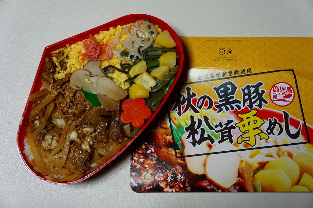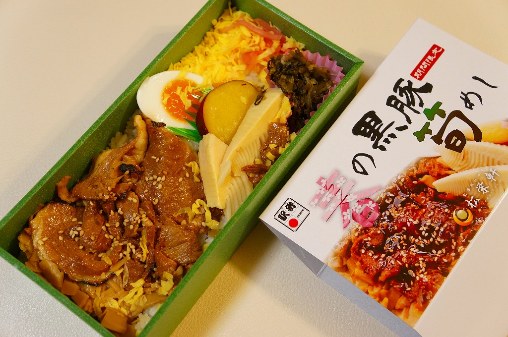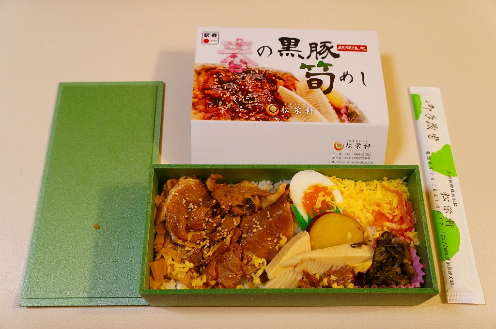 2014(平成26)年1月の発売か。抹茶色の容器に味付飯を詰め、半分を黒豚たれ焼き、半分を錦糸卵、タケノコ、煮玉子、サツマイモのレモン煮、高菜漬、紅生姜で覆う。豚肉の分量がおかずに不足するも、鹿児島をしていると思う商品。主に駅弁催事かもしれないが、1月から5月頃か、駅弁大会シーズンが終わるまでの販売。2016年に「春収穫 黒豚筍めし」へリニューアルし、容器の色を変え、ミニ大福を加えた模様。
