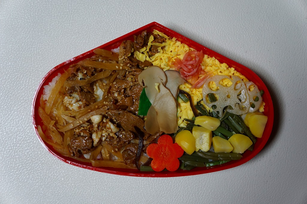 確かに肉たっぷり。でも肉しかなく、食べ飽きそうな感じ。狭い催事場での実演販売に向いていたと思う。今回の駅弁大会を放送したテレビ番組で、この駅弁の開発の過程が放送された。百貨店バイヤーがダメ出しした試作品には錦糸卵が入っており、そのほうが彩りを出して食感を和らげて、良かったかもしれない。後に肉へごぼう煮を混ぜたり、錦糸卵で仕切って付合せも加えた「春の」バージョンを出したりしている。2019年までの販売か。