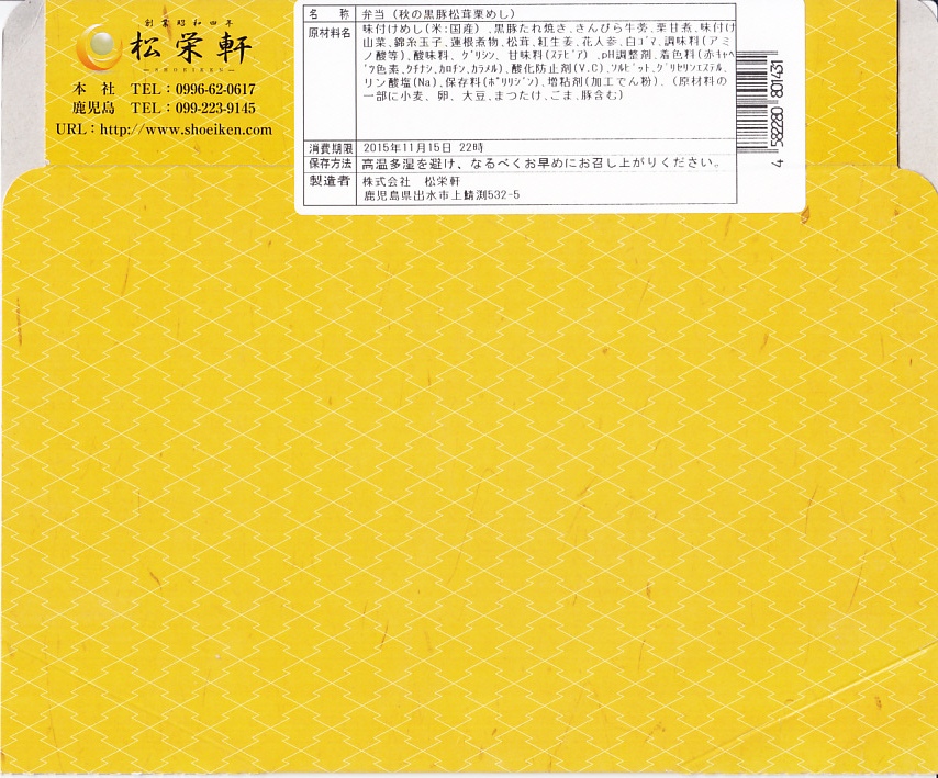 2013年秋の発売か。出水駅の駅弁を名乗り、調製元の公式ブログにもそう掲載されるが、実態は駅弁大会向け商品なのか、収穫報告は首都圏などのスーパーの駅弁大会ばかり。現地では事前に情報を得て予約しない限り見られないものではないかと思う。