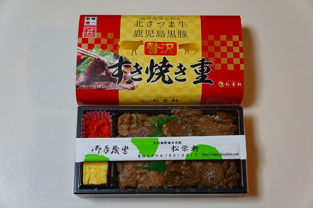 2016(平成28)年1月の京王百貨店の駅弁大会で、催事の目玉の駅弁対決の三番手として、実演販売で発売。白御飯を北さつま牛の牛肉と鹿児島黒豚の豚肉の、すき焼きというよりはむしろ焼肉で覆い、玉子焼と紅生姜を添える。他の出水駅や鹿児島中央駅の同じような駅弁と、雰囲気は特に変わらない。この駅や駅弁屋の、同じような中身と味で毎年のように新作を出してくる賑わいや意欲と、「えびめし」と違い肉の定番商品が生まれないもどかしさがある。事実上の京王百貨店駅弁大会限定販売。一応は翌月までの販売か。