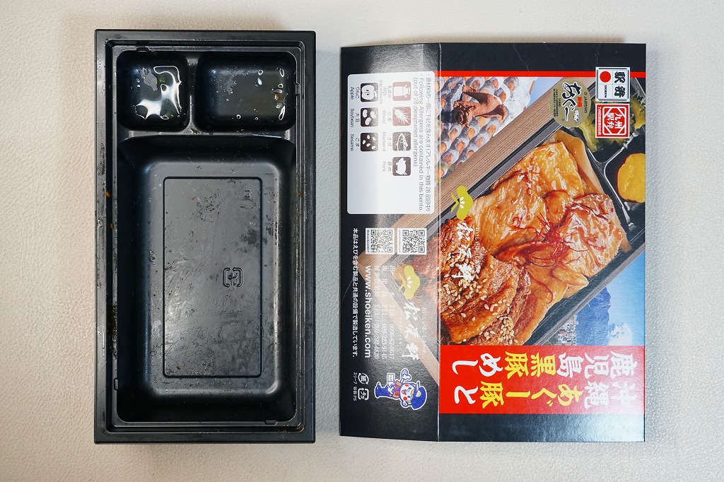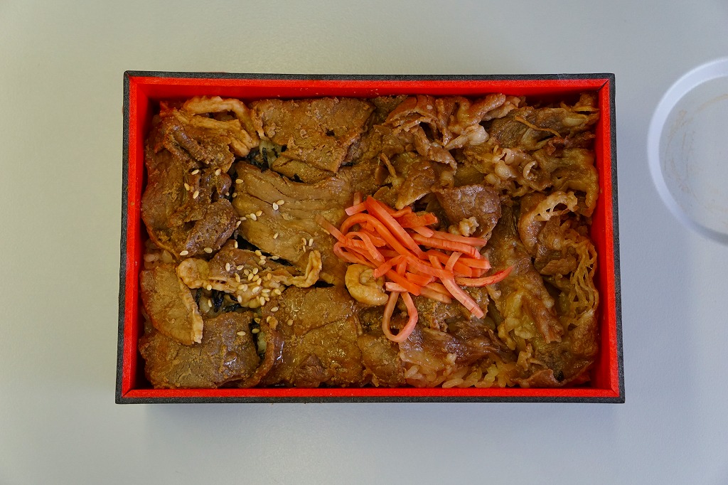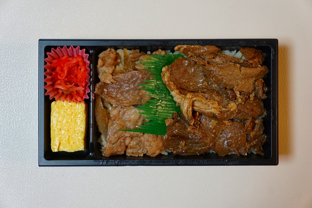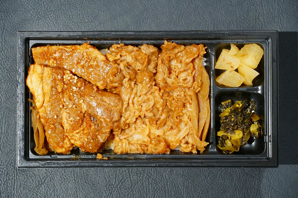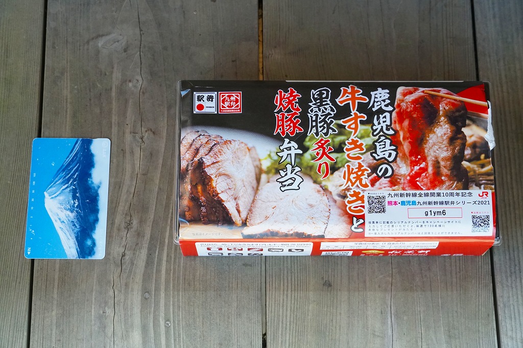 秋冬の駅弁大会シーズンに向けた、2023(令和5)年秋の新商品か。長方形のプラ容器に白飯を詰め、鹿児島黒牛の焼肉と黒豚の角煮で半分ずつ覆い、きんぴらごぼうも加えて、かりんこ漬けと高菜漬けを添える。甘い味付けのお肉がたっぷり入る、肉と茶色の強いお弁当。2024年秋には名前を「牛焼肉と黒豚角煮めし」に変え、1,280円で催事向け輸送販売を継続か。