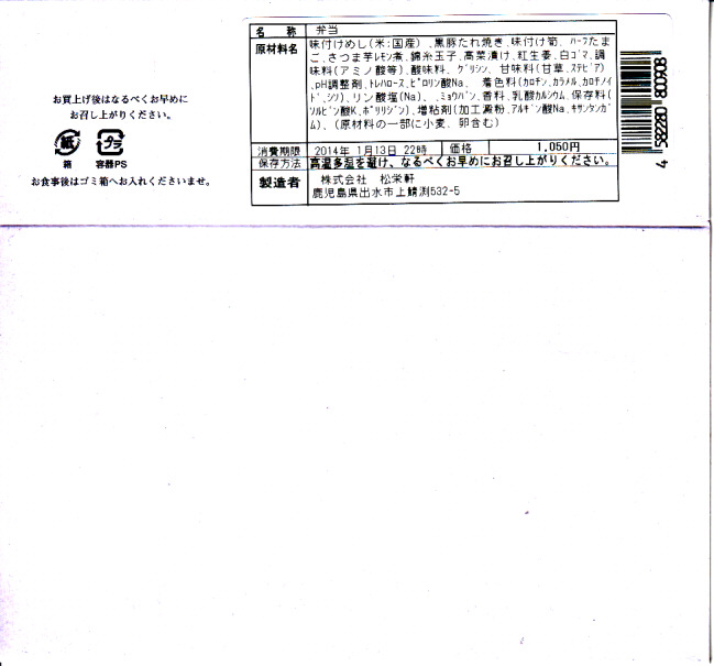 これは失敗。ウナギはグミの食感で、豚肉はなぜか酸っぱい。もしこれらのメインの味が無難でも、鹿児島やそもそも日本でないナムルや、この調製元の駅弁でよく使われるレモン味のサツマイモが、この内容にミスマッチ。出水や鹿児島の現地では経験のない粗製濫造品に、がっかりした。2018年までの販売か。