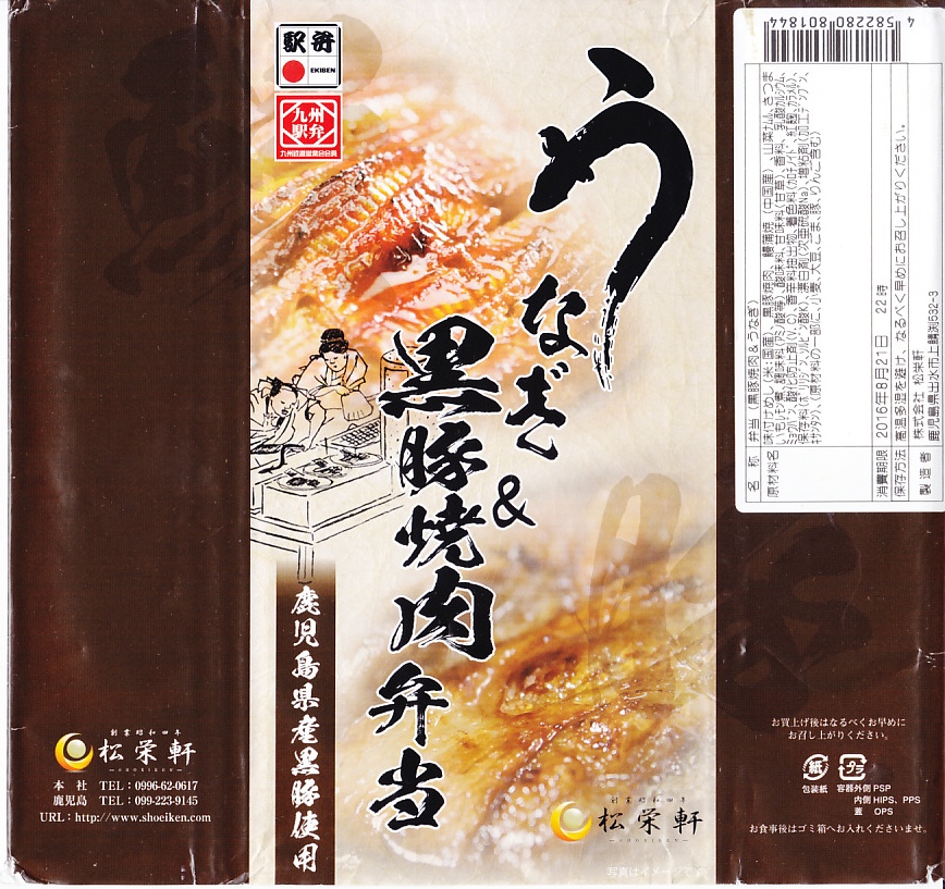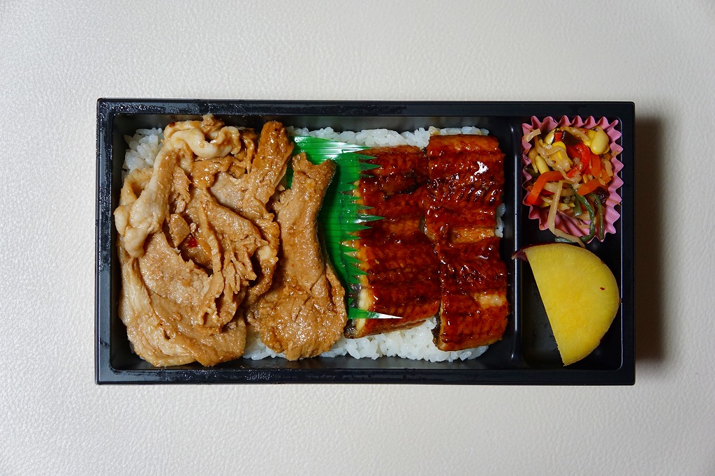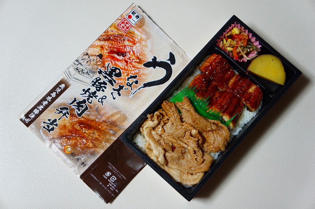 2016(平成28)年7月に東京駅の駅弁売店「駅弁屋 祭」でデビューか。掛紙の写真も中身も、駅弁の名前のとおり、白御飯にウナギの蒲焼きと黒豚の焼肉を載せて、サツマイモと山菜ナムルを添えたもの。